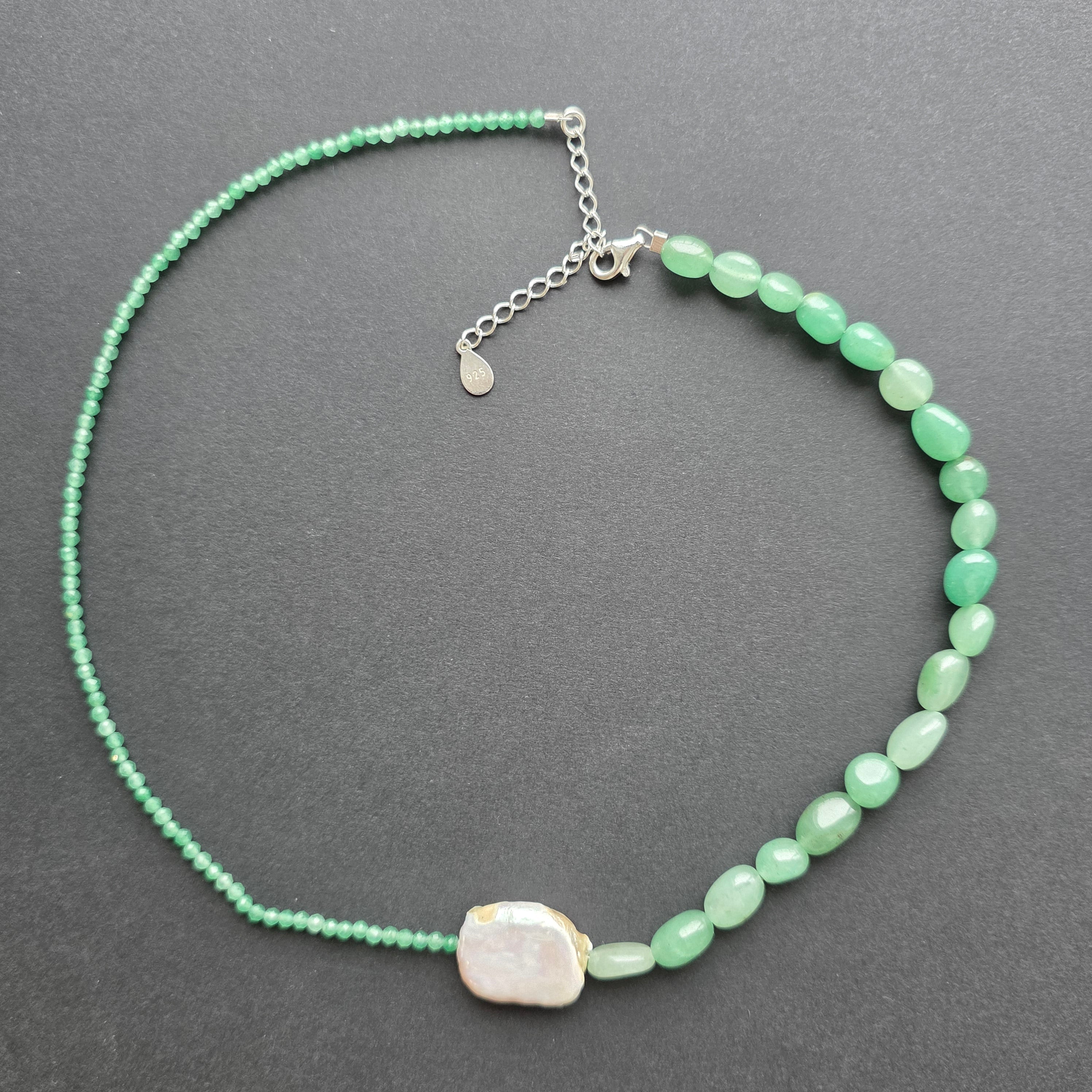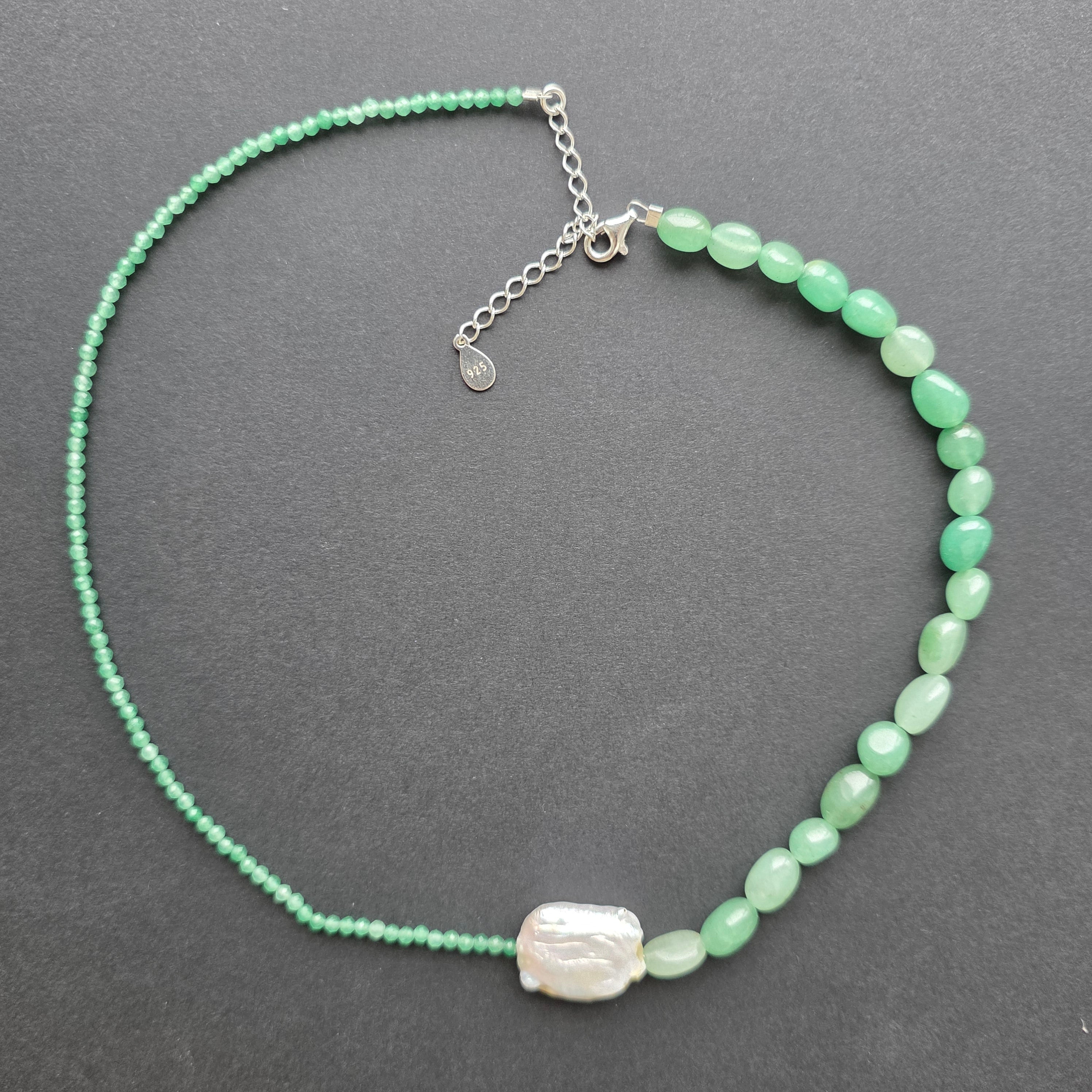 Materiale: aventurin verde natural, mărgele tumble 6 × 4 mm, sfere fațetate 2 mm, perlă naturală 2 cm, argint 925