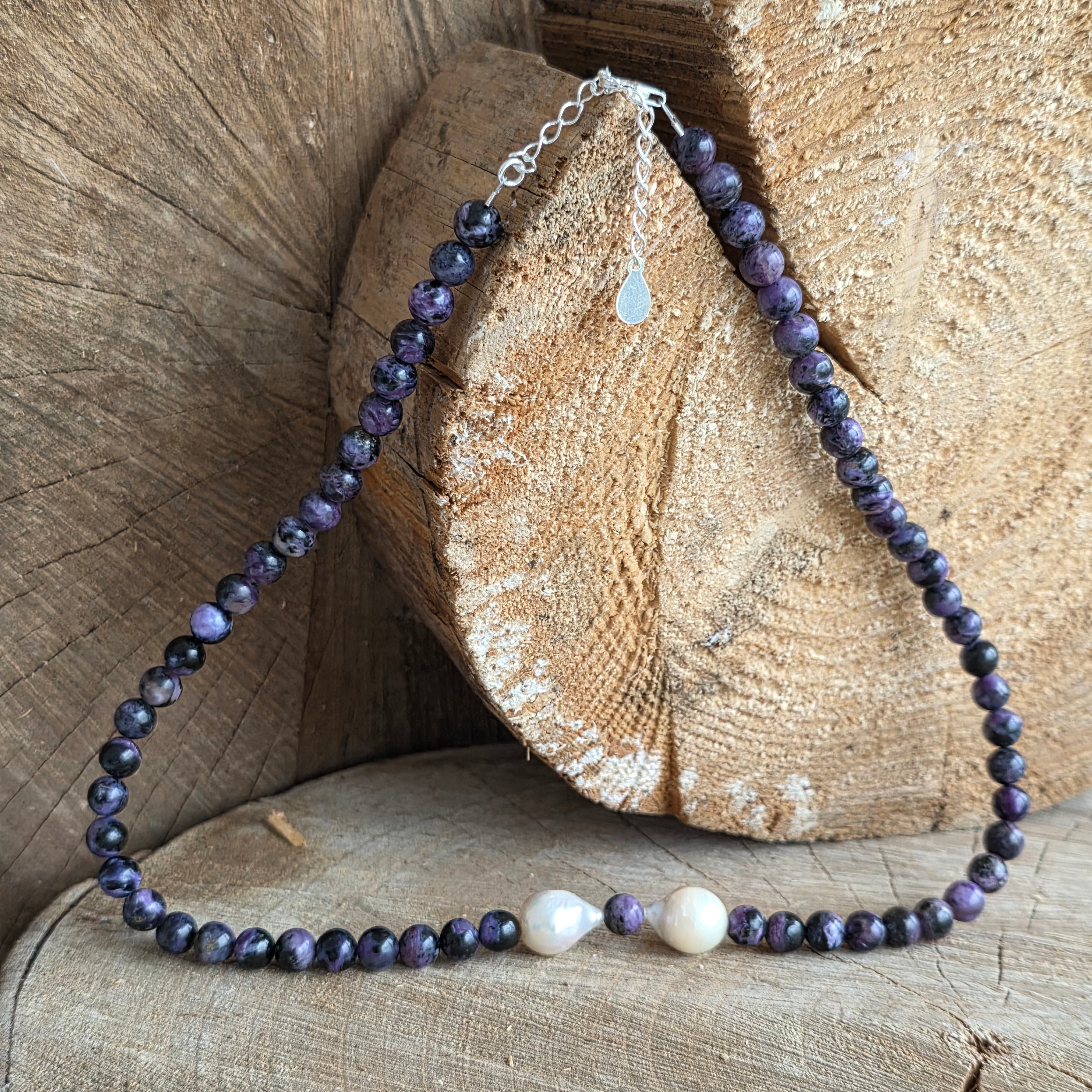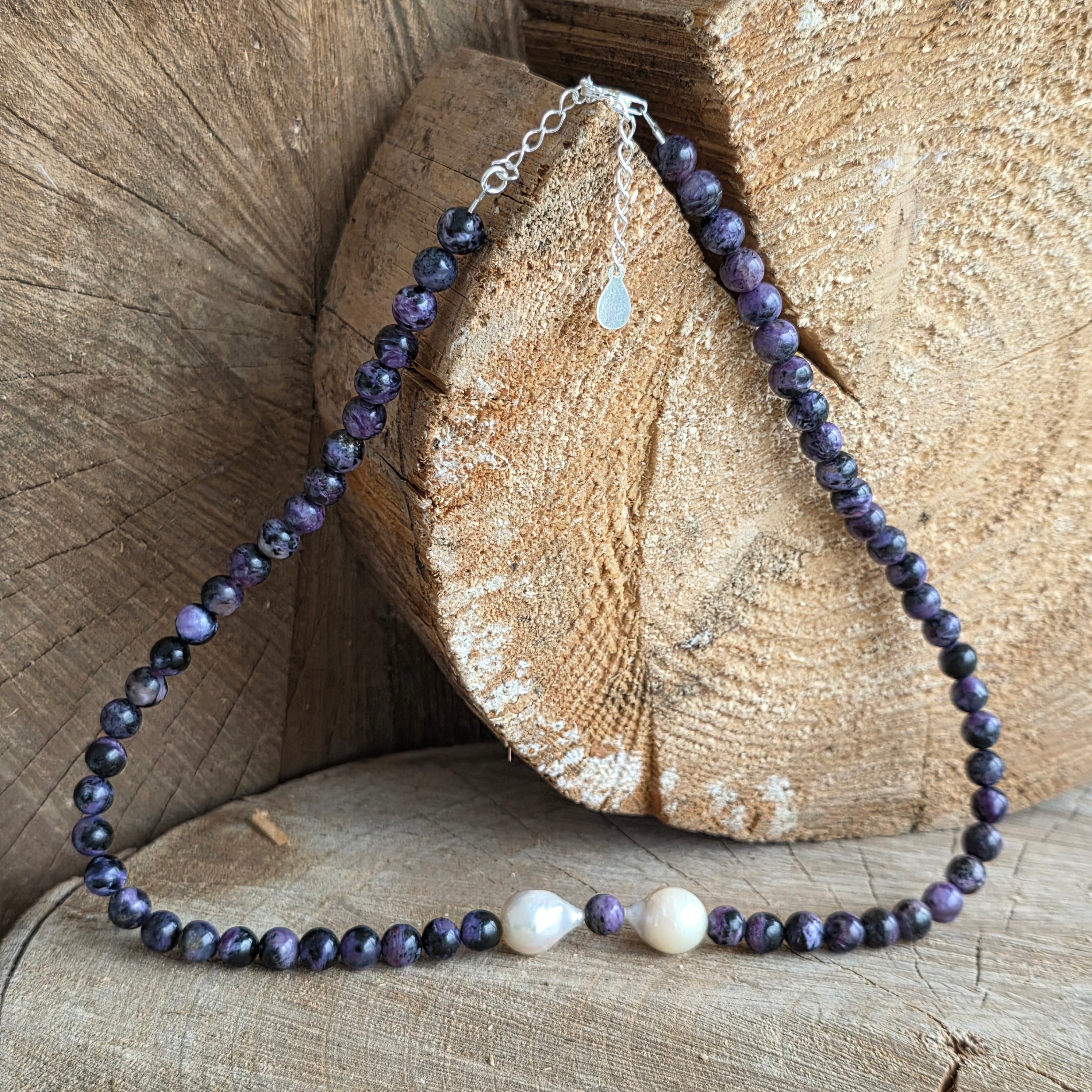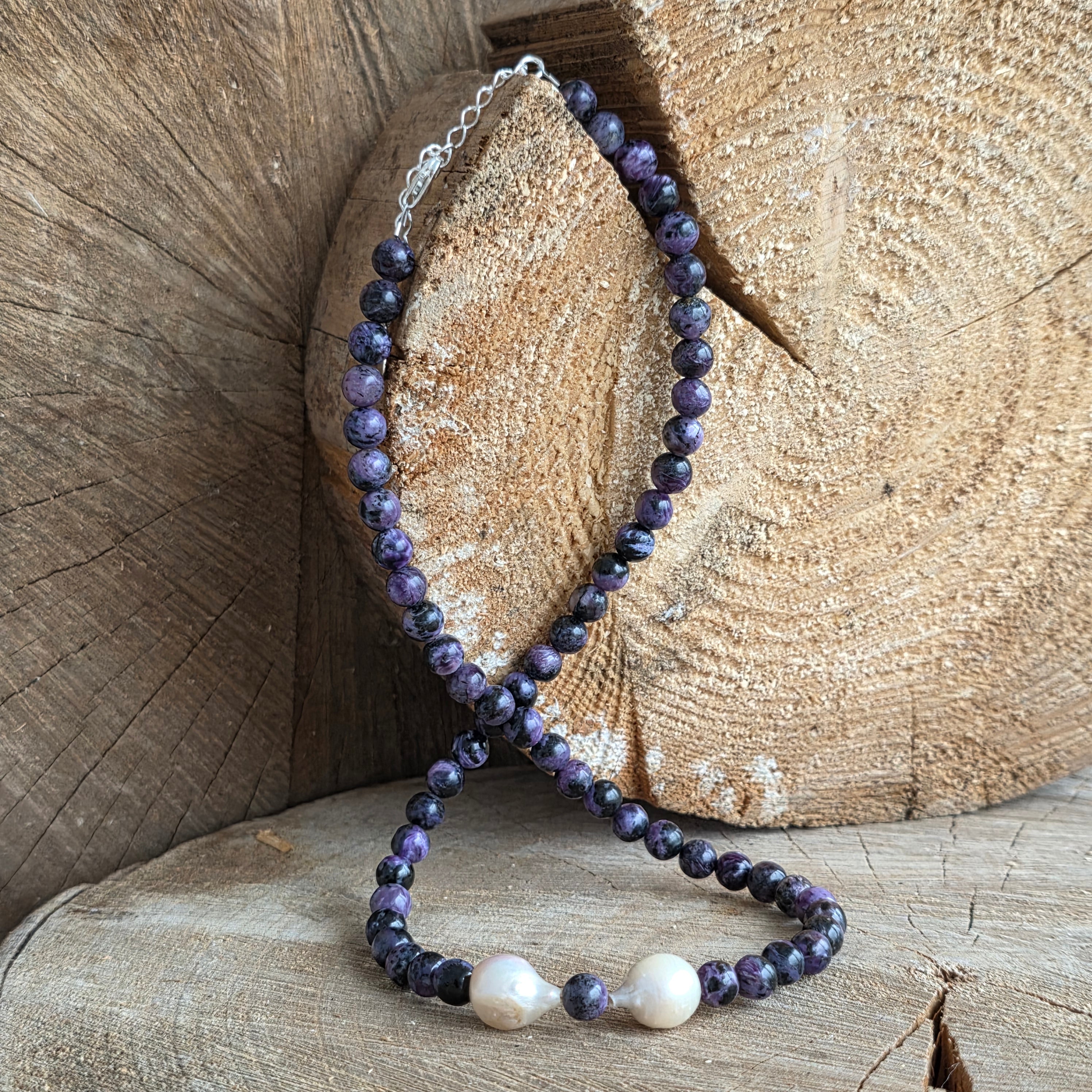 Un colier cu prezență calmă și profundă, realizat din sfere de charoit de 6 mm, ale căror nuanțe de mov, violet și alb lăptos par să curgă unele în altele asemenea unui peisaj interior. Fiecare piatră poartă un desen unic, ca o amprentă a transformării și a înțelegerii profunde.