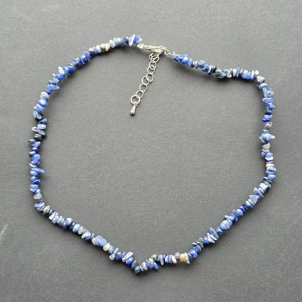 Colier creat din sodalit natural, apreciat pentru albastrul său profund, presărat cu fire albe ce imită adesea textura norilor pe cerul nopții. Chipsurile neregulate, cu aspect organic, conferă piesei un aer boem și autentic, perfect pentru iubitorii de cristale naturale și designuri neșlefuite excesiv.