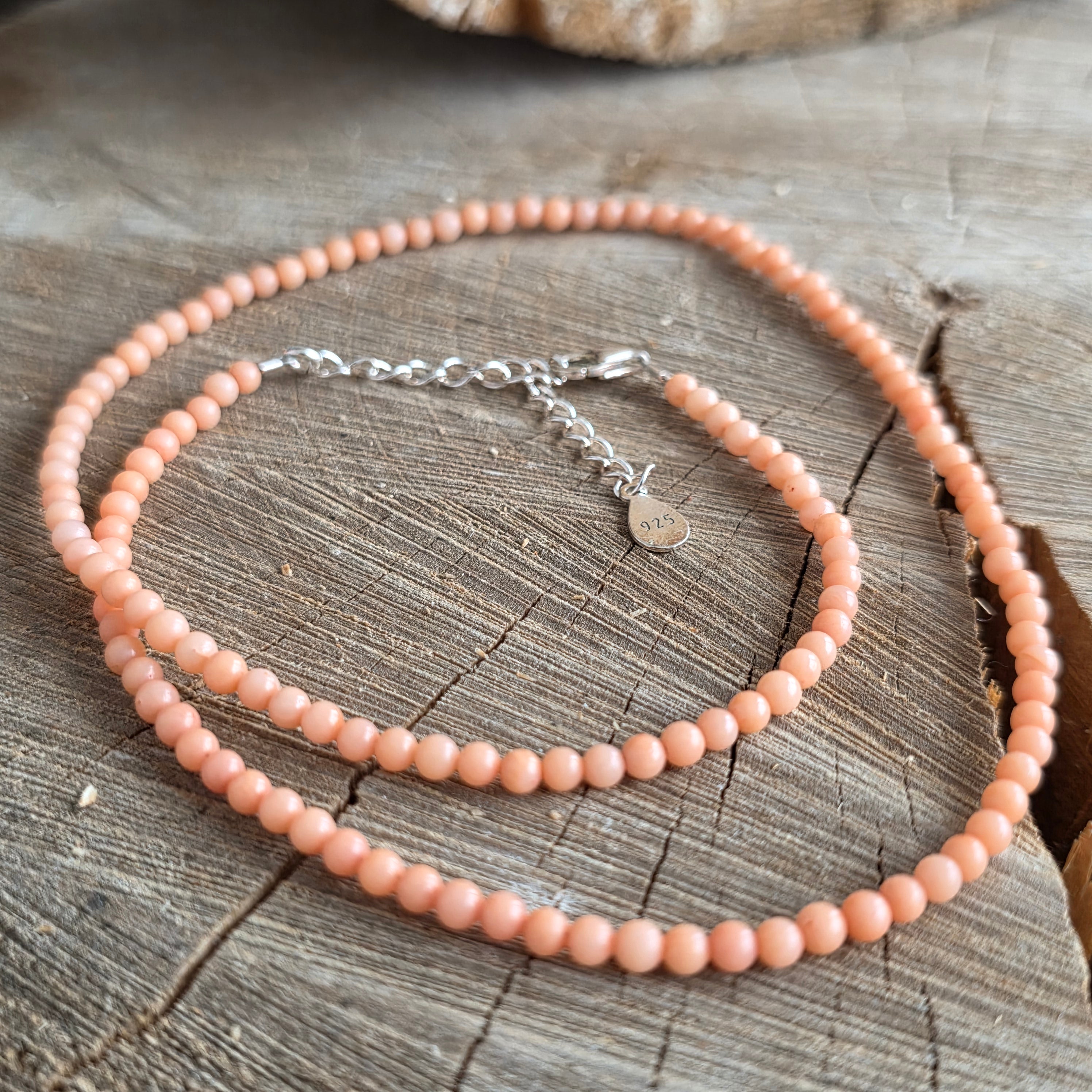 A necklace like a firing from the depths - fine, ginger and with a warm, almost nostalgic vibration. The pink coral, polished in 3 mm diaphanous spheres, dances along the thread as a forgotten memory of the sea, with all its stories about life, rebirth and love.
