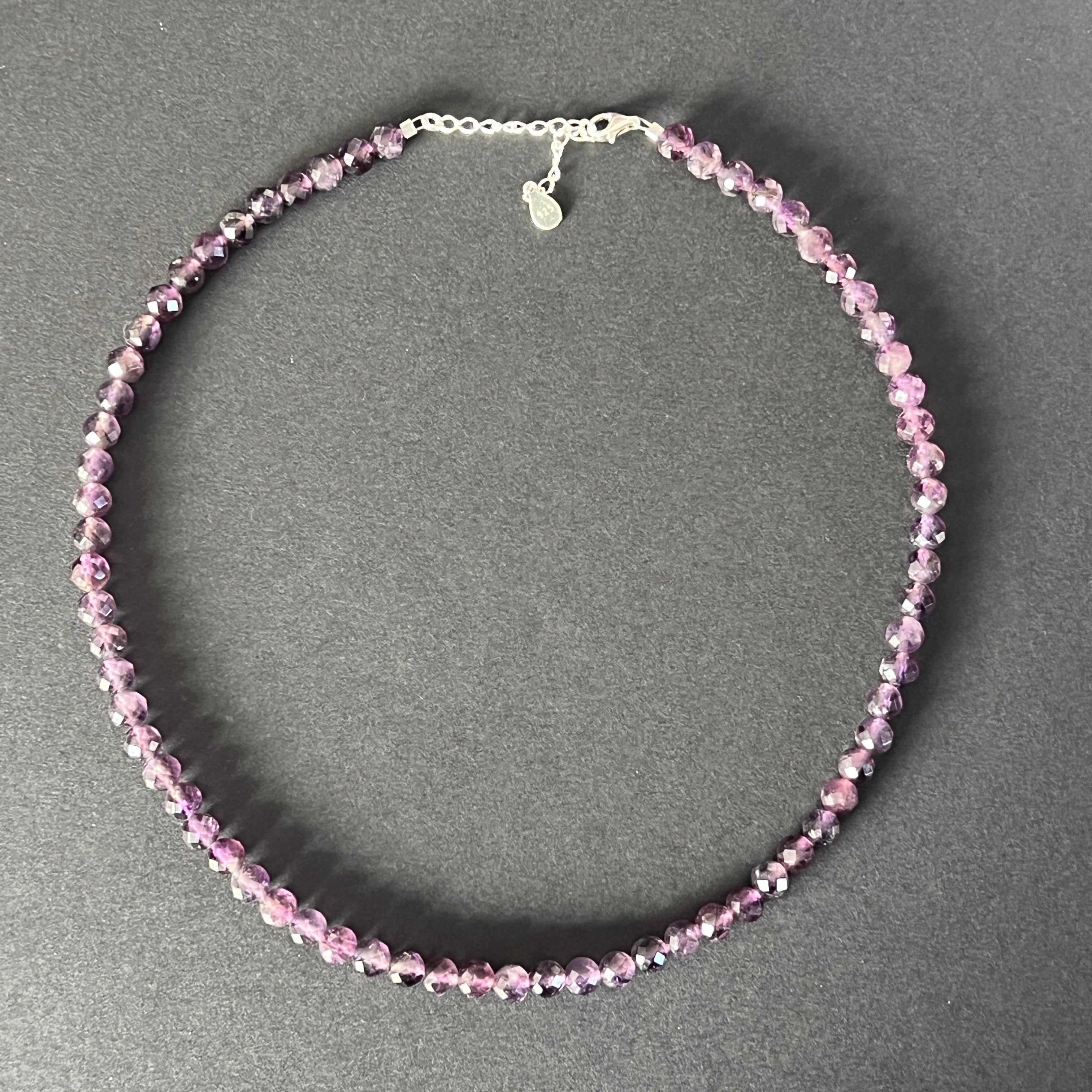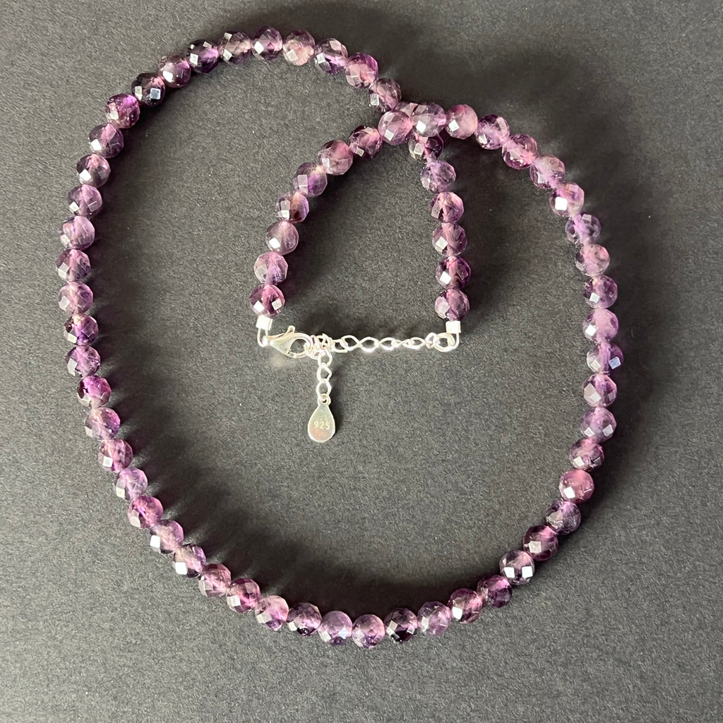 Un colier ce aduce cu sine delicatețea și noblețea subtilă a visului, ca o șoaptă de violet păstrată pe piele. Mărgelele de ametist natural de 6 mm, atent fațetate, strălucesc discret, reflectând lumina într-un ritm lin și grațios.