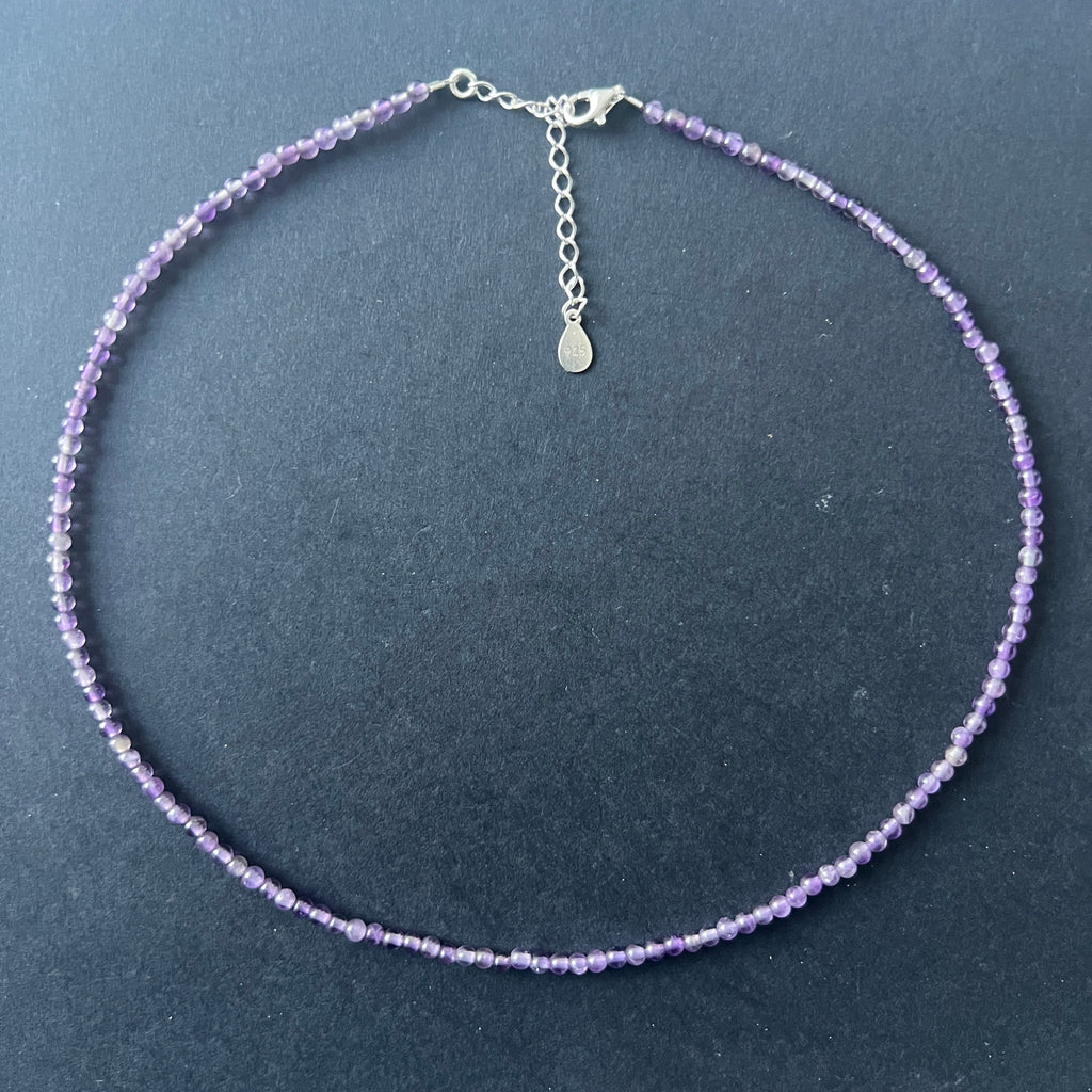 Un colier delicat, cu vibrația calmă a purității și eleganței naturale. Mărgelele fine de ametist natural de 3 mm se așază armonios pe linia gâtului, reflectând lumina într-o strălucire blândă, aproape eterică.
