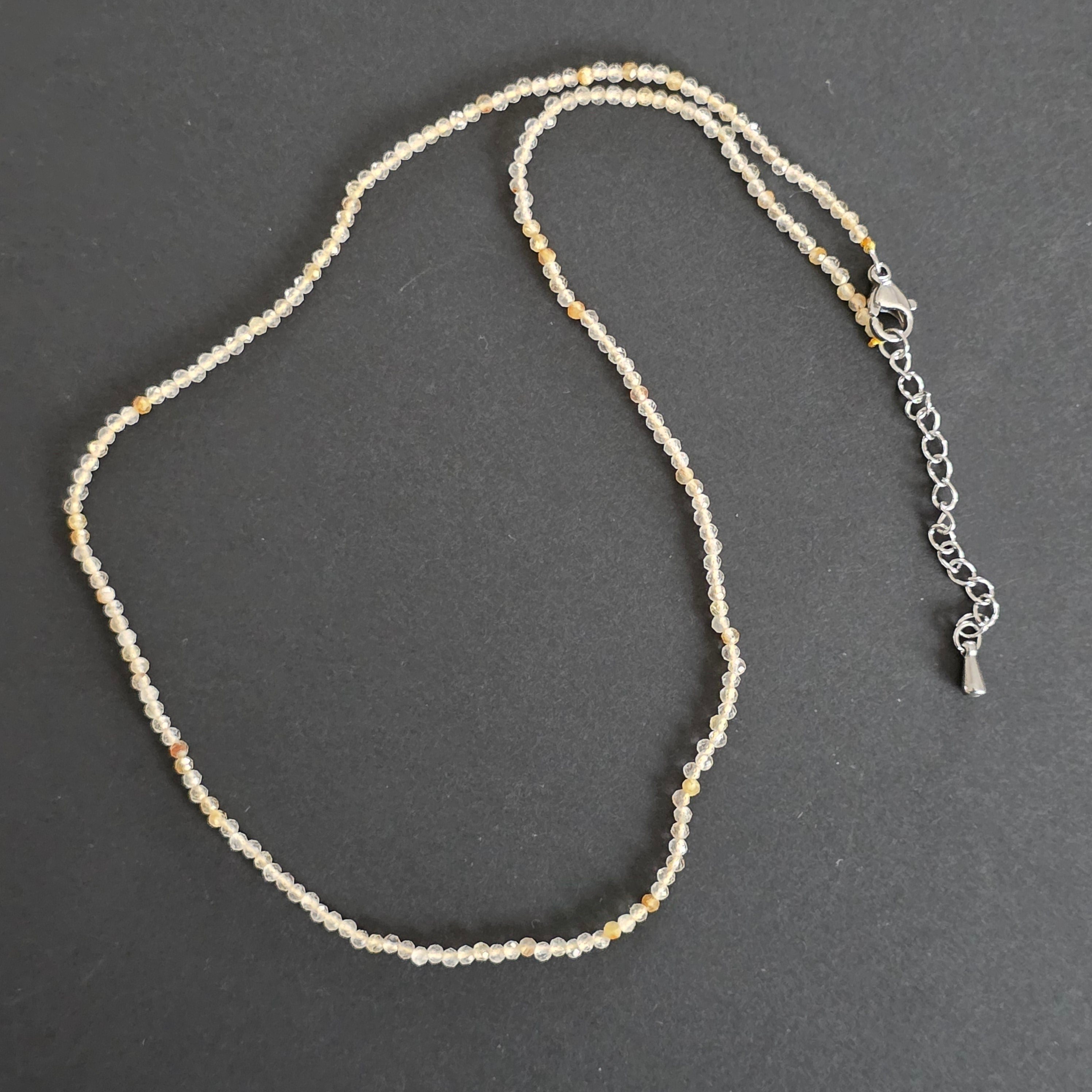 Un colier delicat și solar, apreciat pentru strălucirea sa caldă și lumina blândă pe care o reflectă. Nuanțele pastelate de galben, translucid și subtil irizate, oferă colierului un aspect pur, luminos, aproape eteric. Fiecare sferă fațetată creează un joc discret de reflexii, transformând piesa într-un accesoriu elegant, perfect pentru cei care iubesc bijuteriile fine și naturale.