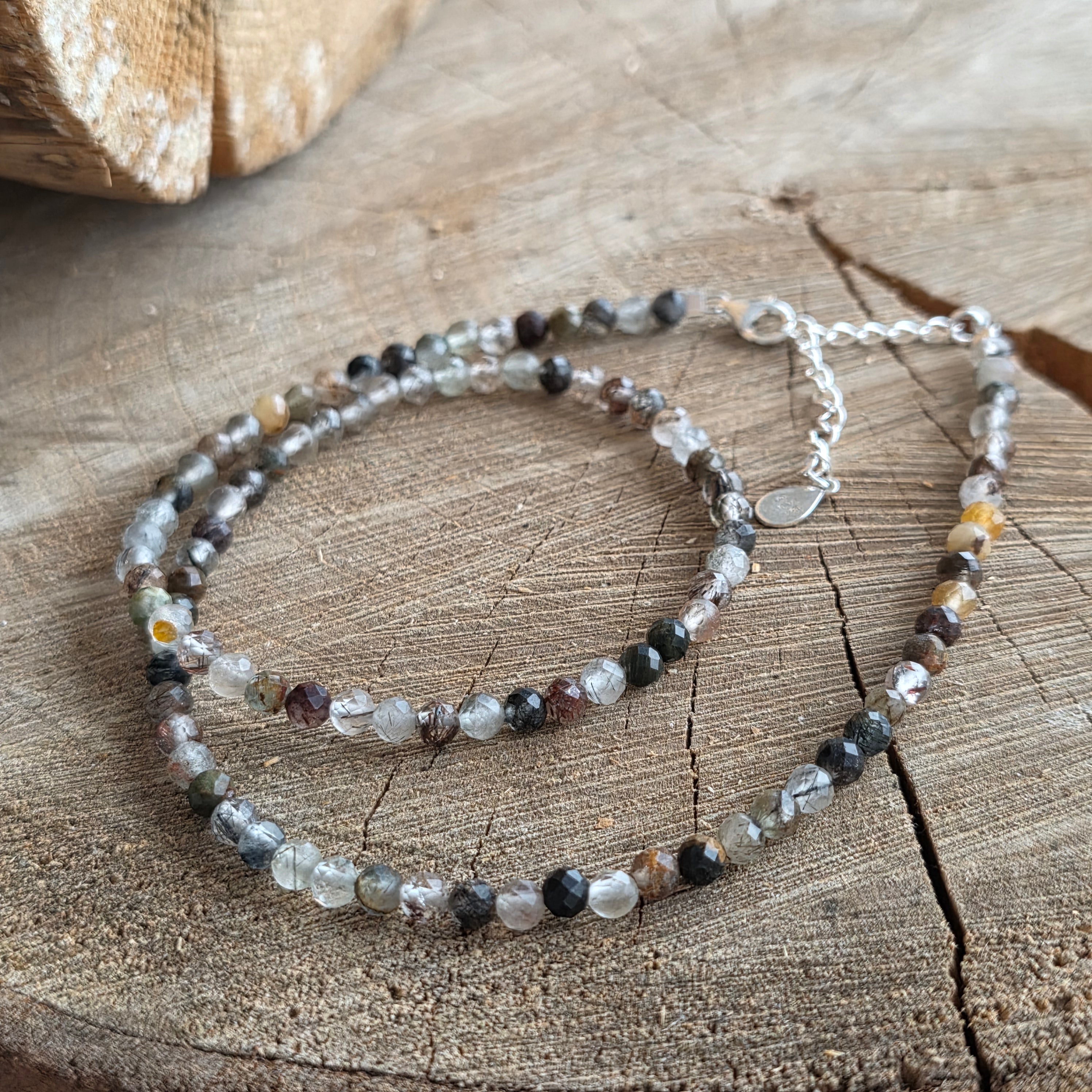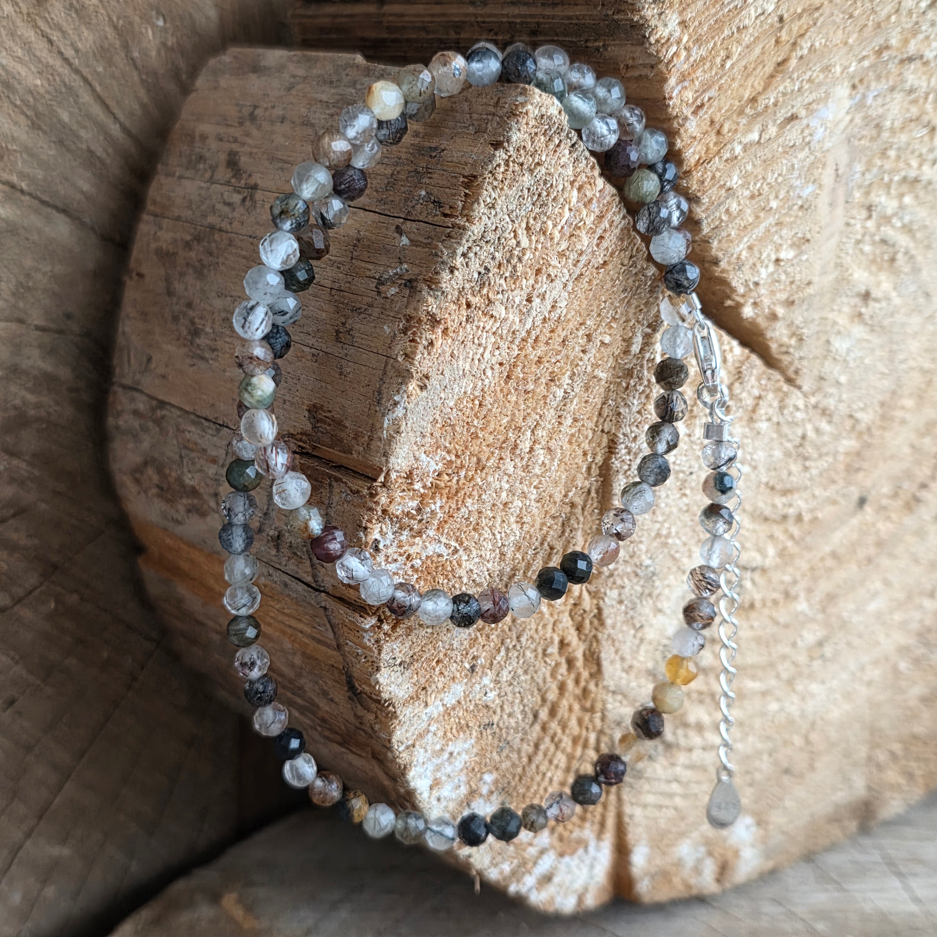 Un colier delicat și luminos, realizat din sfere fațetate de cuart tibetan de 4 mm, care surprind și reflectă lumina cu o finețe aproape aeriană. Transparența pietrei, traversată de incluziuni subtile și reflexii discrete, creează impresia unei clarități vii, ca și cum fiecare element ar păstra o fărâmă de cer sau de liniște montană. Designul este minimalist, dar profund, punând în valoare frumusețea naturală a cuartului fără artificii.