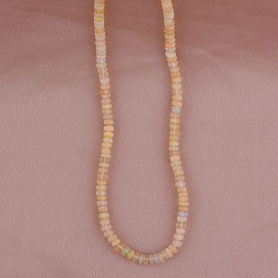 Un colier elegant și plin de lumină, realizat din opal etiopian natural, cu reflexe delicate în nuanțe de auriu, verde și albastru. Fiecare mărgea fațetată reflectă lumina într-un mod unic, creând un joc subtil de culori.