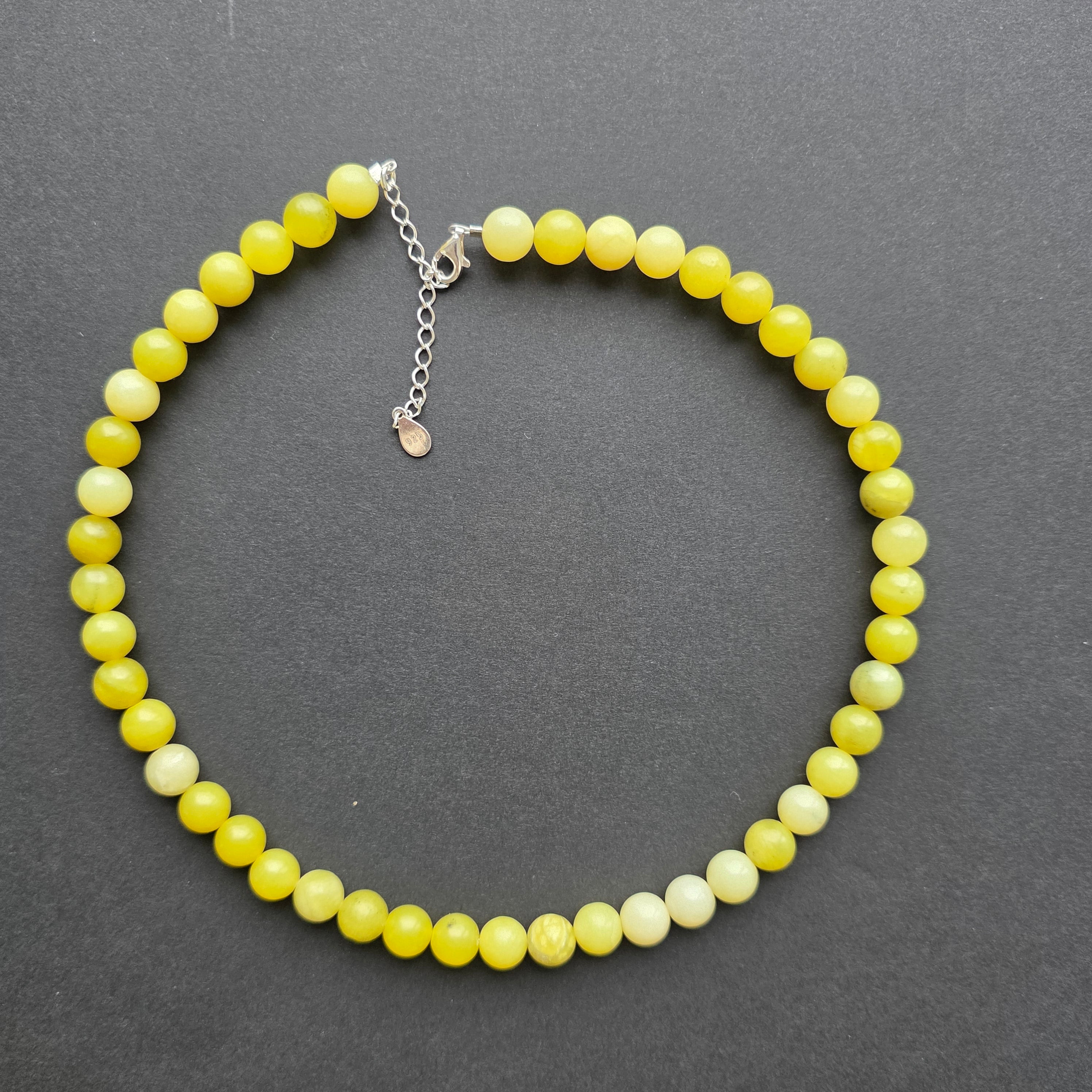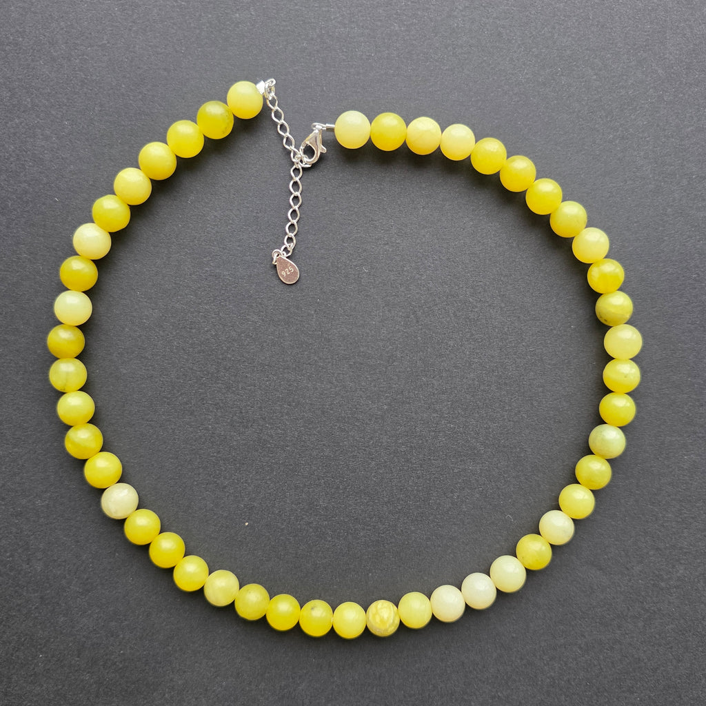 Un colier ce poartă lumina blândă a dimineții și căldura soarelui care trezește pământul. Jadul galben, cu reflexele sale catifelate și tonurile de aur pal, emană o vibrație a vitalității, bucuriei și încrederii senine în viață. Fiecare sferă de 8 mm pare o picătură solidificată de lumină, menită să aducă optimism și energie blândă purtătorului.