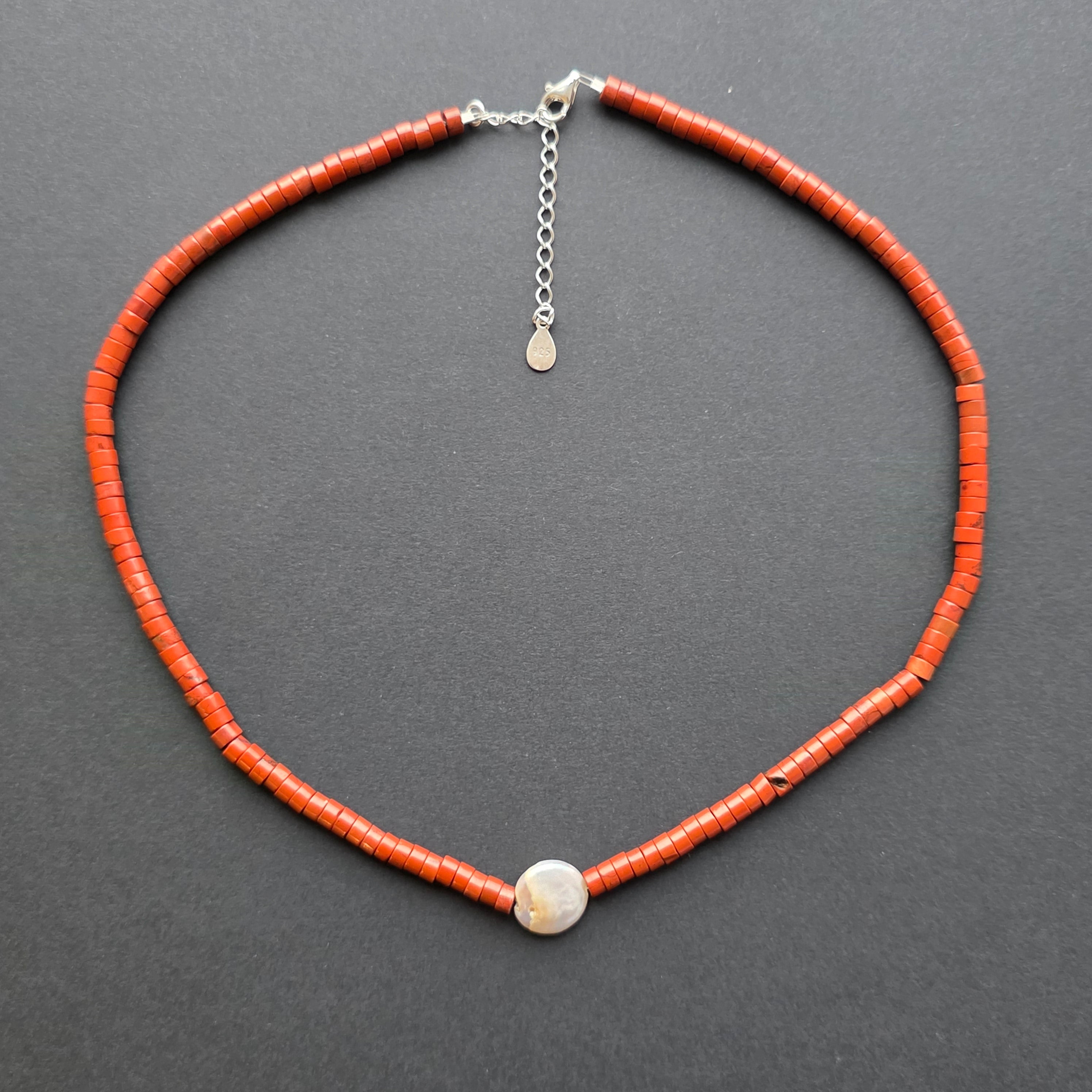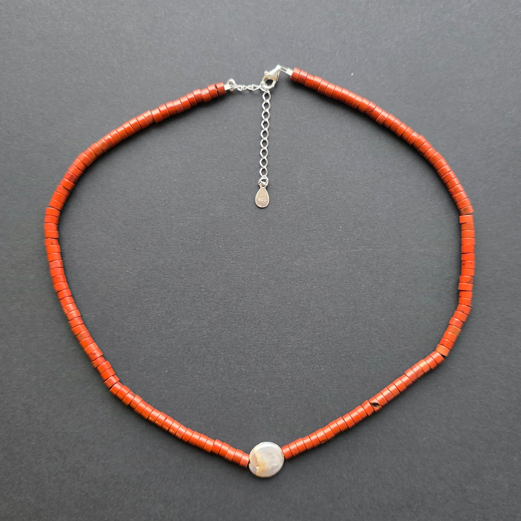 Un colier ce poartă energia pământului și noblețea simplității naturale. Jaspul roșu natural, tăiat în discuri fine de 4,5 × 2 mm, radiază forță și vitalitate, iar perla centrală de 1 cm aduce un accent de lumină, ca o picătură de liniște în mijlocul culorii vii. Împreună, ele creează un echilibru perfect între pasiune și calm, între foc și apă.