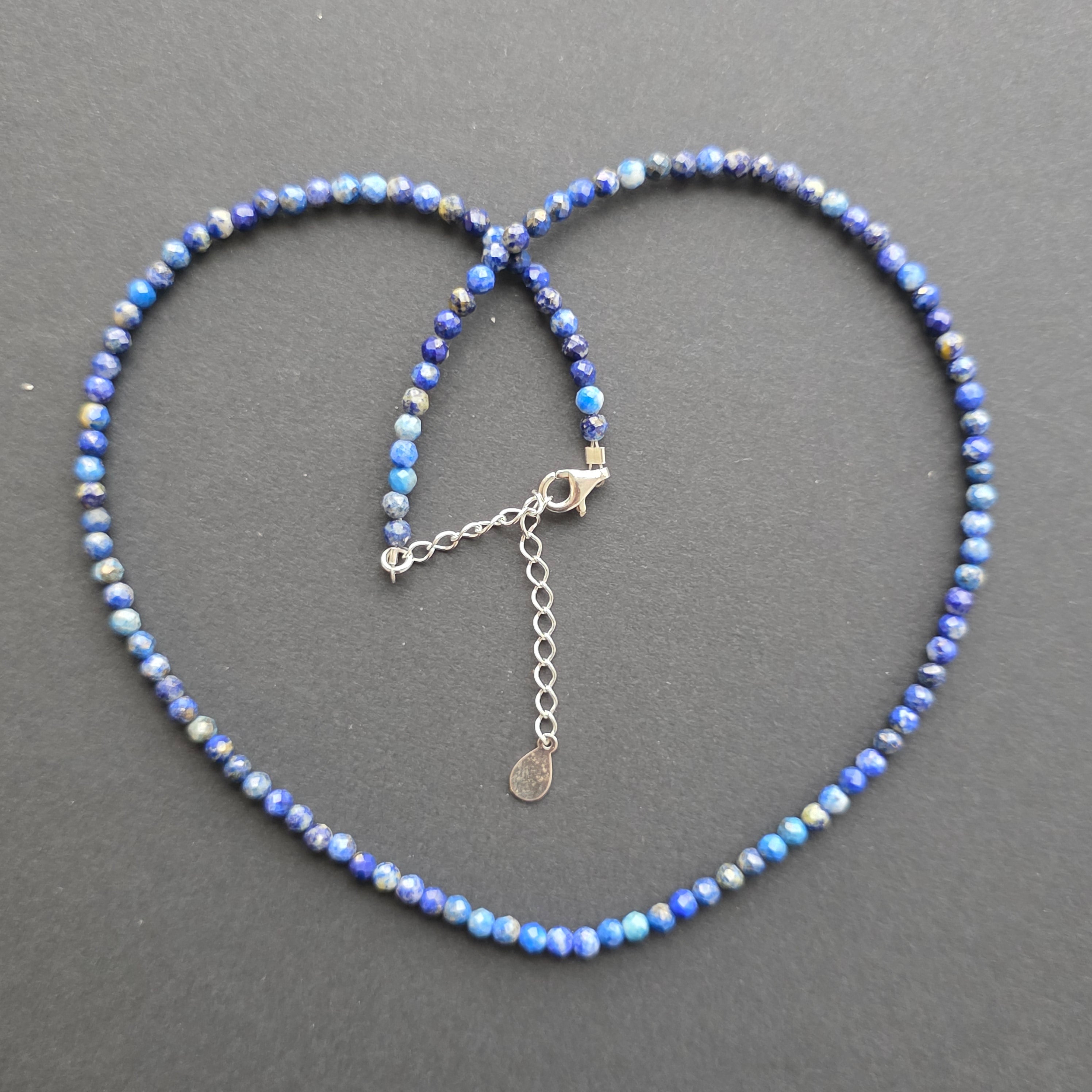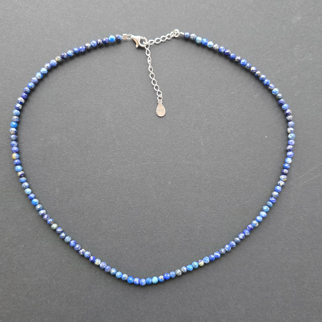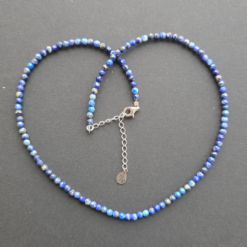 Un colier care poartă noblețea cerului închis presărat cu stele. Lapis lazuli-ul natural fațetat de 3 mm își dezvăluie nuanțele regale de albastru profund, animate de scânteieri aurii de pirită. Fațetele fine reflectă lumina discret, adăugând bijuteriei o eleganță subtilă și rafinată, perfectă atât pentru ocazii speciale, cât și pentru purtarea zilnică.