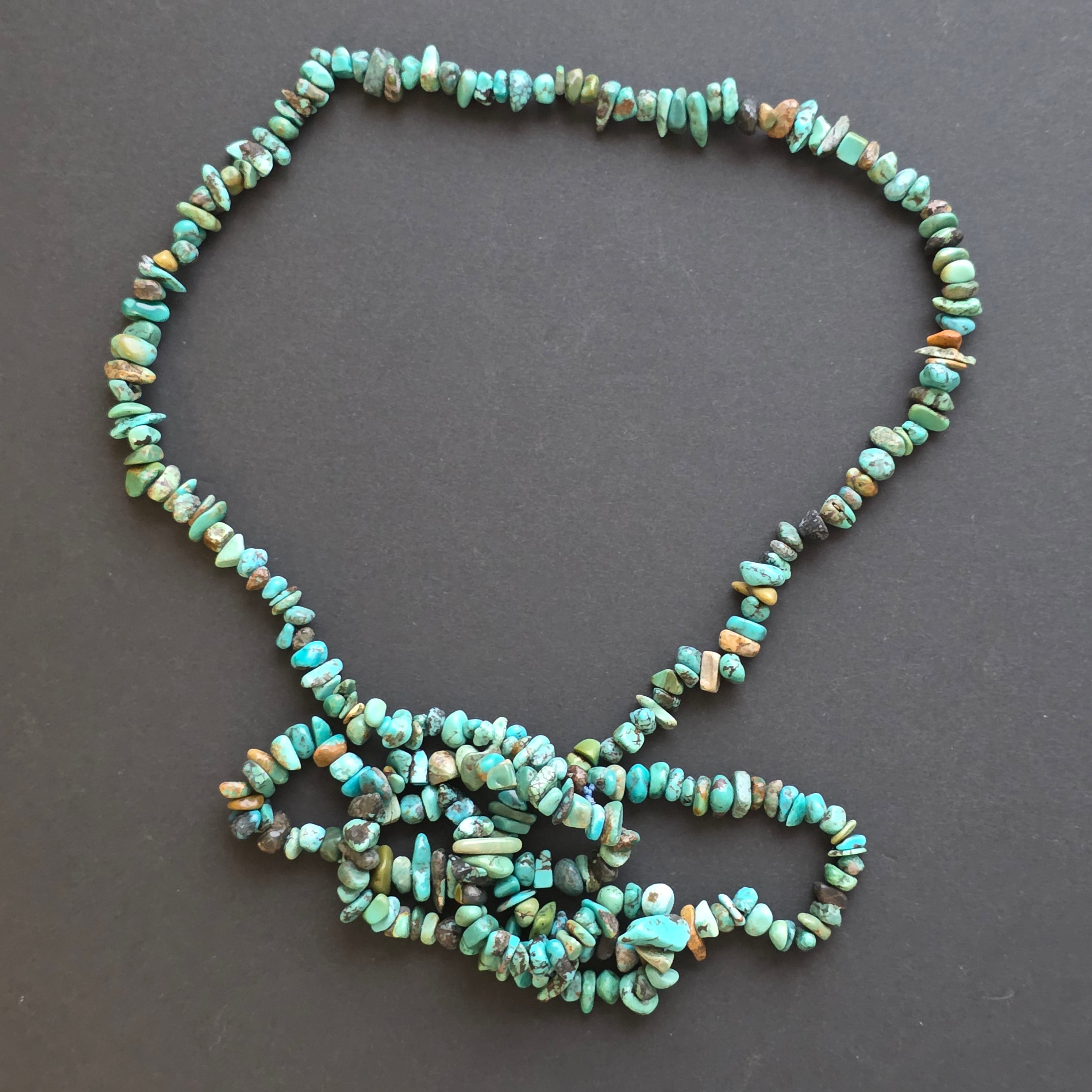 Un colier lung și expresiv, realizat din chipsuri de turcoaz natural, fiecare piesă păstrând forma liberă a pietrei, cu variații de culoare și textură care îi dau caracter și autenticitate. Nuanțele de albastru și verde, uneori străbătute de vene fine, creează un ritm vizual organic, cu aer boem și natural.