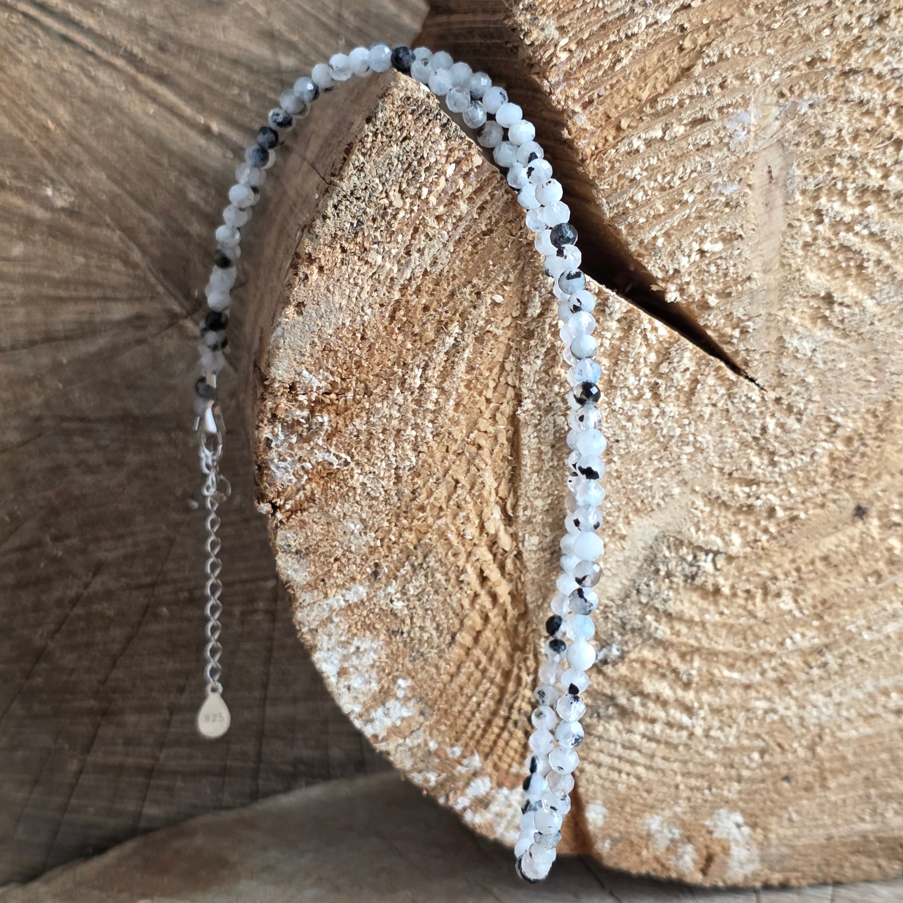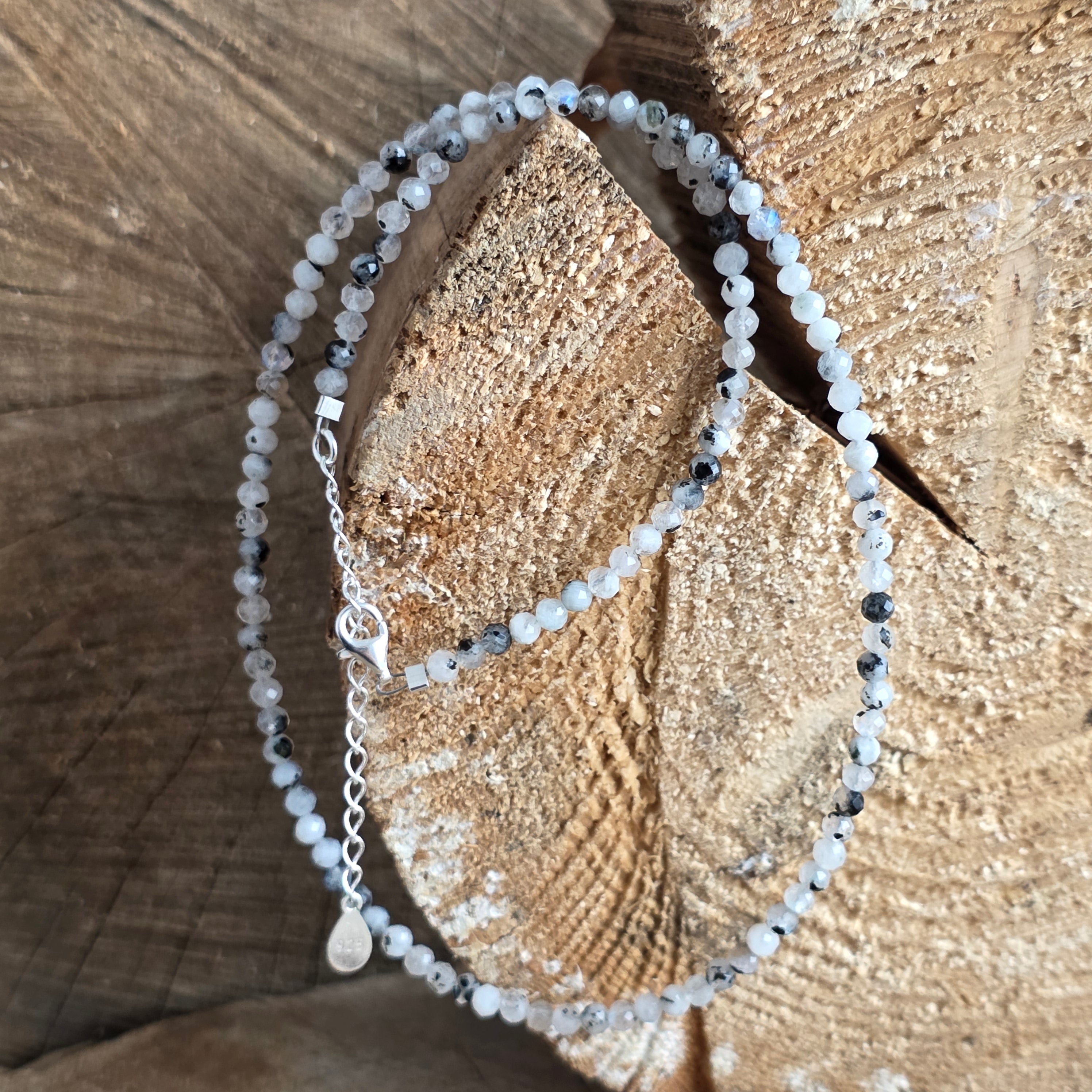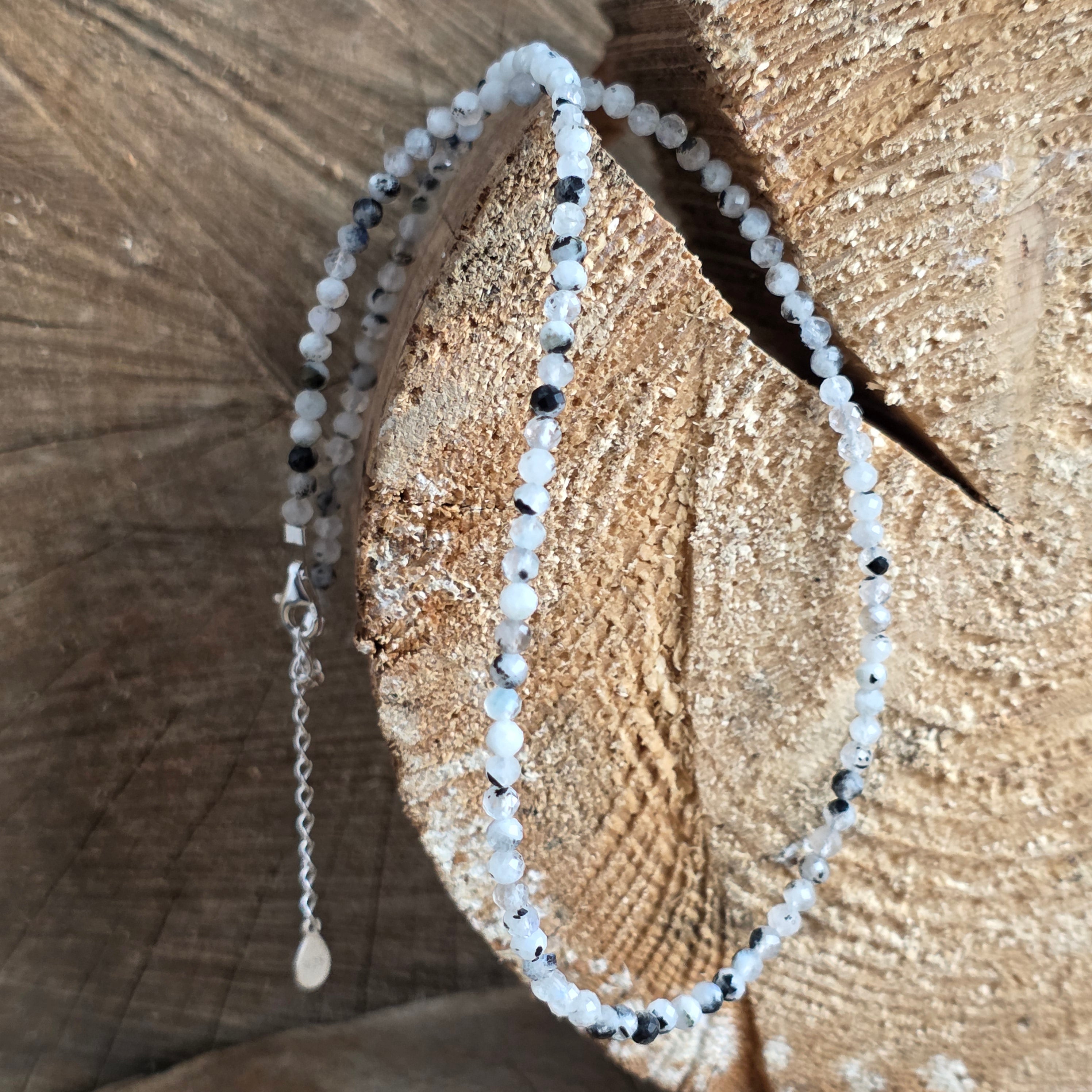 A necklace like a fine bridge between vulnerability and strength-composed of 4 mm-faceted spheres, in which the moonstone and tourmaline meet in a silent dance, protection and balance.