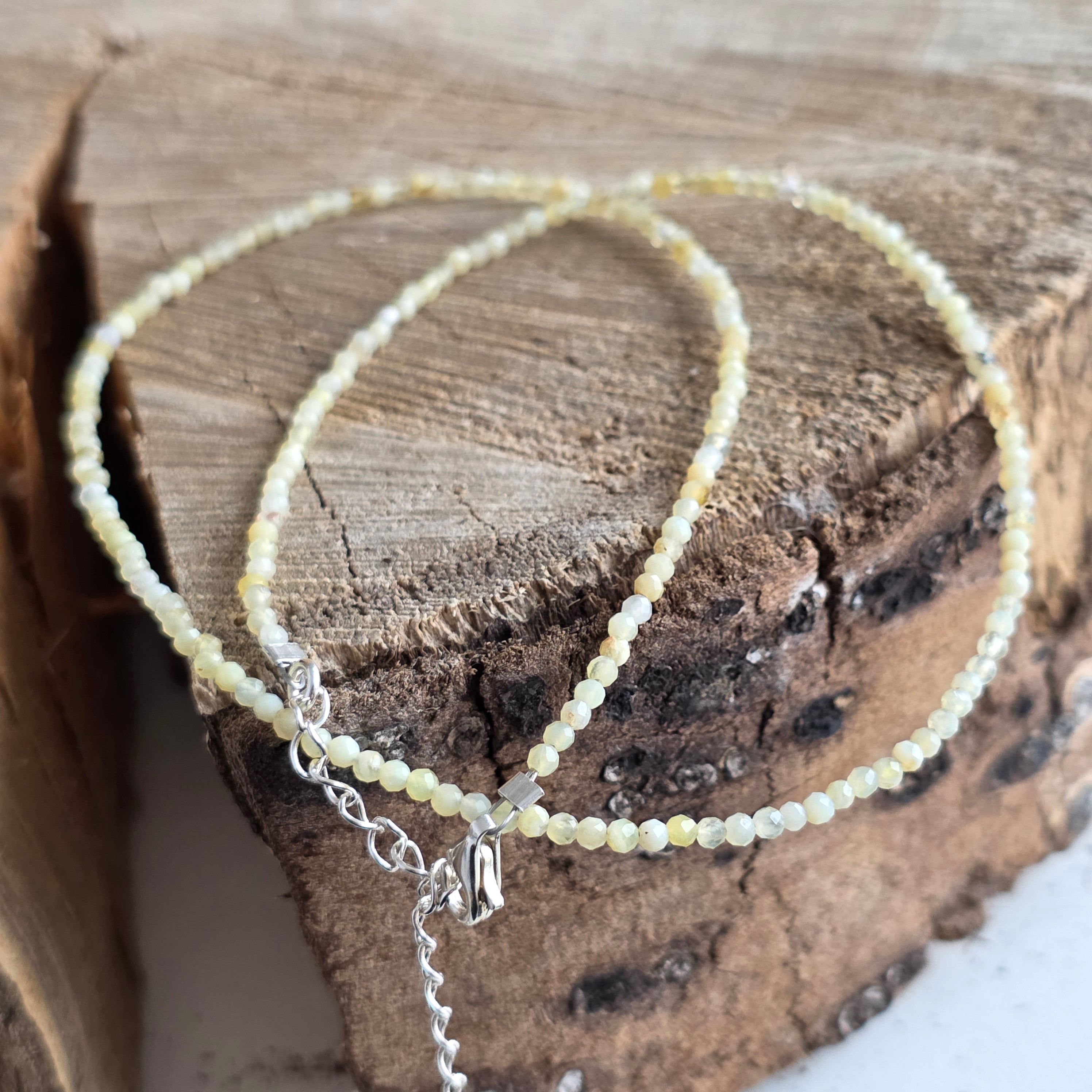 The thread is composed of spheres of faceted by 2.5 mm yellow opal, fine and translucent beads, with a soft glow that seems to come from inside the stone. It is not a strong color, but a diffuse one, like honey diluted in hot tea, like aura of a silent morning. The opalescent reflexes, almost imperceptible, add a subtle vibration of mystery and elegance.
