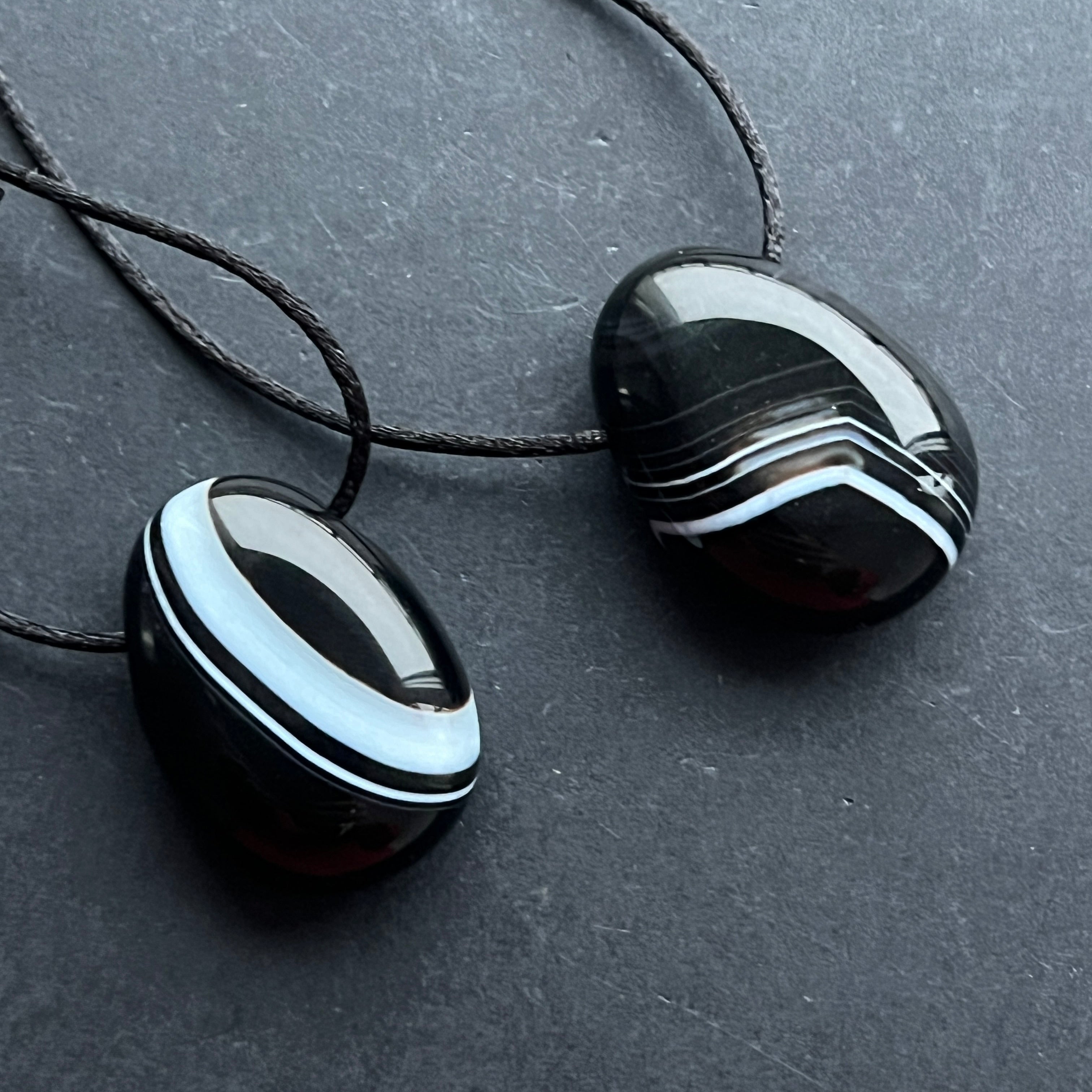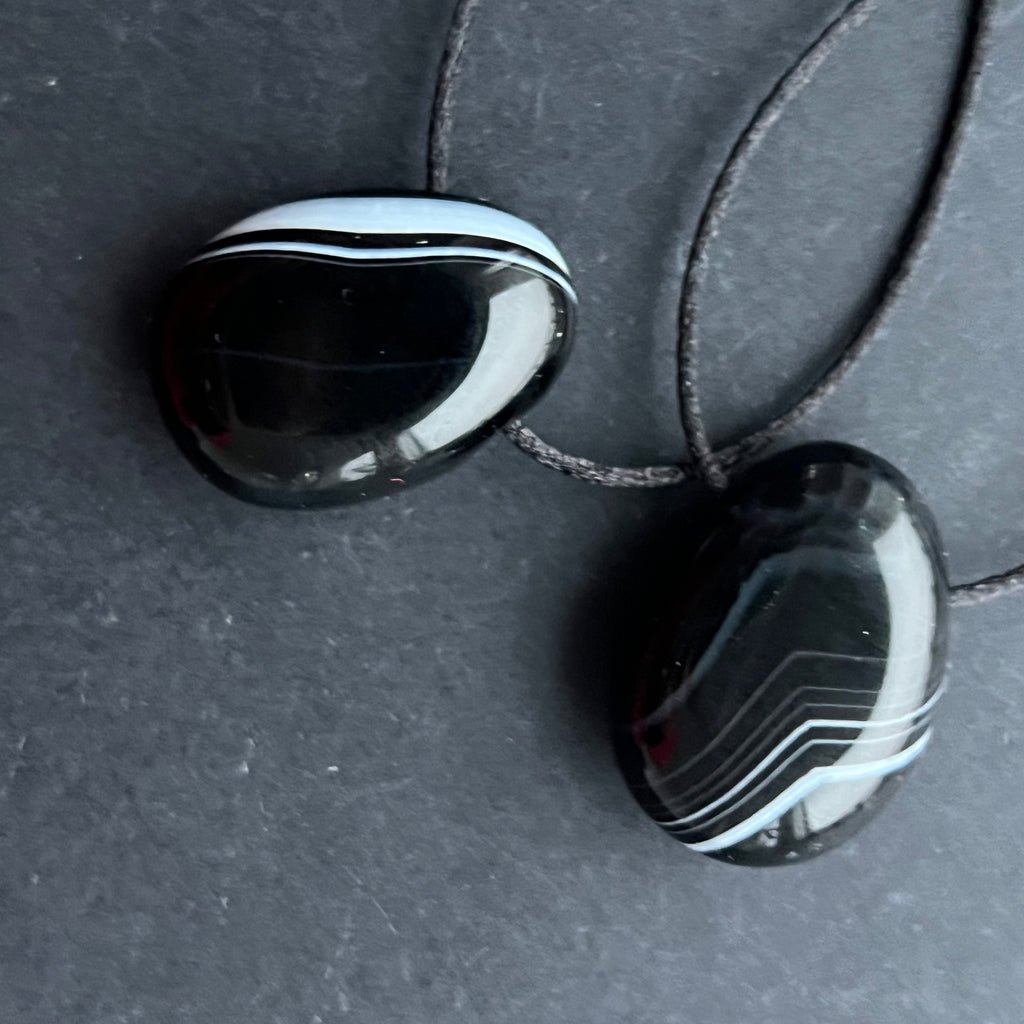 Poartă colierul cu pandantiv din onix negru dungat pentru a adăuga ținutei tale un simbol de protecție, eleganță și putere interioară ⚫✨.