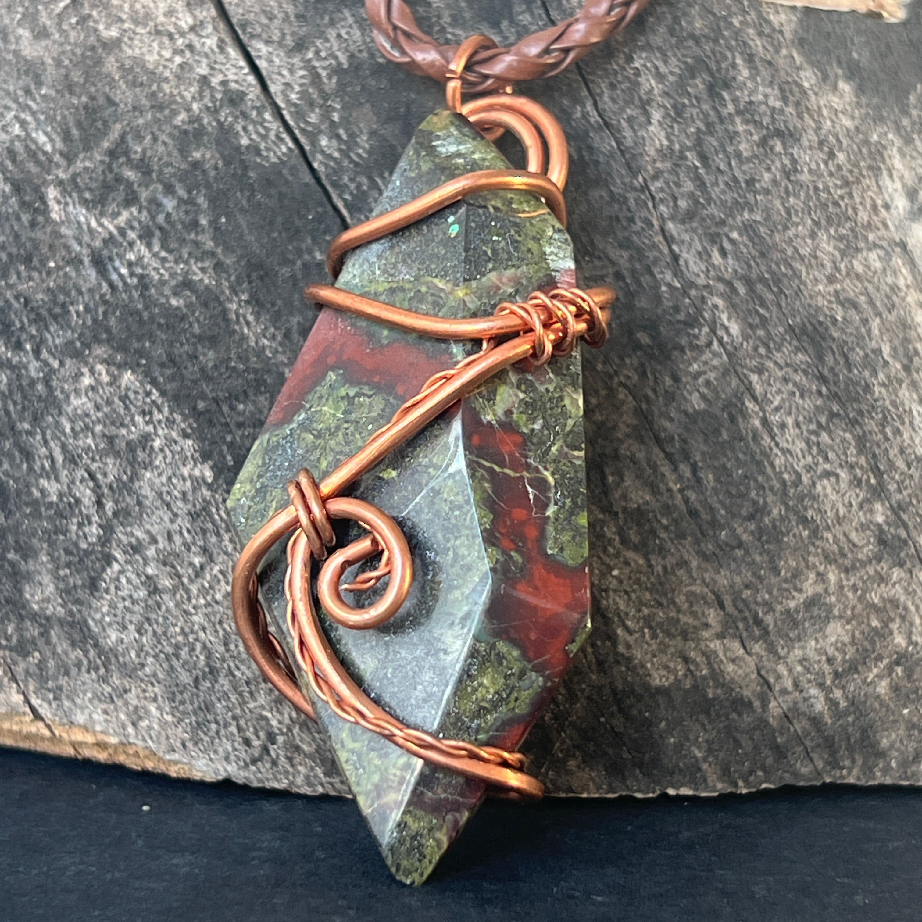 Acest colier unicat îmbină forța cu frumusețea brută a Africii printr-un pandantiv spectaculos din Sângele Dragonului, o piatră rară și fascinantă din Africa de Sud. Piatra polisată, prinsă într-o montură de cupru artistic răsucit manual, dezvăluie contraste puternice de verde pământiu și roșu intens, asemenea unei legende sculptate în mineral.