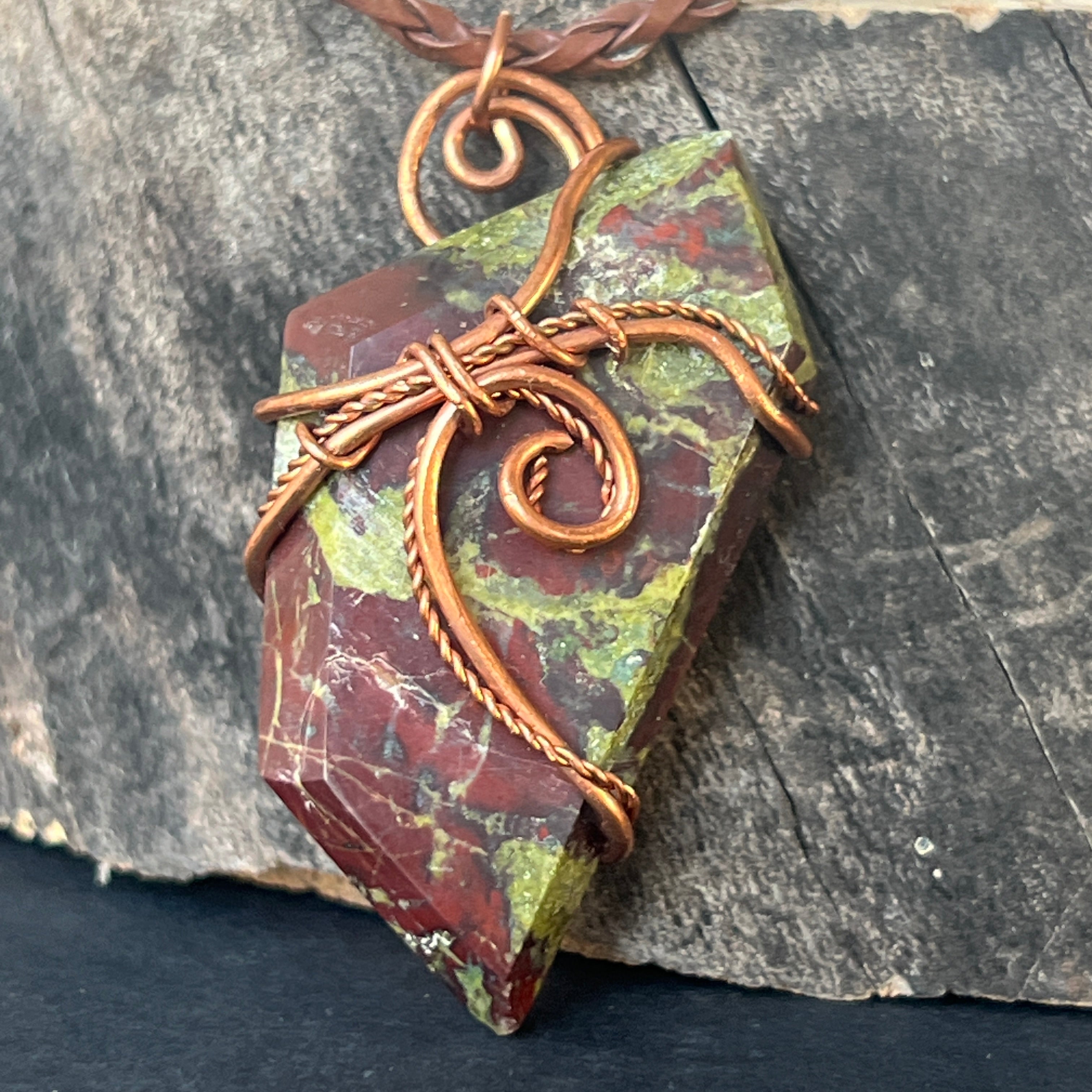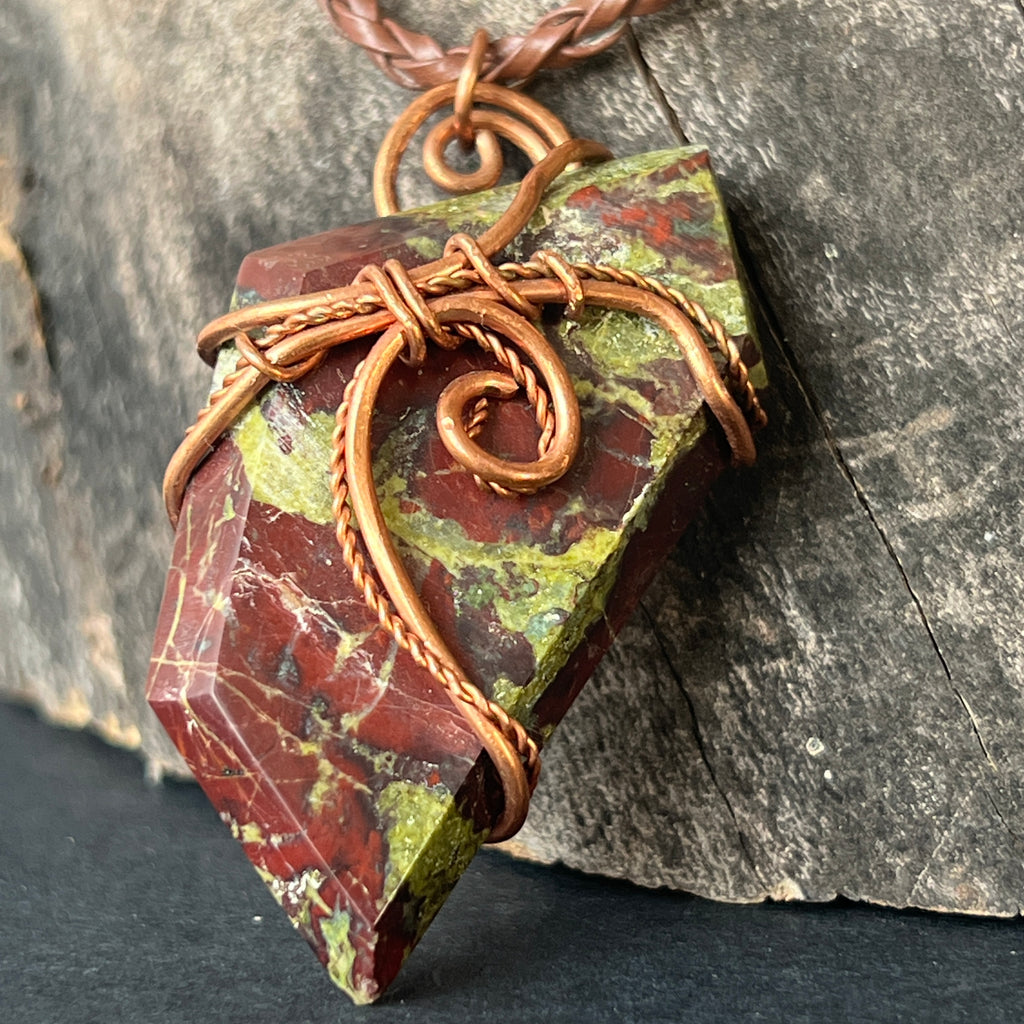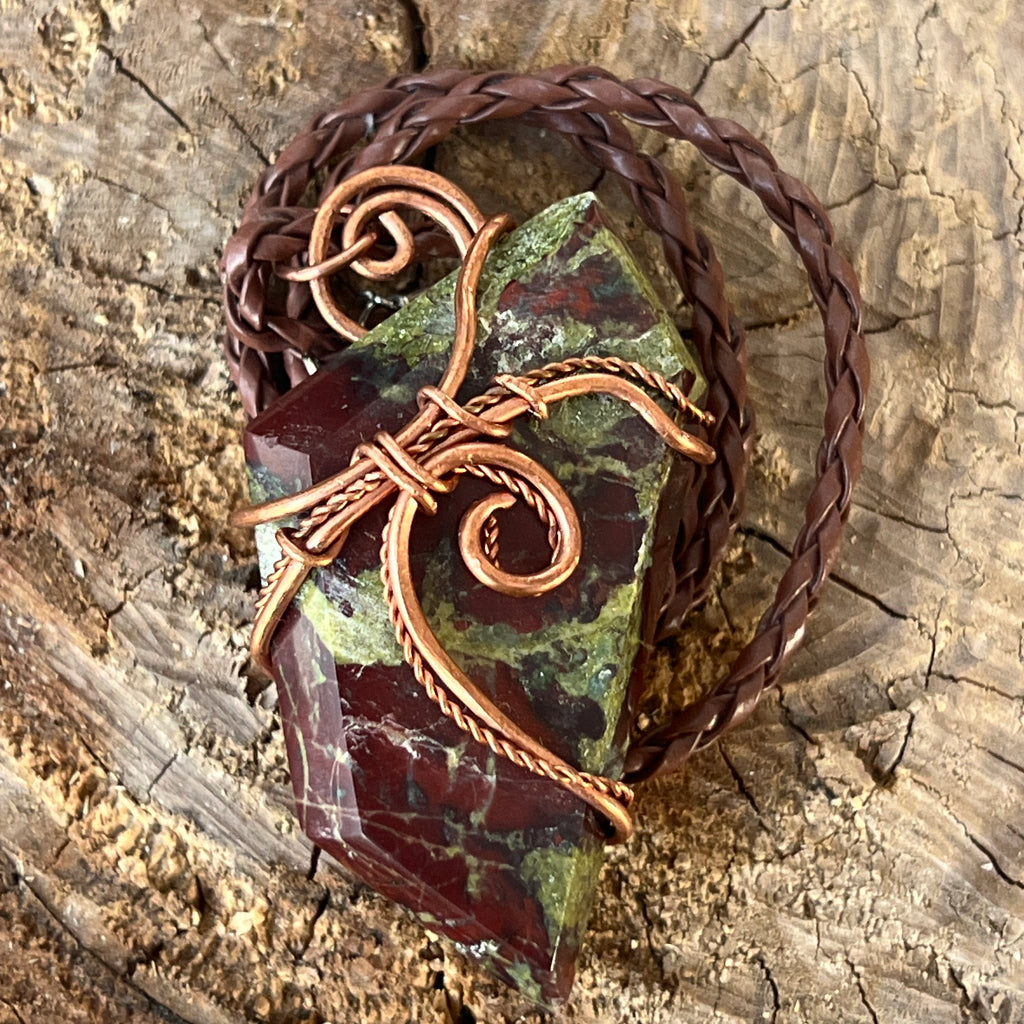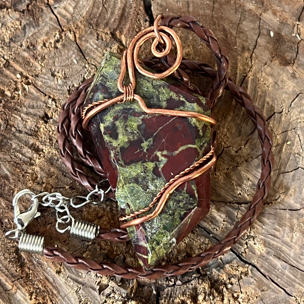 Acest colier unicat îmbină forța cu frumusețea brută a Africii printr-un pandantiv spectaculos din Sângele Dragonului, o piatră rară și fascinantă din Africa de Sud. Piatra polisată, prinsă într-o montură de cupru artistic răsucit manual, dezvăluie contraste puternice de verde pământiu și roșu intens, asemenea unei legende sculptate în mineral.