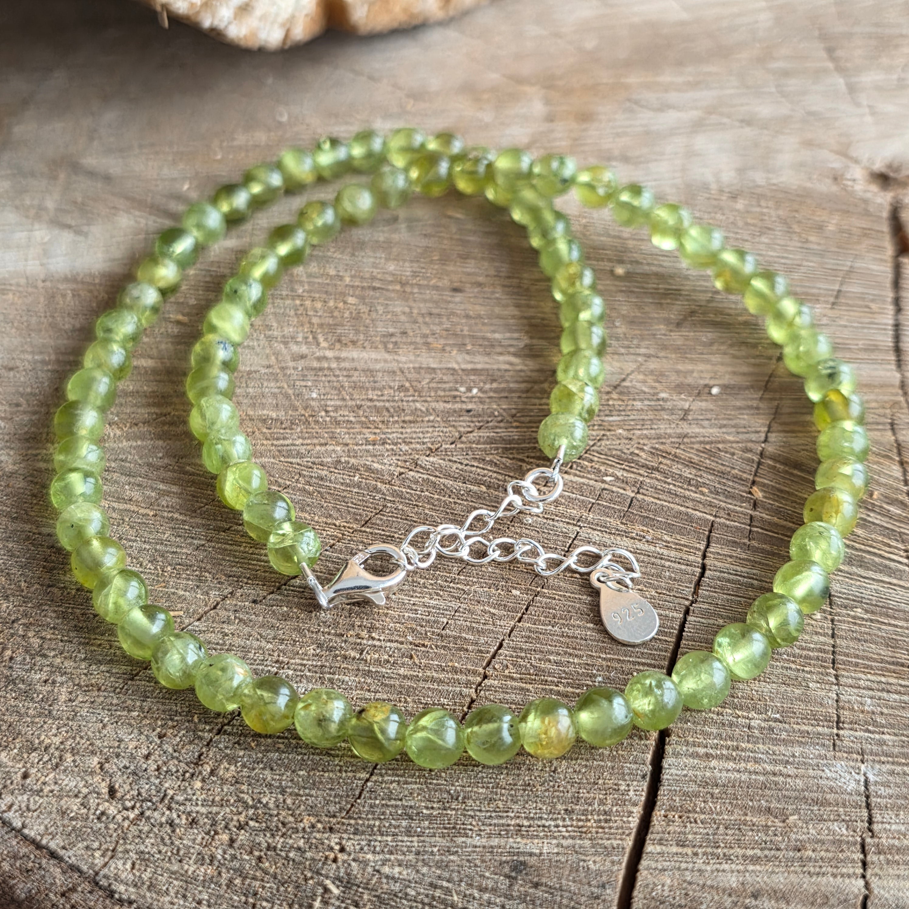 Un colier luminos și proaspăt, realizat din sfere de peridot de 5 mm, atent selecționate, cu o culoare verde intensă și clară, care pare să pulseze de viață. Fiecare sferă reflectă lumina cu o transparență caldă, evocând ideea de început nou, de respirație adâncă după o etapă încheiată. Designul este curat și echilibrat, lăsând piatra să fie centrul expresiei.