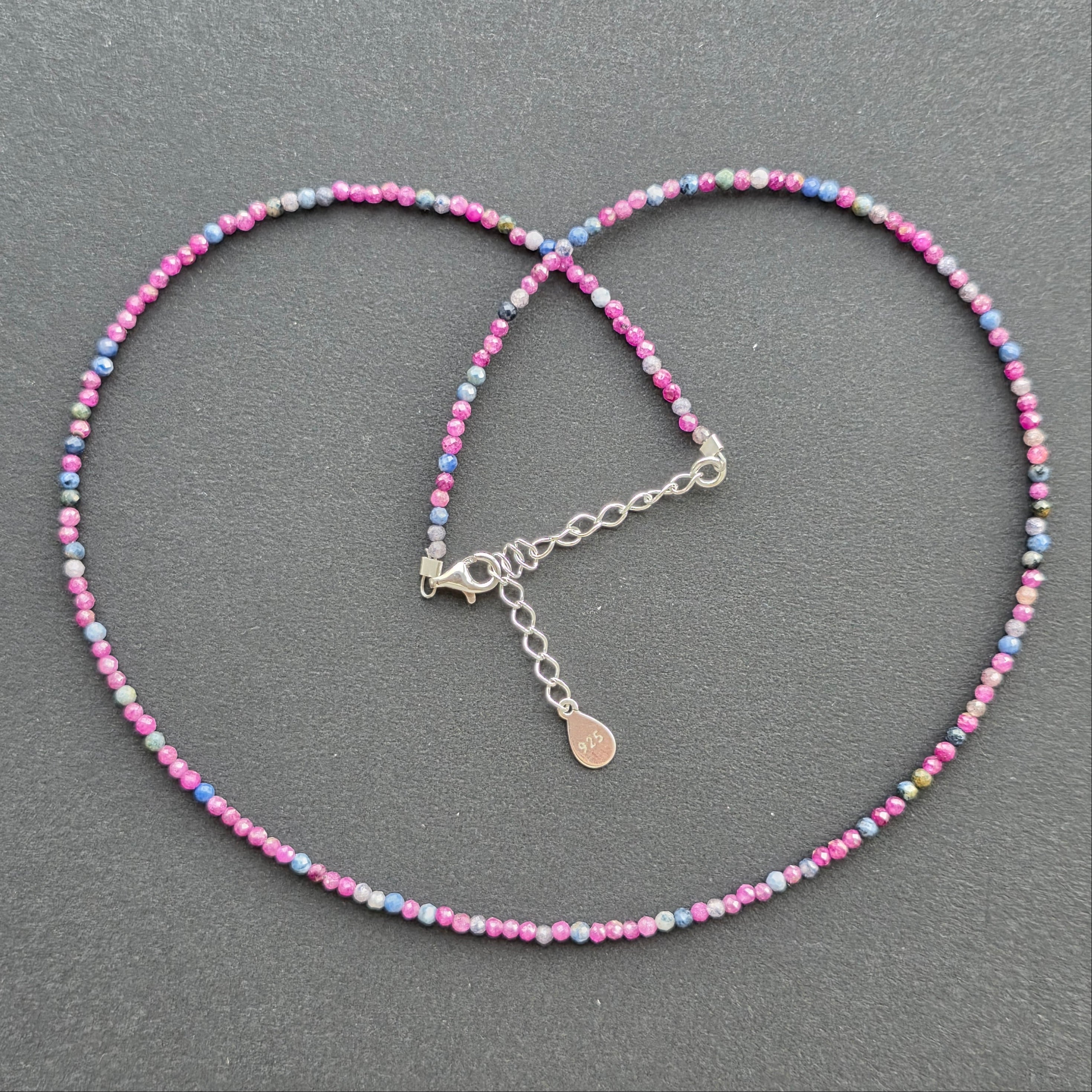 Un colier delicat, dar cu o forță subtilă, realizat din sfere fațetate de safir și rubin de 2.5 mm, împletite într-un joc armonios de contraste – albastrul înțelept al safirului și roșul pasional al rubinului. Cele două pietre prețioase alternează discret, într-o compoziție ce vorbește despre echilibru, rafinament și profunzime.