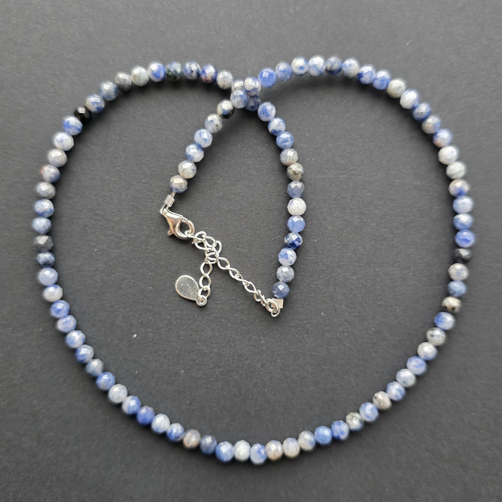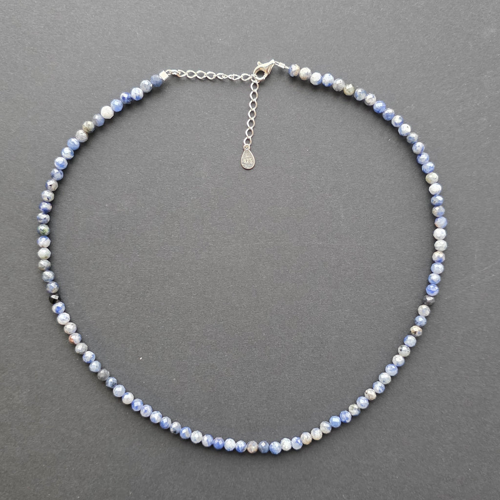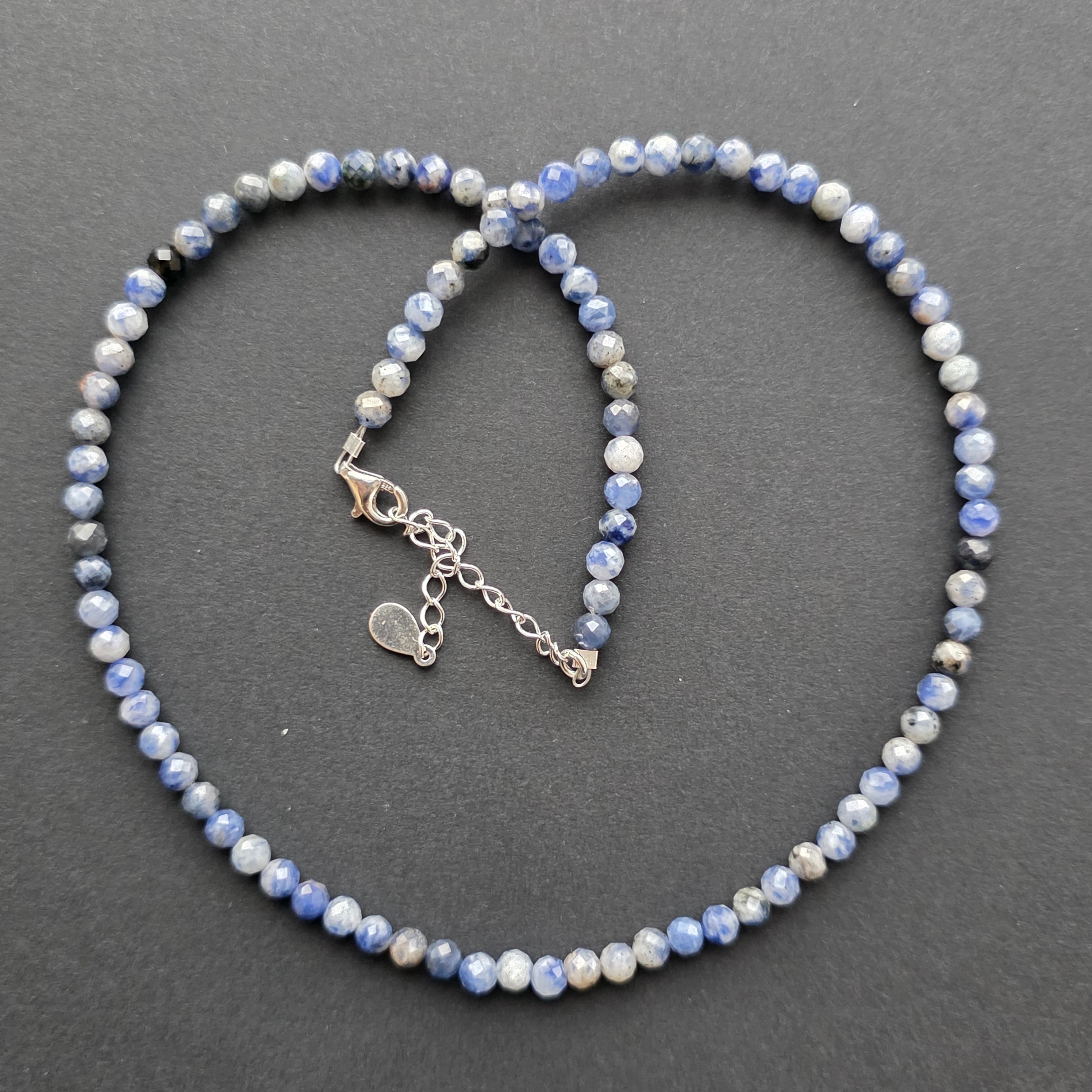 Un colier care poartă seninul cerului și profunzimea gândului limpede. Sodalitul natural fațetat de 4 mm îmbină nuanțe de albastru adânc cu vene fine albe și gri, într-un joc vizual elegant și liniștitor. Fațetele fine reflectă lumina cu discreție, oferind bijuteriei o strălucire subtilă, perfect echilibrată între rafinament și naturalețe.