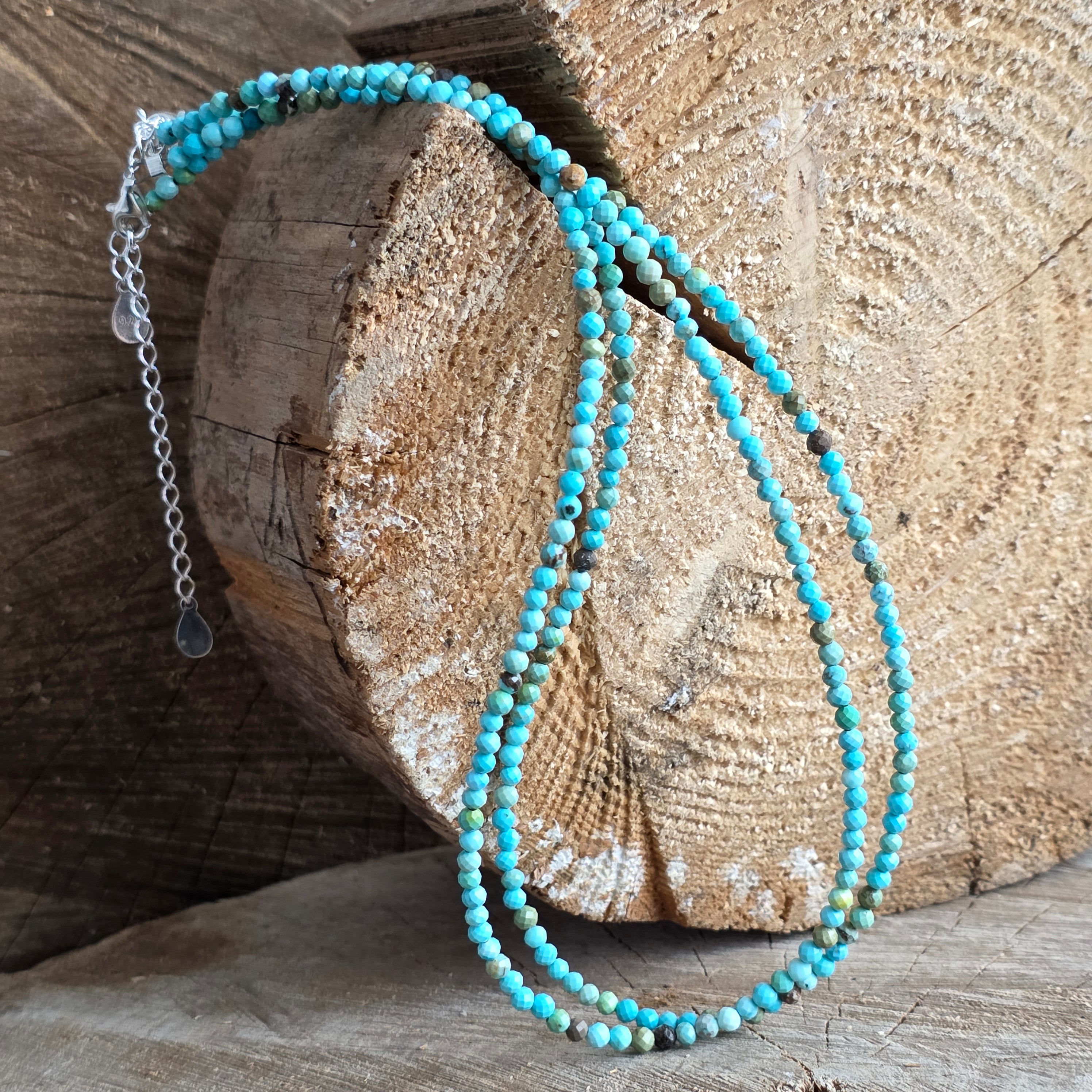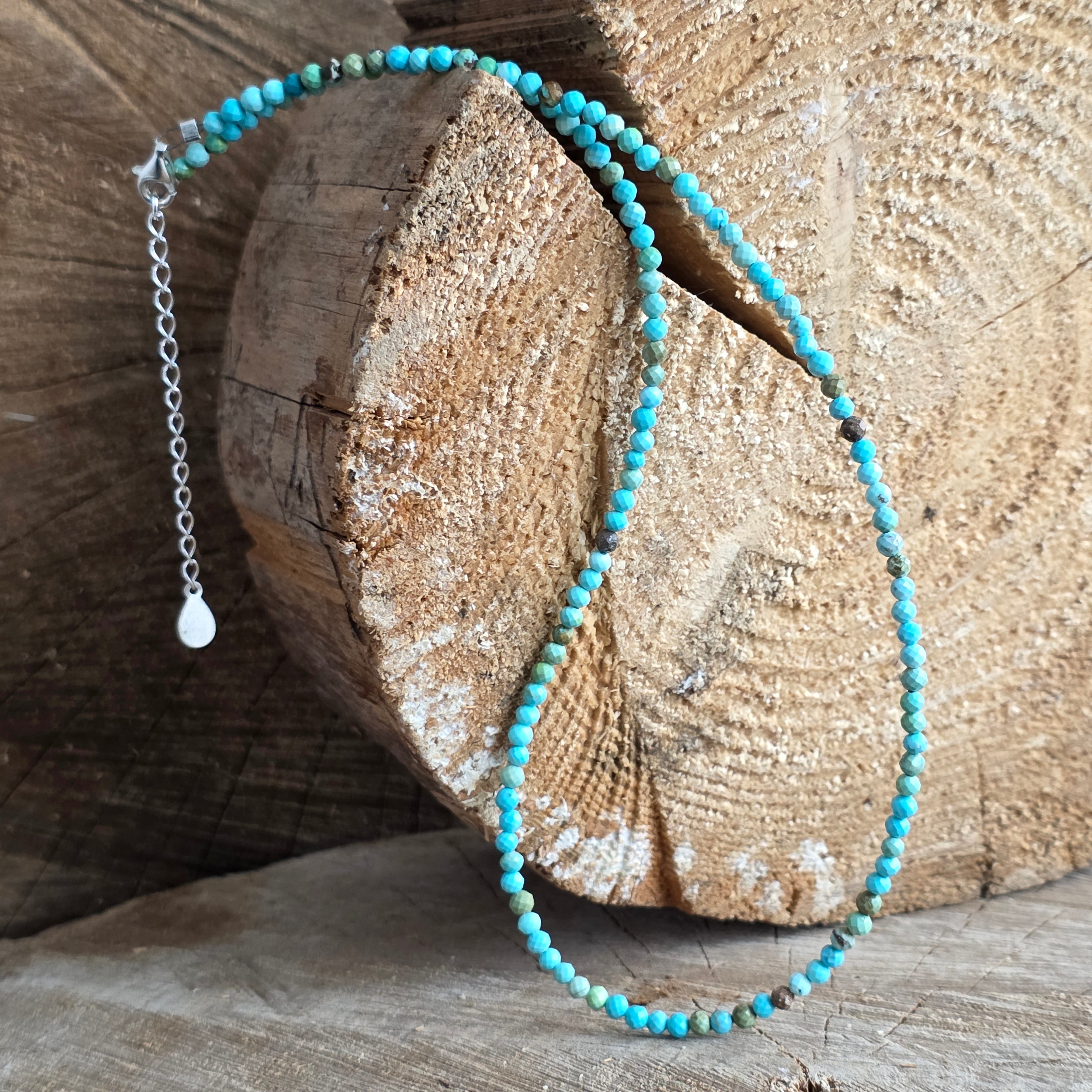 A necklace that bears the serenity of the clear sky and the energy of an open morning to possibilities. Made of natural Turquenit, with 3 mm -faceted spheres, this fine necklace is placed as a delicate line of light blue at the base of the neck - reminding of clear horizons and light thoughts.