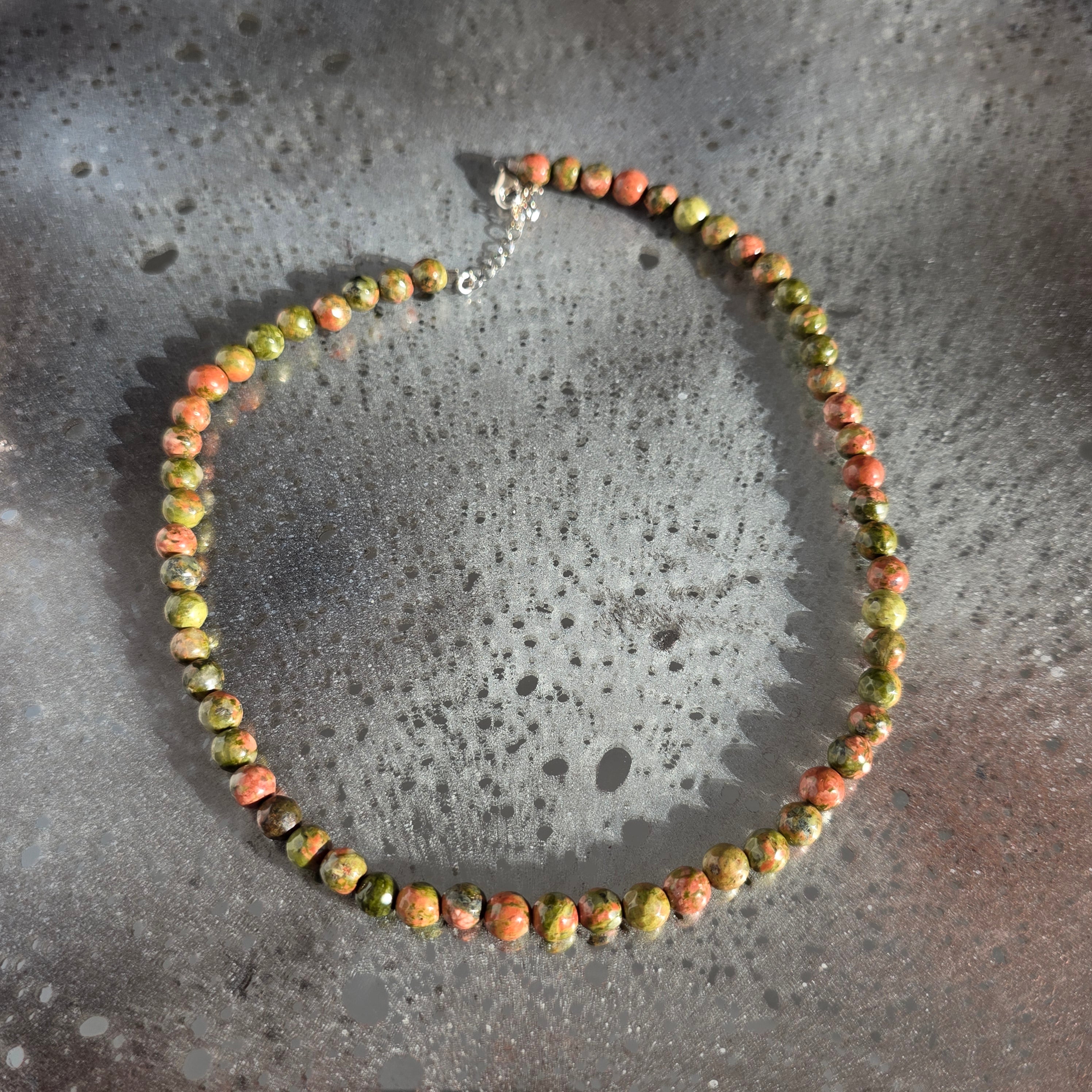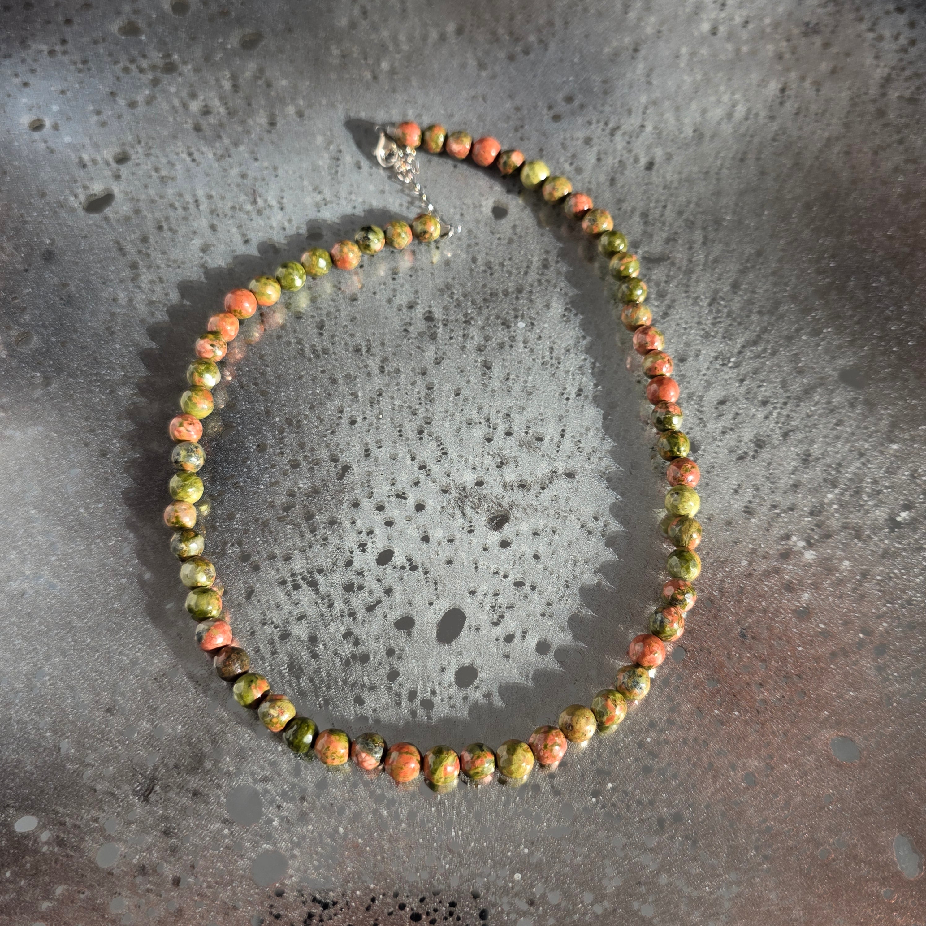 A necklace with the soul of living earth – warm, balanced, and gentle. The 6 mm faceted unakite beads blend shades of moss green and terracotta pink, like a warm autumn landscape captured in a piece of jewelry.