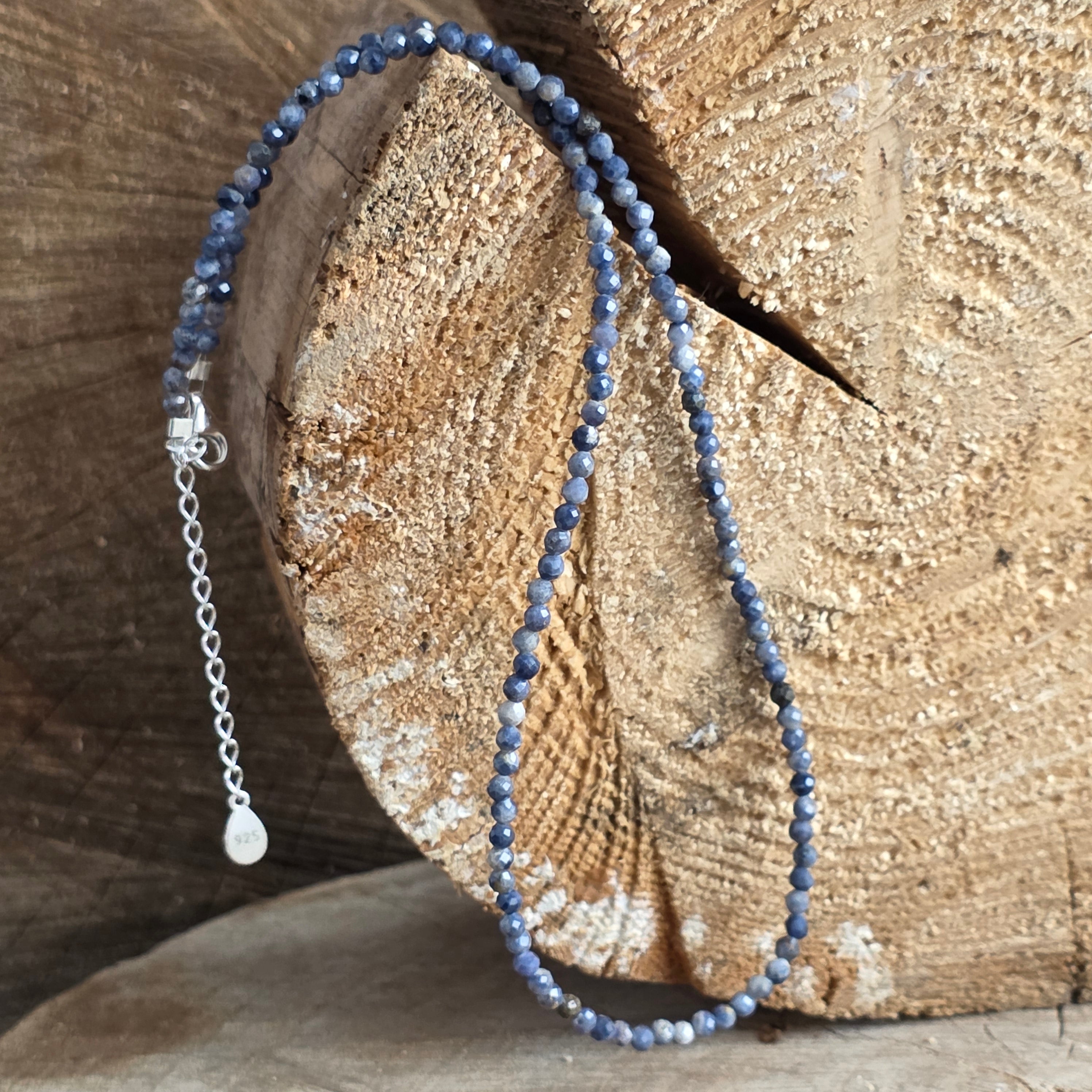A necklace of o silent elegance, created from 3 mm -made natural sapphire, whose deep shades of blue retains the mystery of serene nights and inner peace.