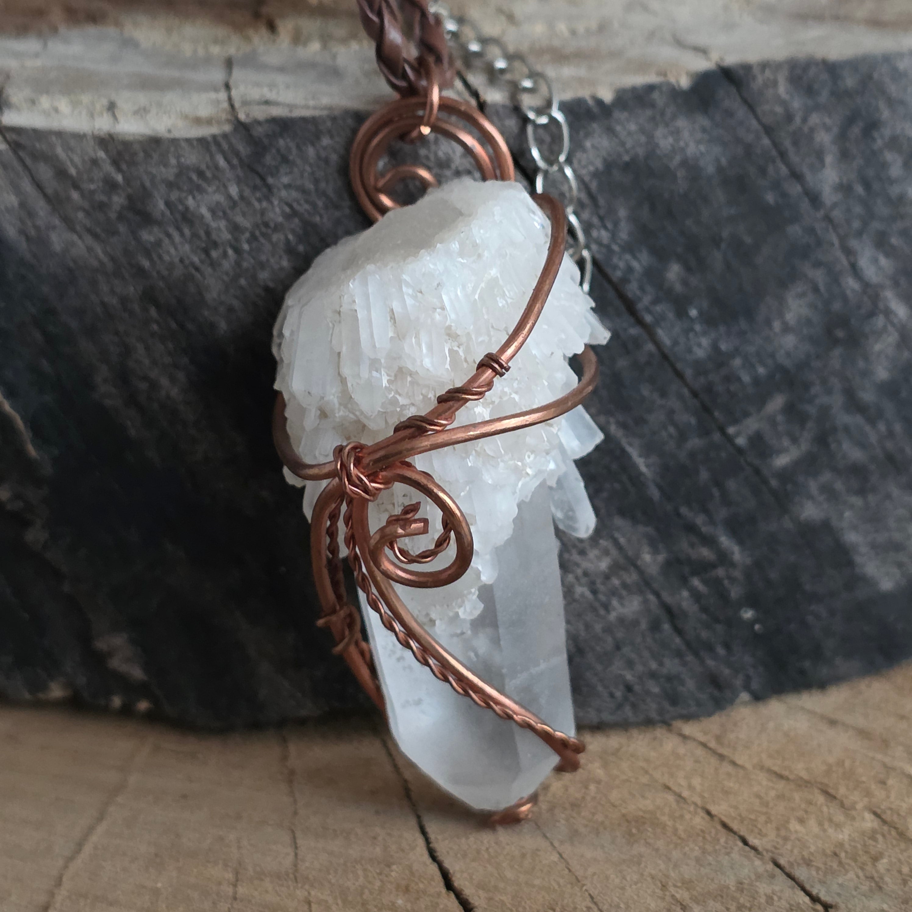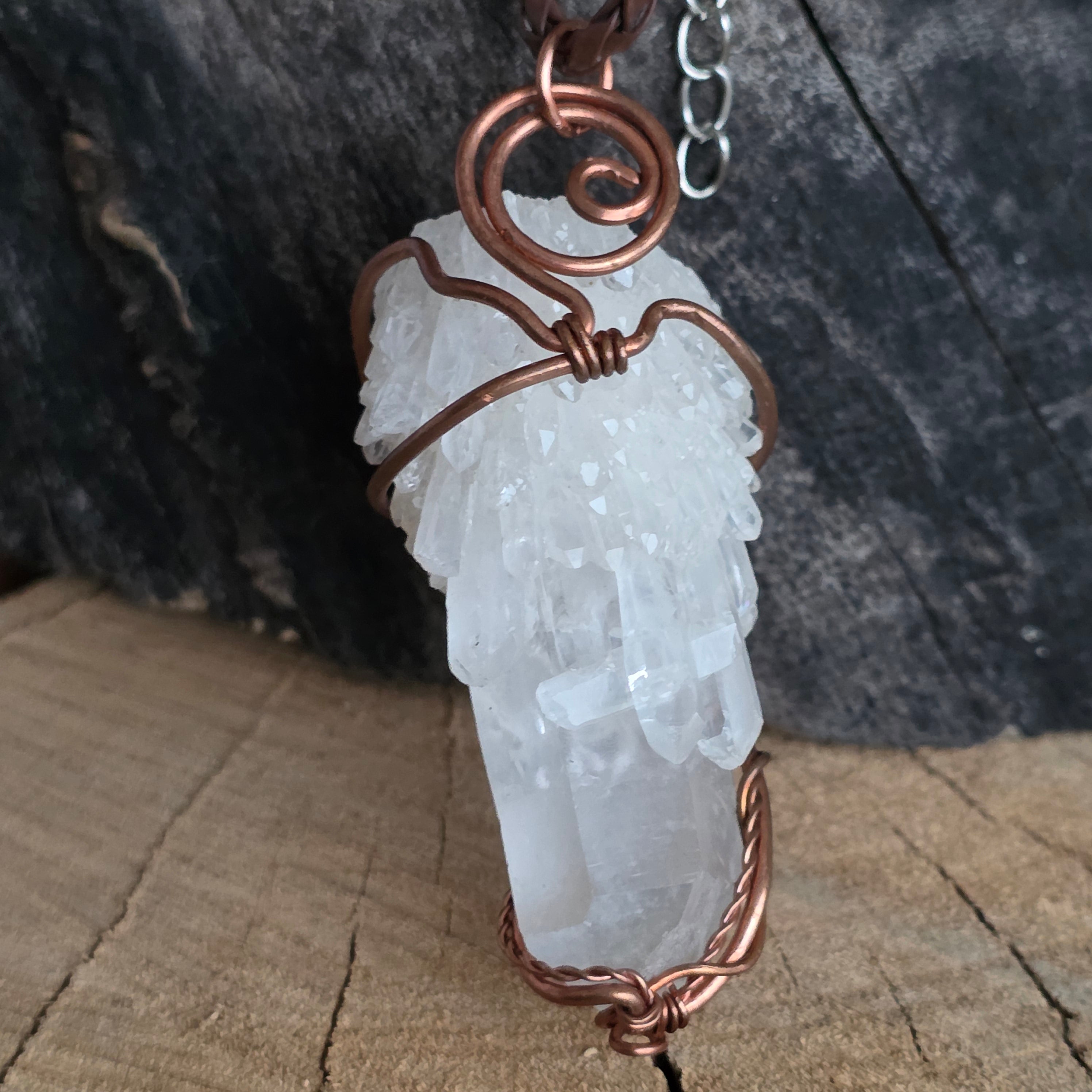 Cluster pendant necklace with clear quartz in copper/artistic wire m6