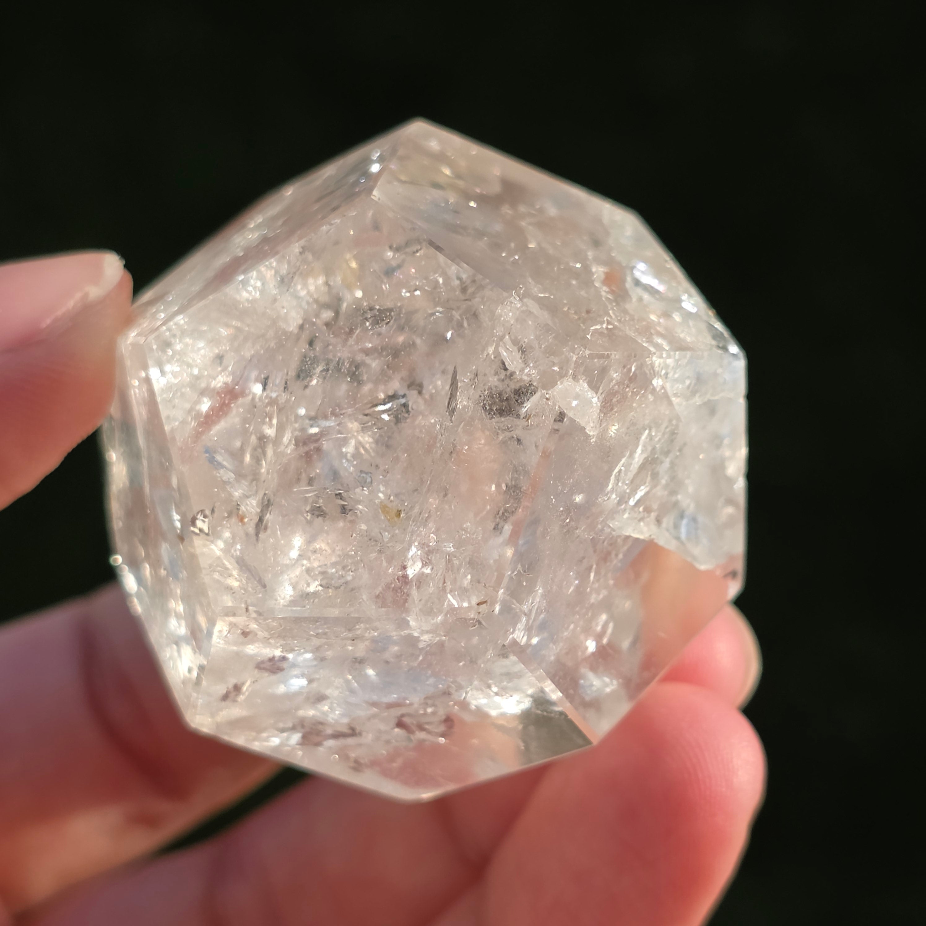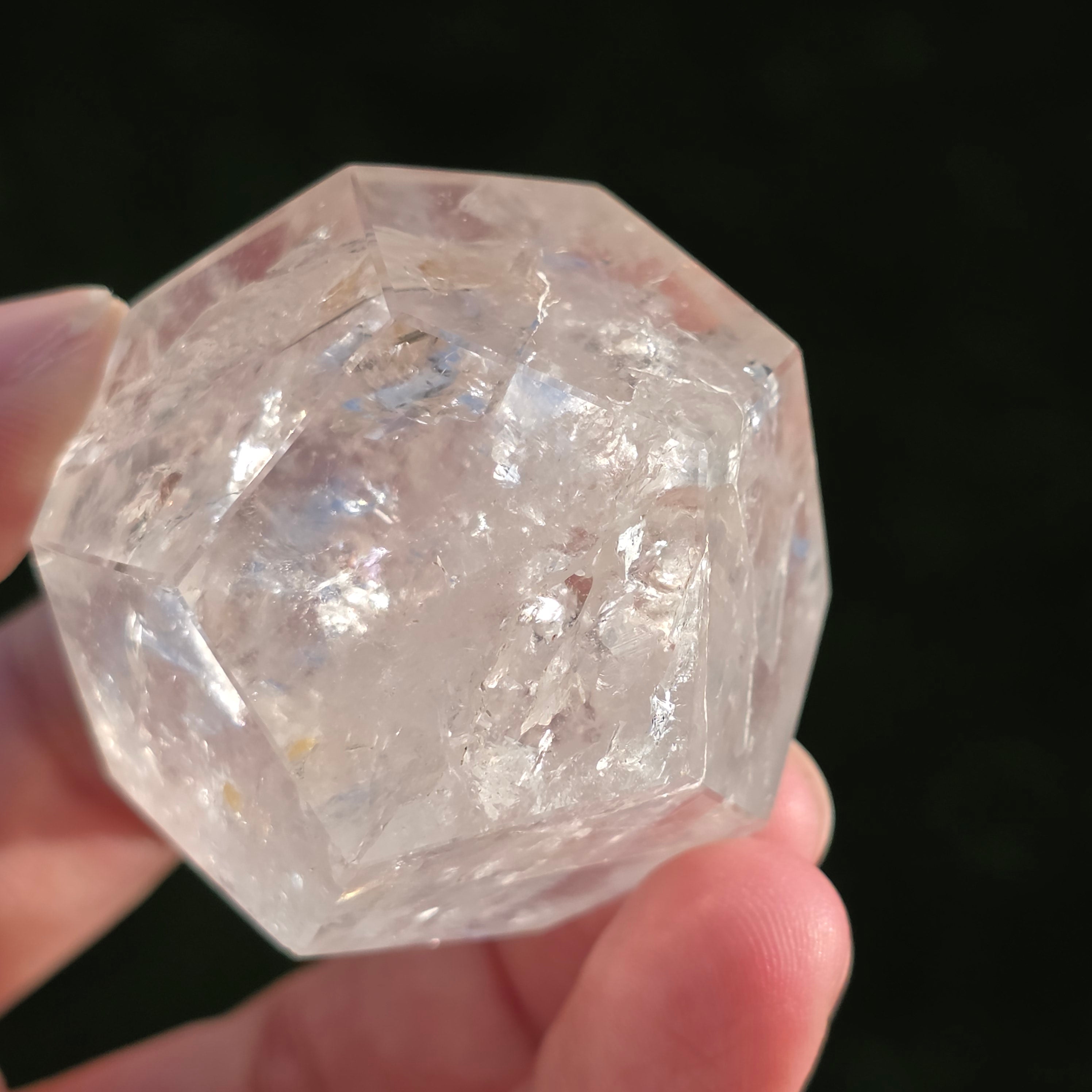 Colorless quartz icosahedron (rock crystal), meticulously hand-polished into a Platonic solid shape with 20 equilateral triangular faces.