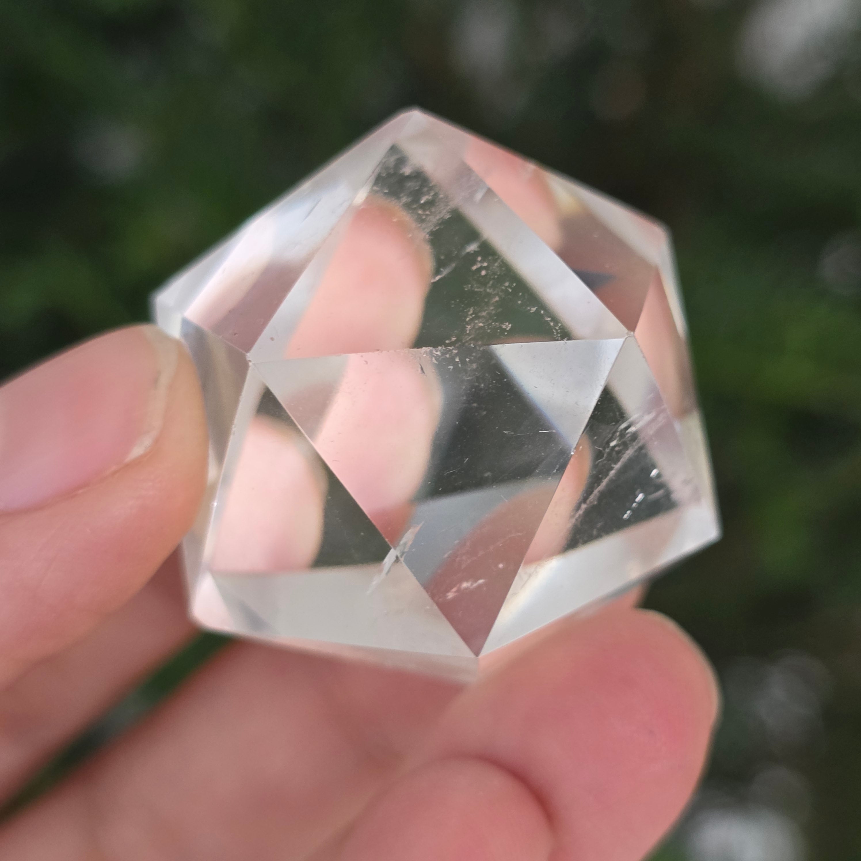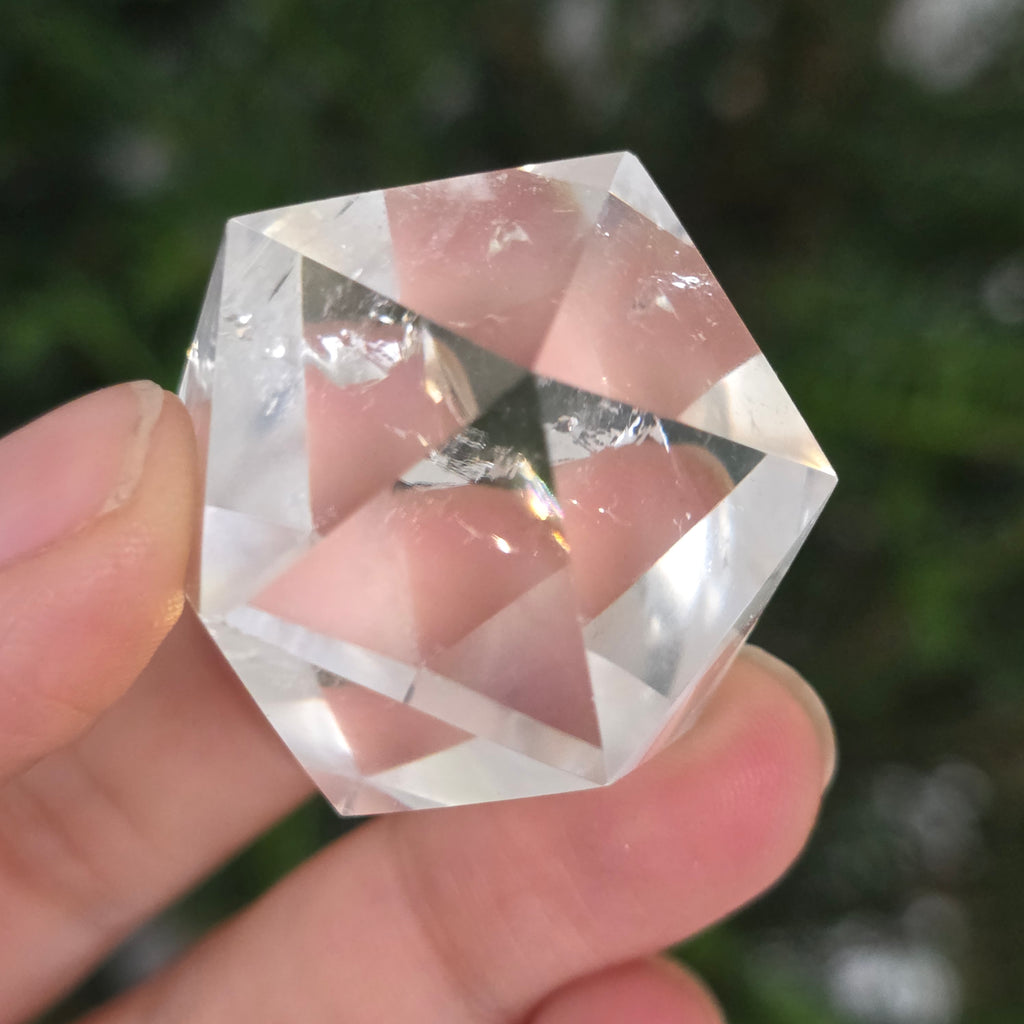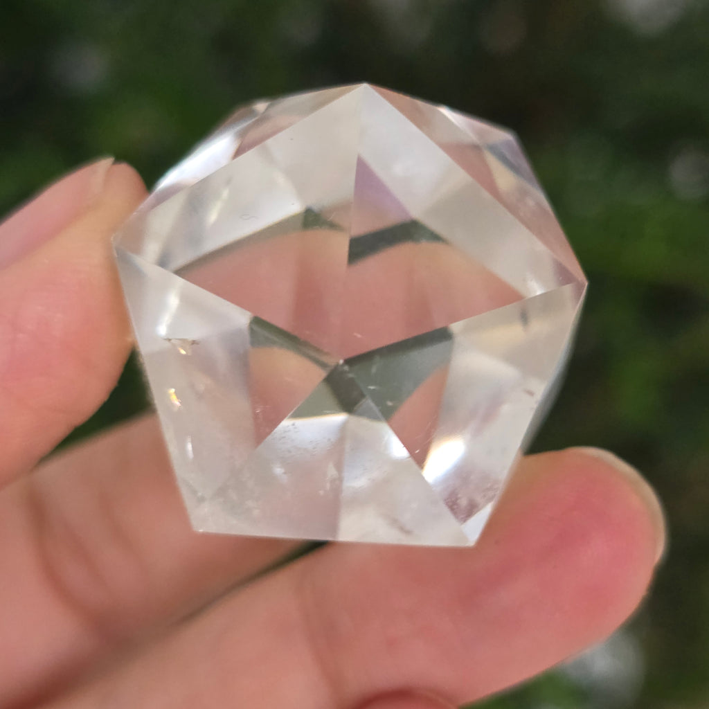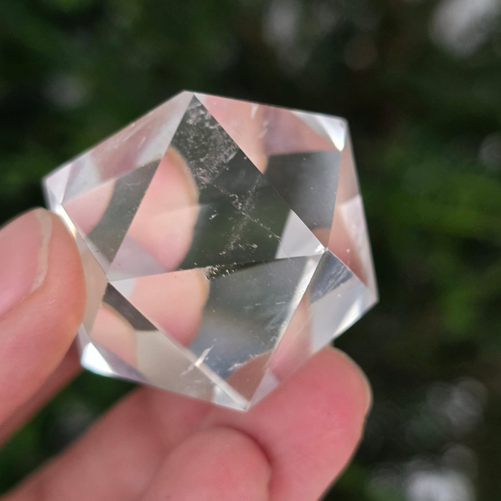 Colorless quartz icosahedron (rock crystal), precision hand-polished in the shape of a Platonic body with 20 equilateral triangular faces.