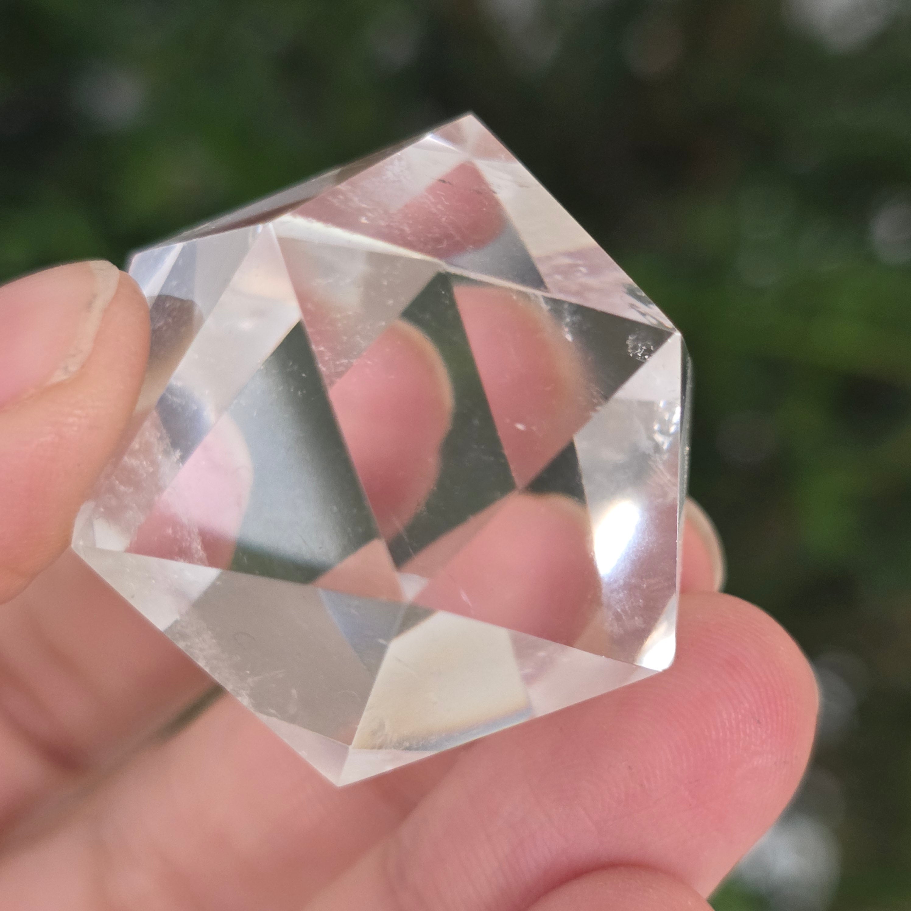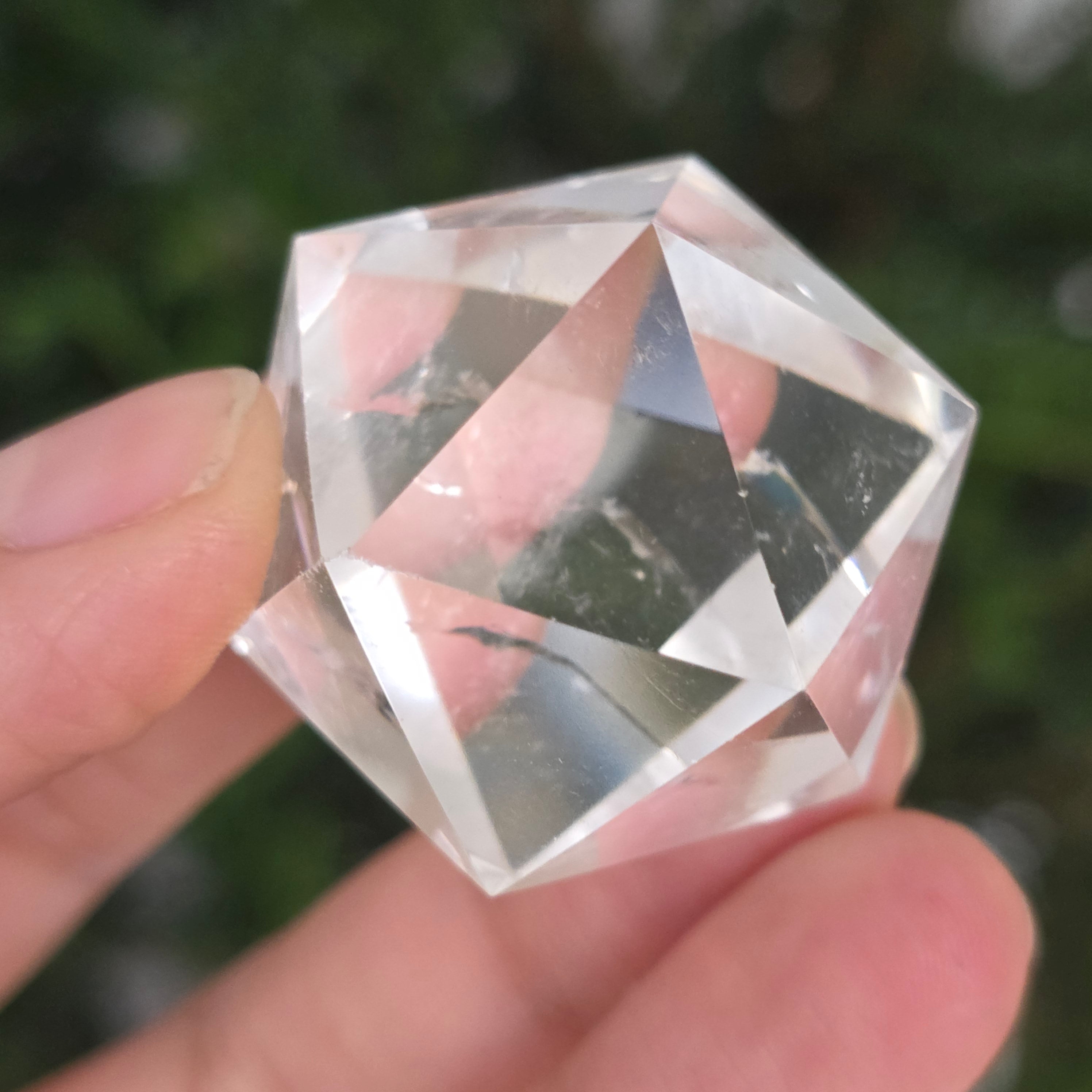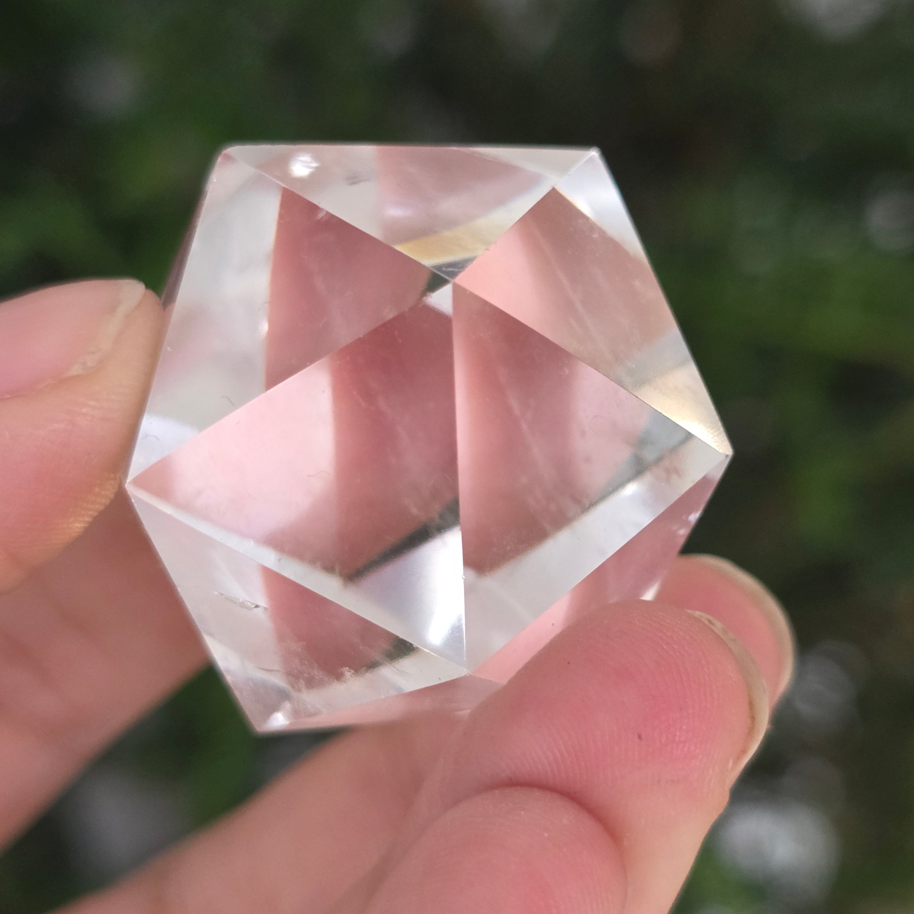 Colorless quartz icosahedron (rock crystal), precision hand-polished in the shape of a Platonic body with 20 equilateral triangular faces.