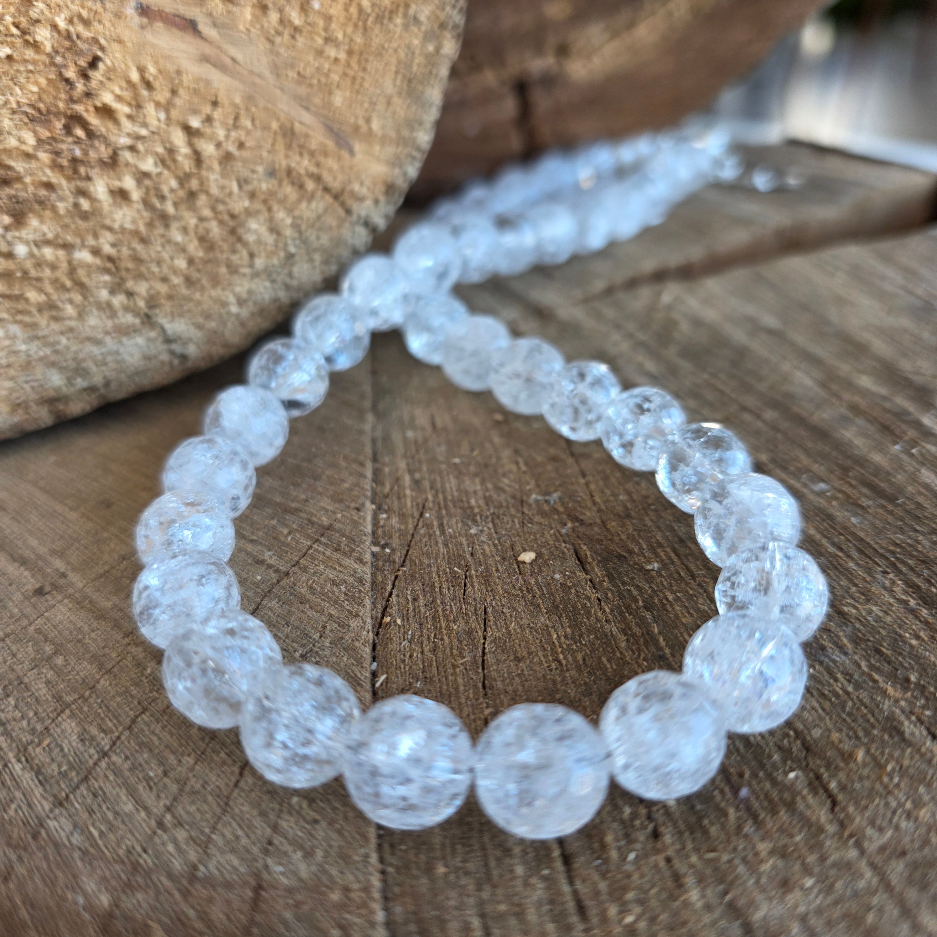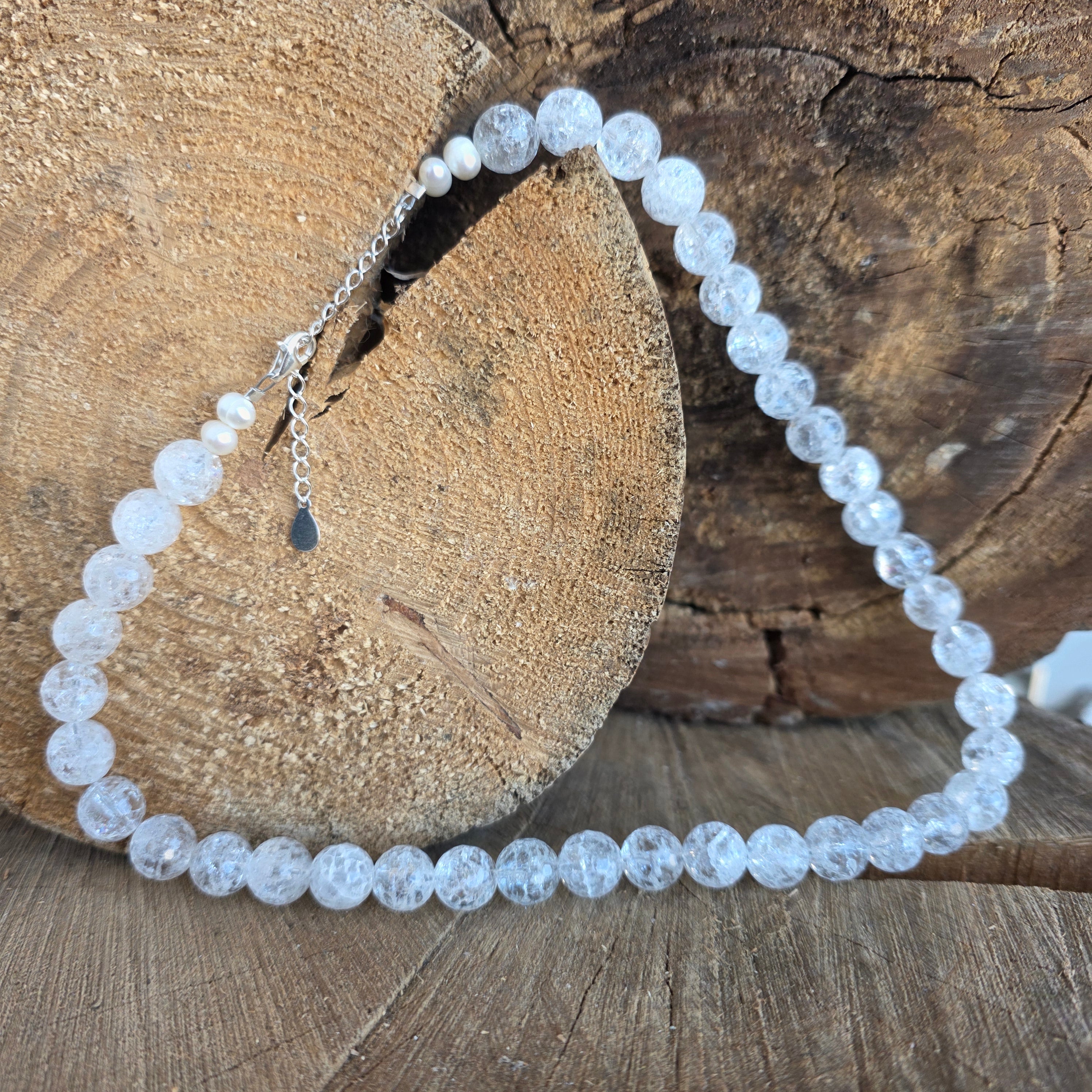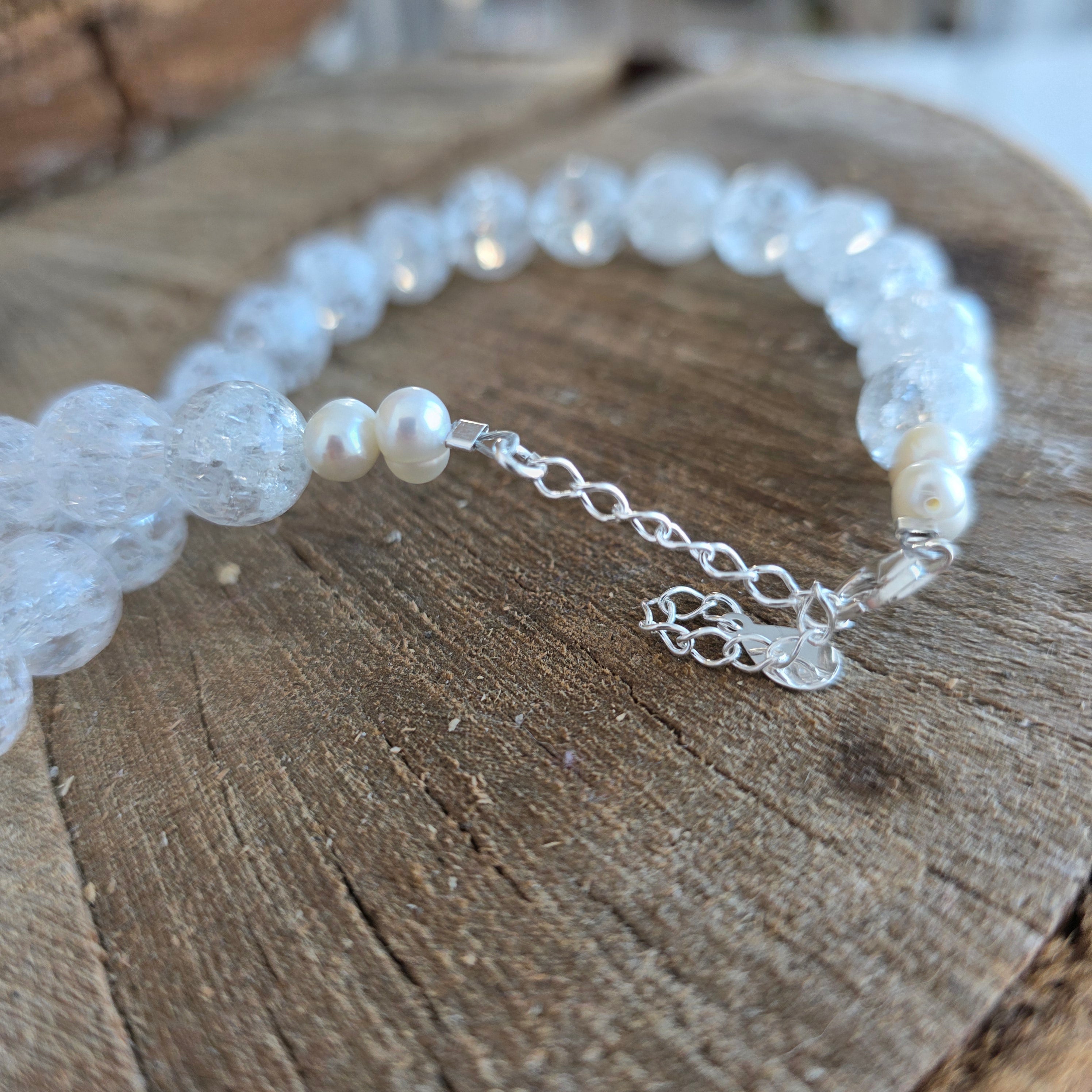 Design: large, transparent beads with an internal crackle effect that reflects light, complemented by four natural pearls with a soft luster
