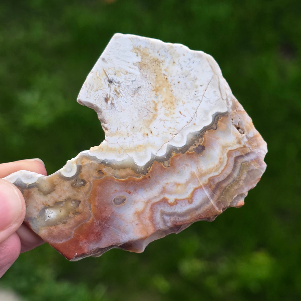 Mexican Crazy Agate is one of the most vibrant and spectacular varieties of agate, famous for its wavy lines and wild color patterns that seem drawn by a free hand, without rules. In this natural slice, small but extremely expressive, the entire story of the stone is revealed: earthy layers, warm caramel shades, bright red, orange, gray, and cream, mixed in spiral patterns that seem to pulse with life.