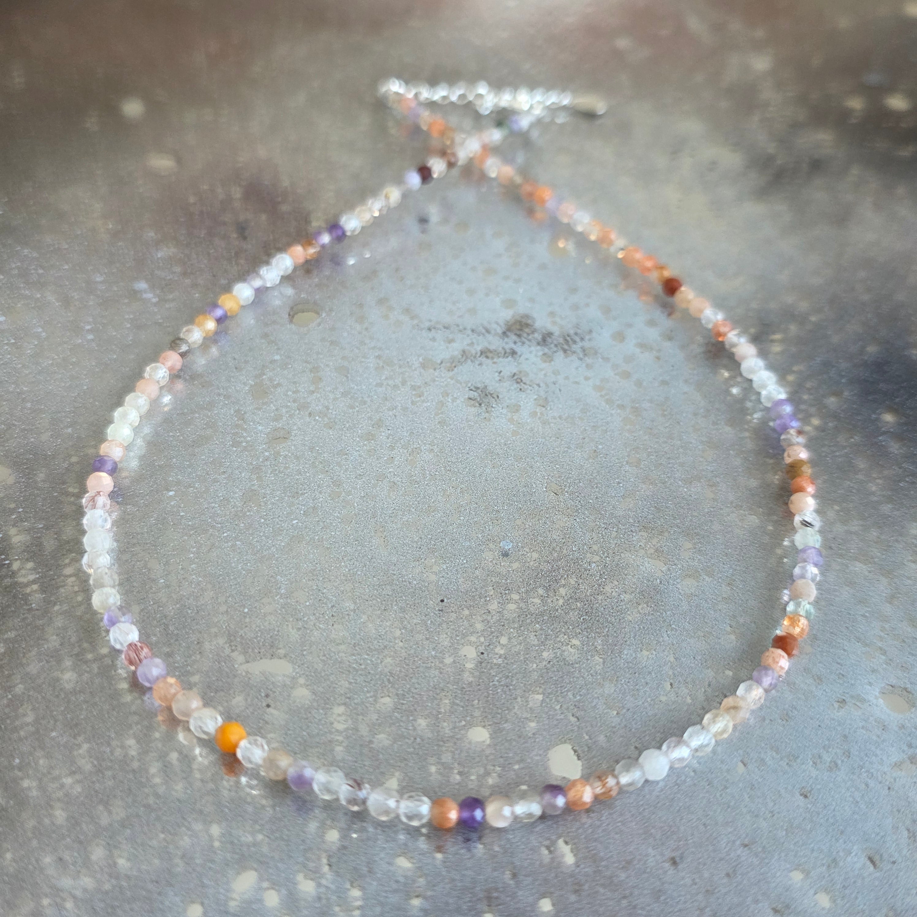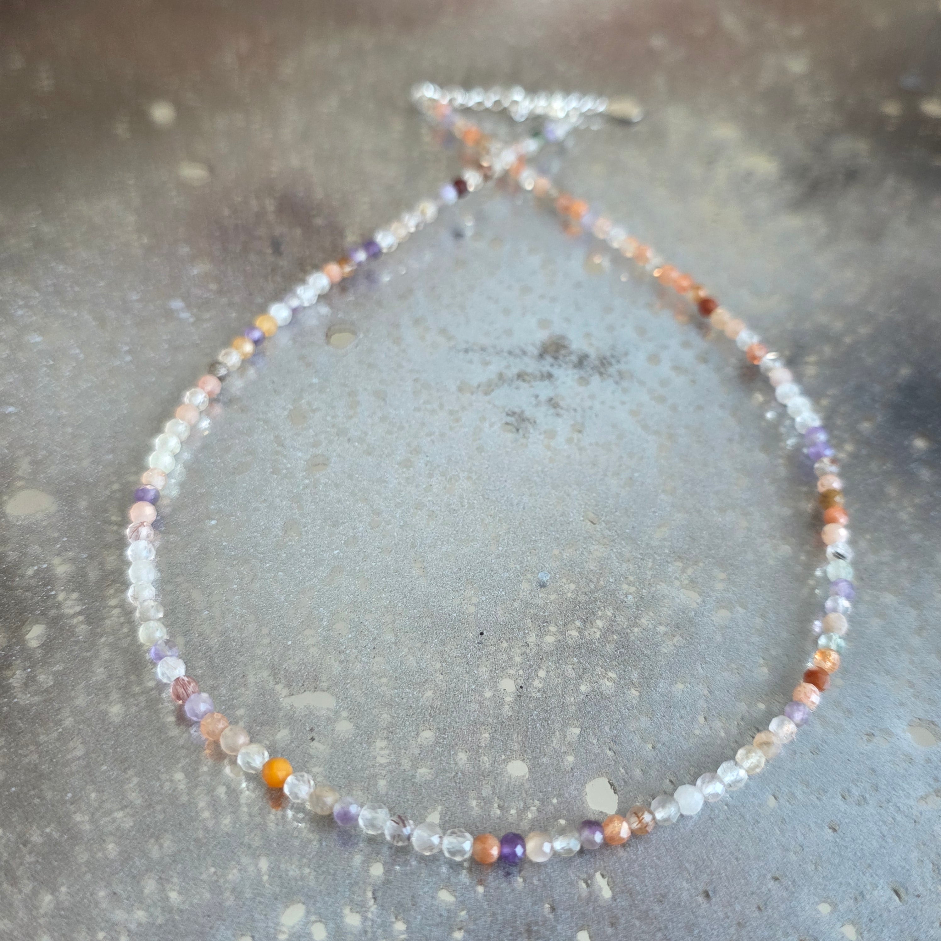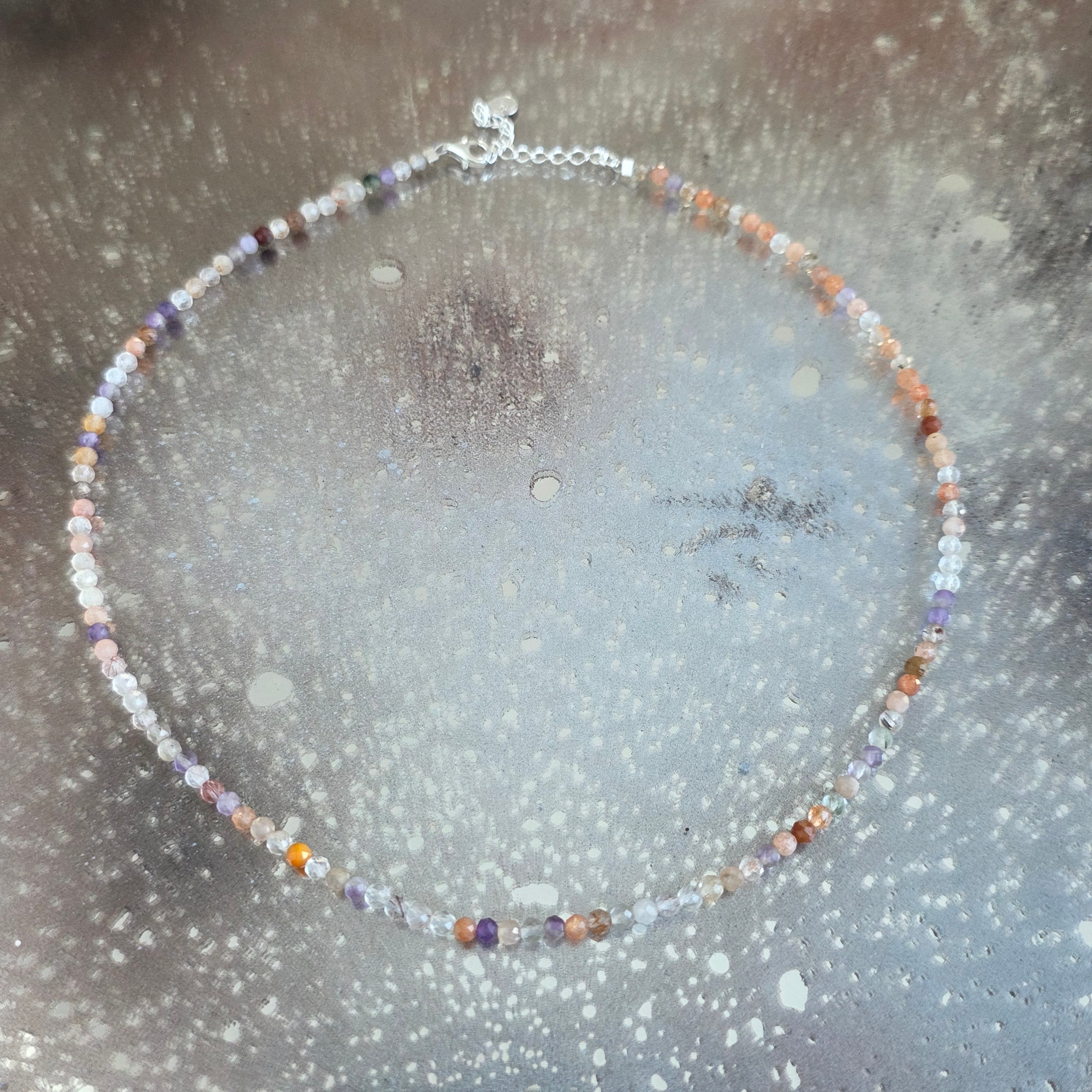 A balanced and harmonious necklace, made of 3.5 mm faceted beads, combining four types of quartz and crystals in a carefully chosen sequence: colorless quartz, amethyst, carnelian, and green quartz. Each stone contributes its own shade and texture, creating a subtle yet coherent color play, in which transparency, calm violet, warm orange tones, and fresh green naturally complement each other. The fine faceting adds discreet reflections, maintaining an elegant and well-proportioned appearance.