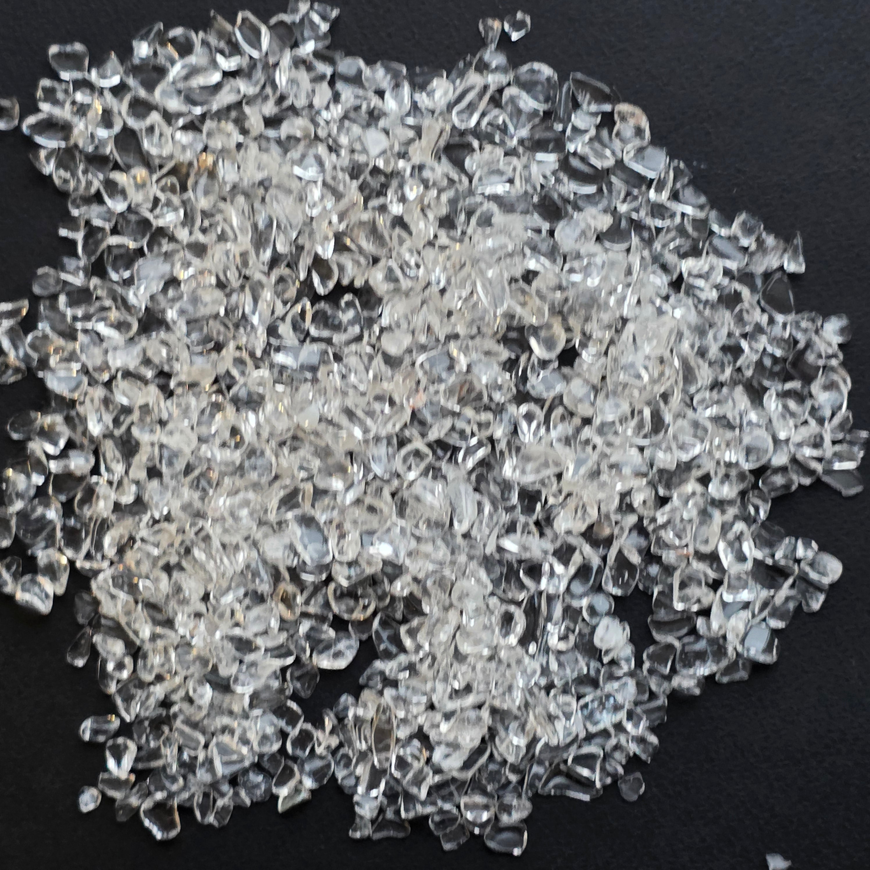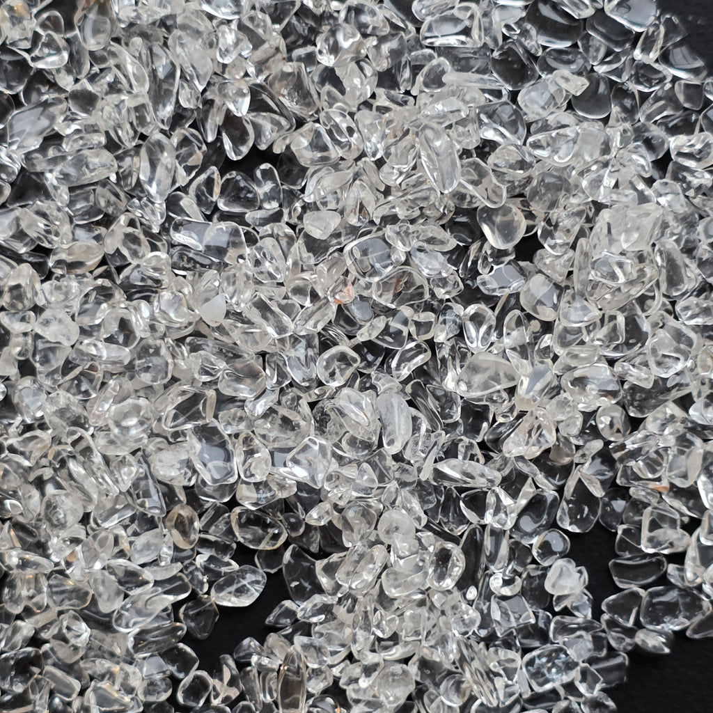 Pietrele mici, de 6–8 mm, sunt șlefuite cu grijă pentru a păstra forma lor neregulată și frumusețea organică. Culorile variază armonios – unele chipsuri sunt luminoase, cu transparență solară, în timp ce altele prezintă tonuri mai intense, aproape roșiatice, creând un amestec cald și dinamic.