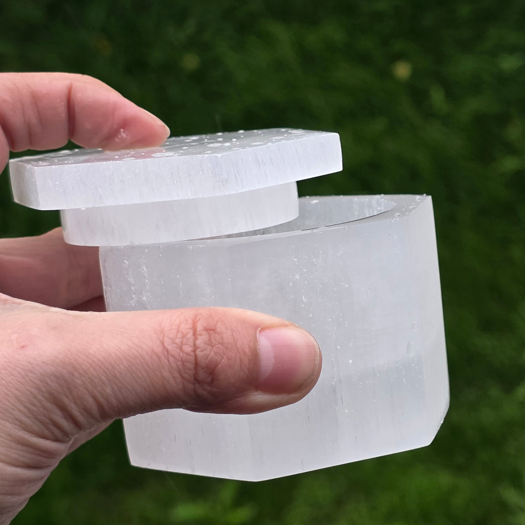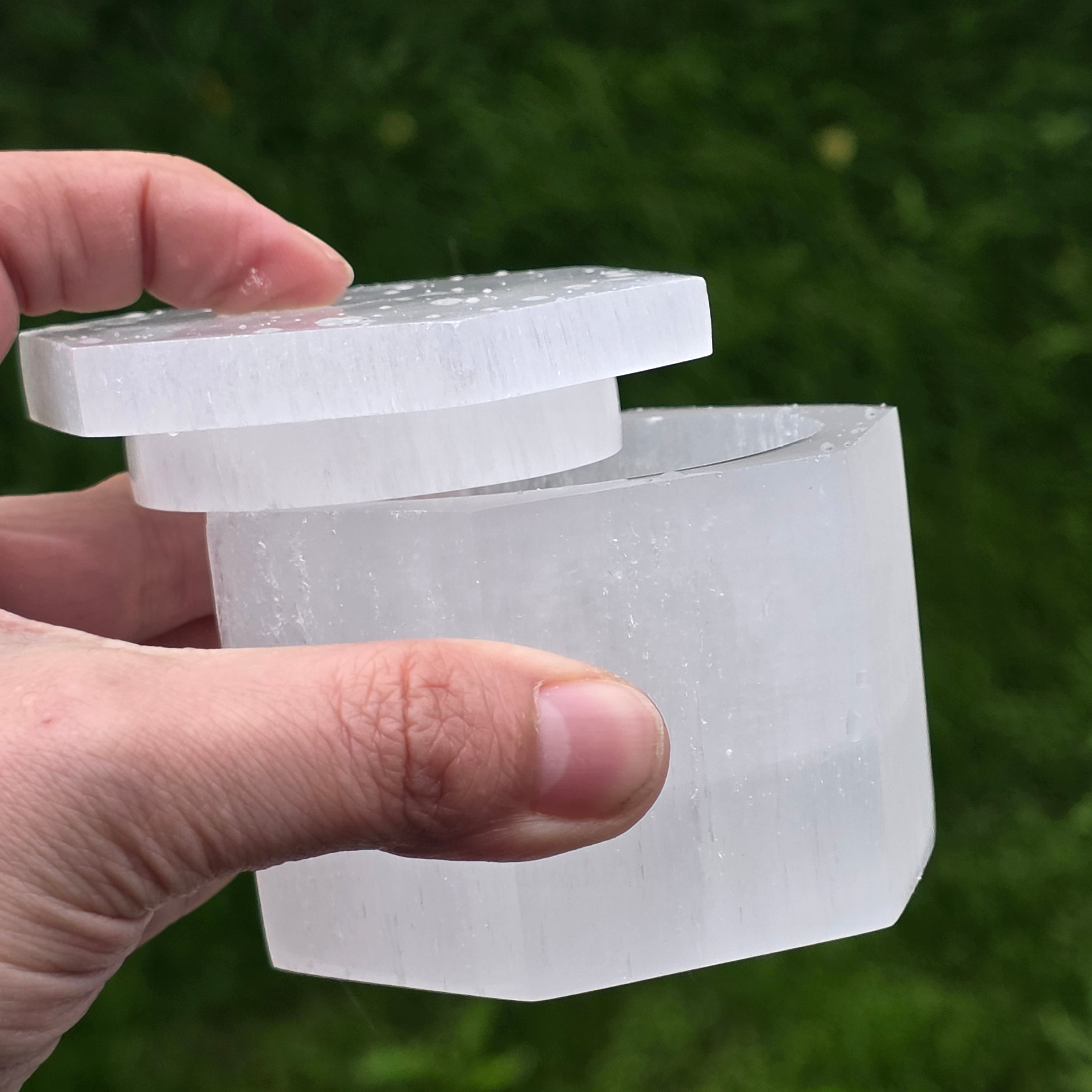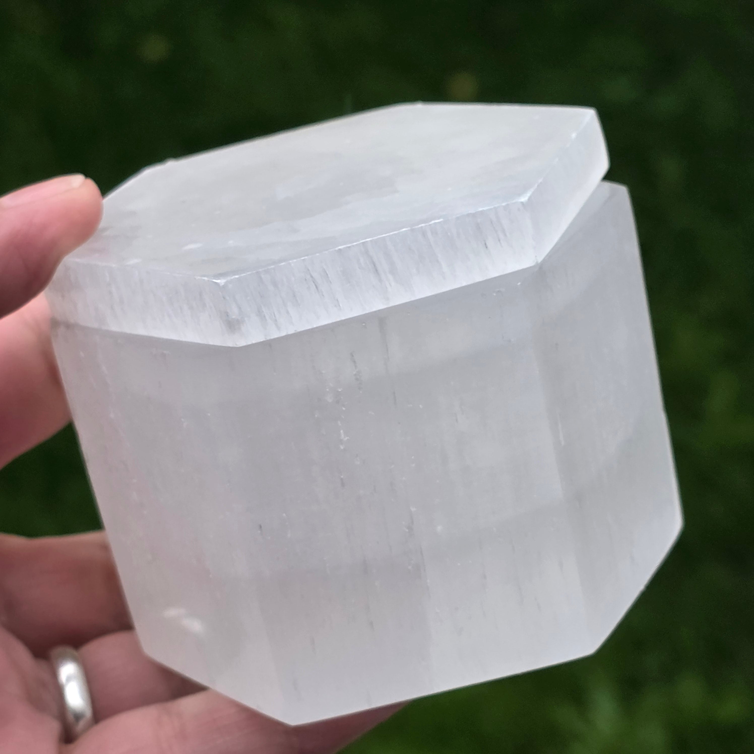 Cutia hexagonală din Selenit este o piesă care îmbină geometria pură cu lumina delicată a acestui mineral atât de apreciat. Sculptată manual din selenit marocan, păstrează acel aspect translucid, mătăsos, care pare să absoarbă și să reflecte lumina într-un mod calm, ordonat, aproape ceremonios.