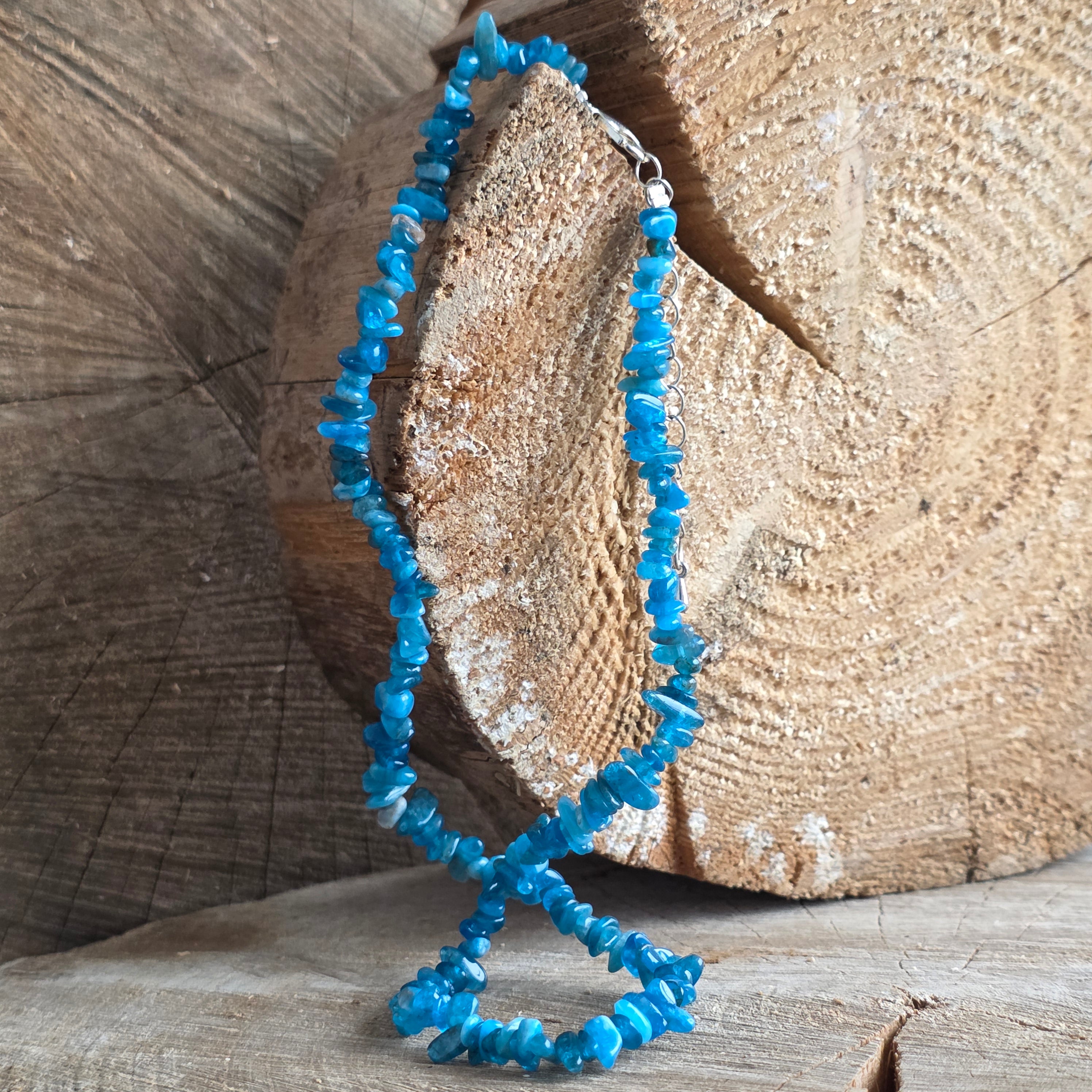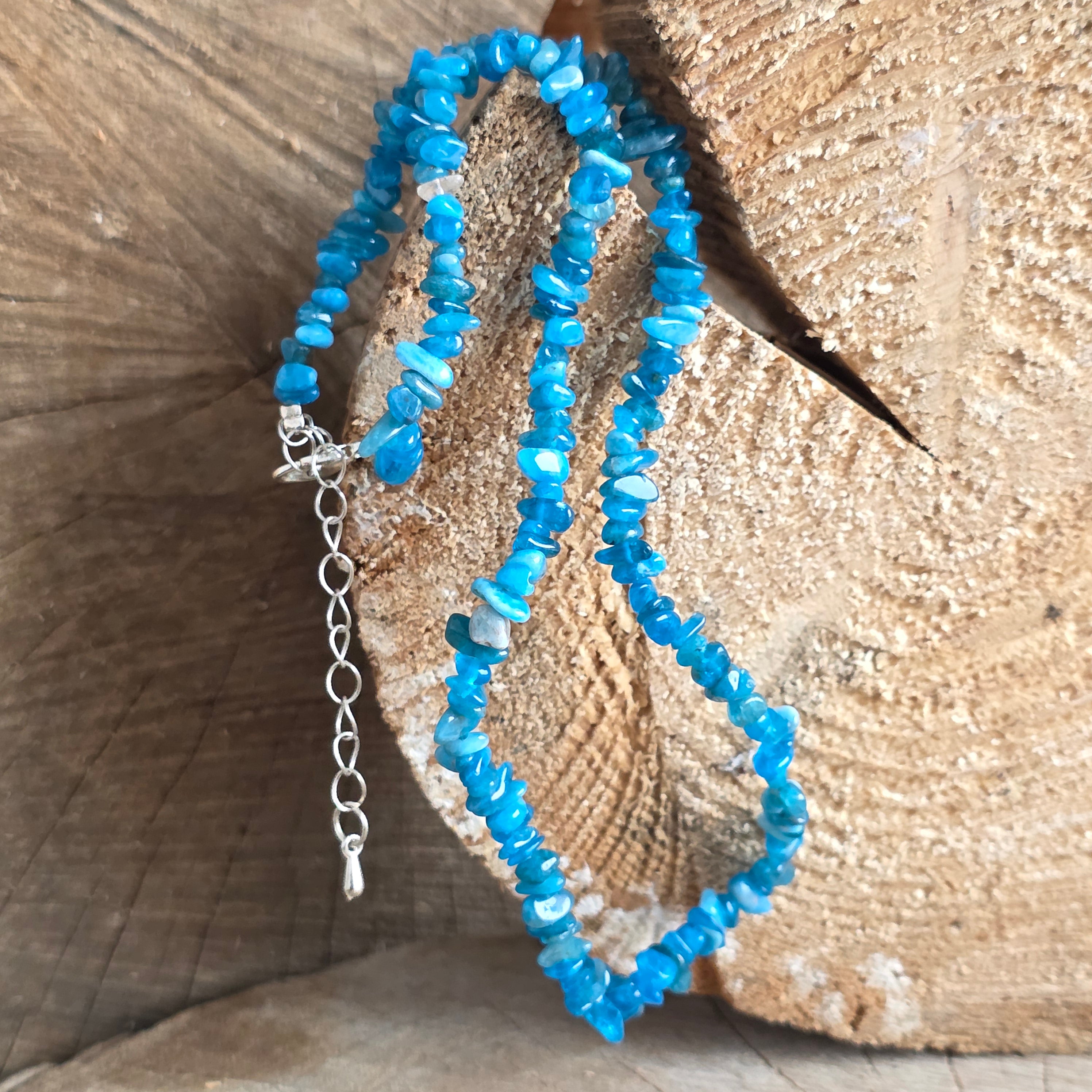 Add extra color and energy to your outfits with this necklace made of vibrantly colored natural apatite chips, mounted on a 40 cm fine chain, with a 5 cm metal extension for a perfect fit.