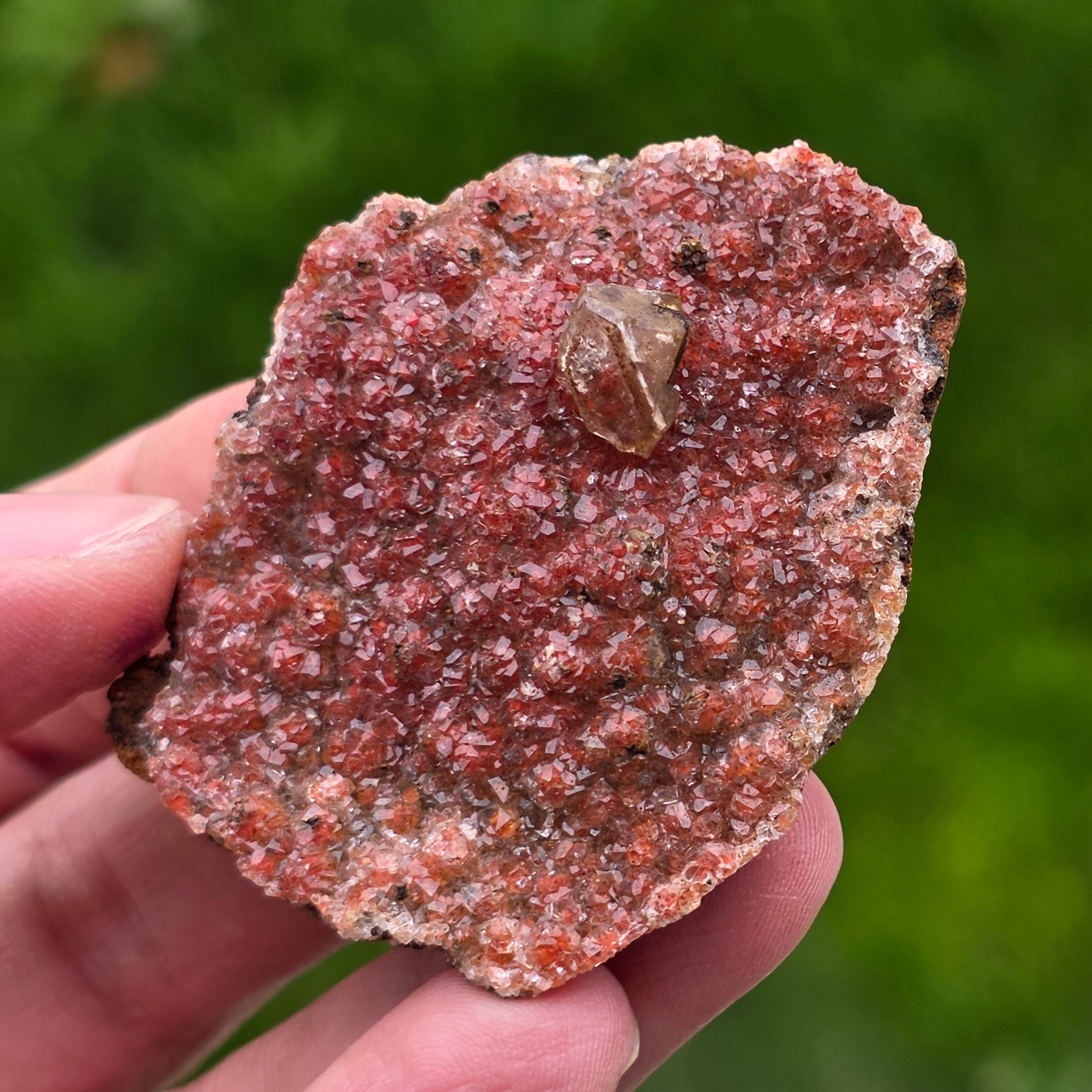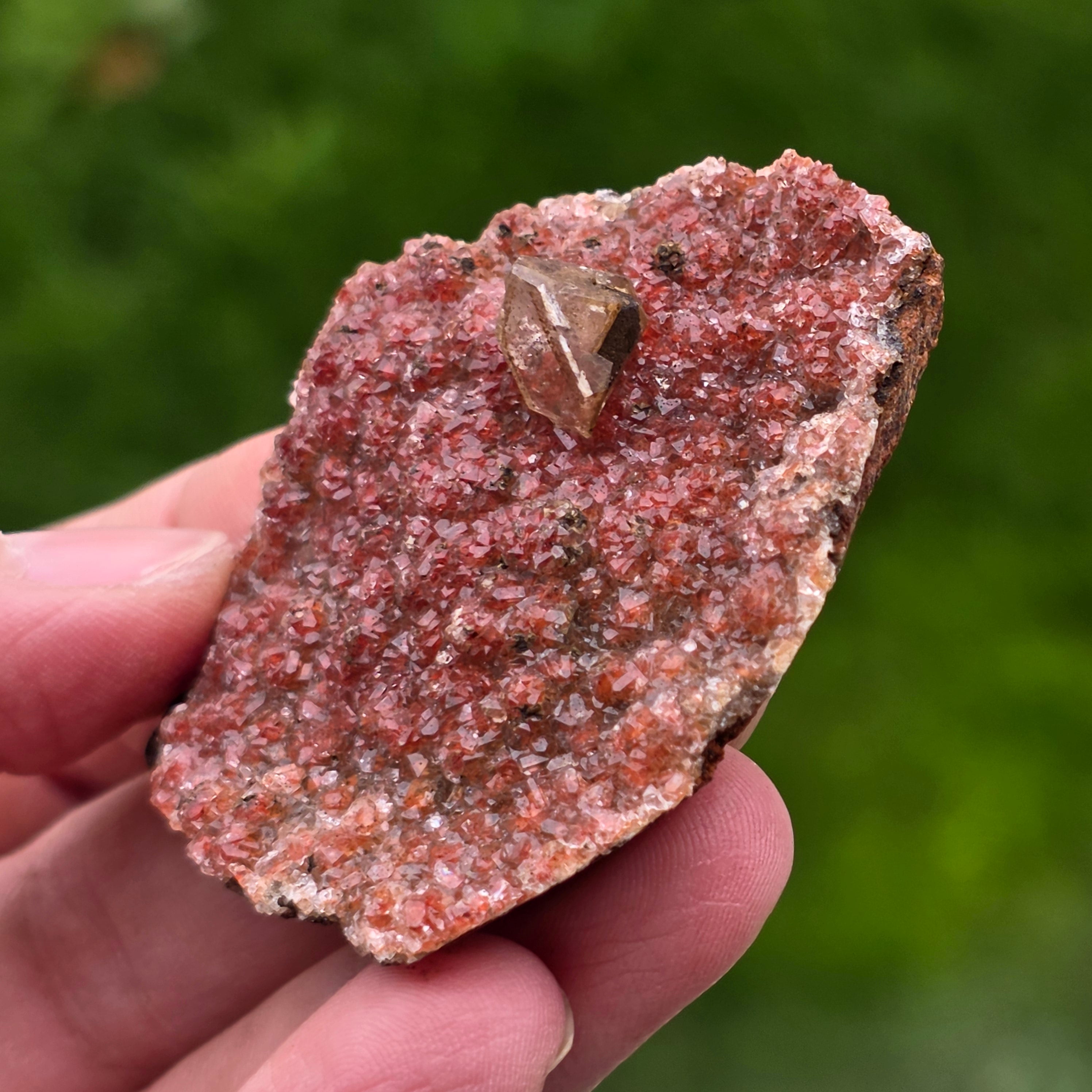 Calcite crystals have a specific habit called "diamond calcite", characterized by Well-defined endings and shiny faces, which reflects light in a subtle yet expressive way. The compact arrangement of the crystals creates a shimmering, richly textured surface, with each piece different in shape, color intensity, and crystal distribution.