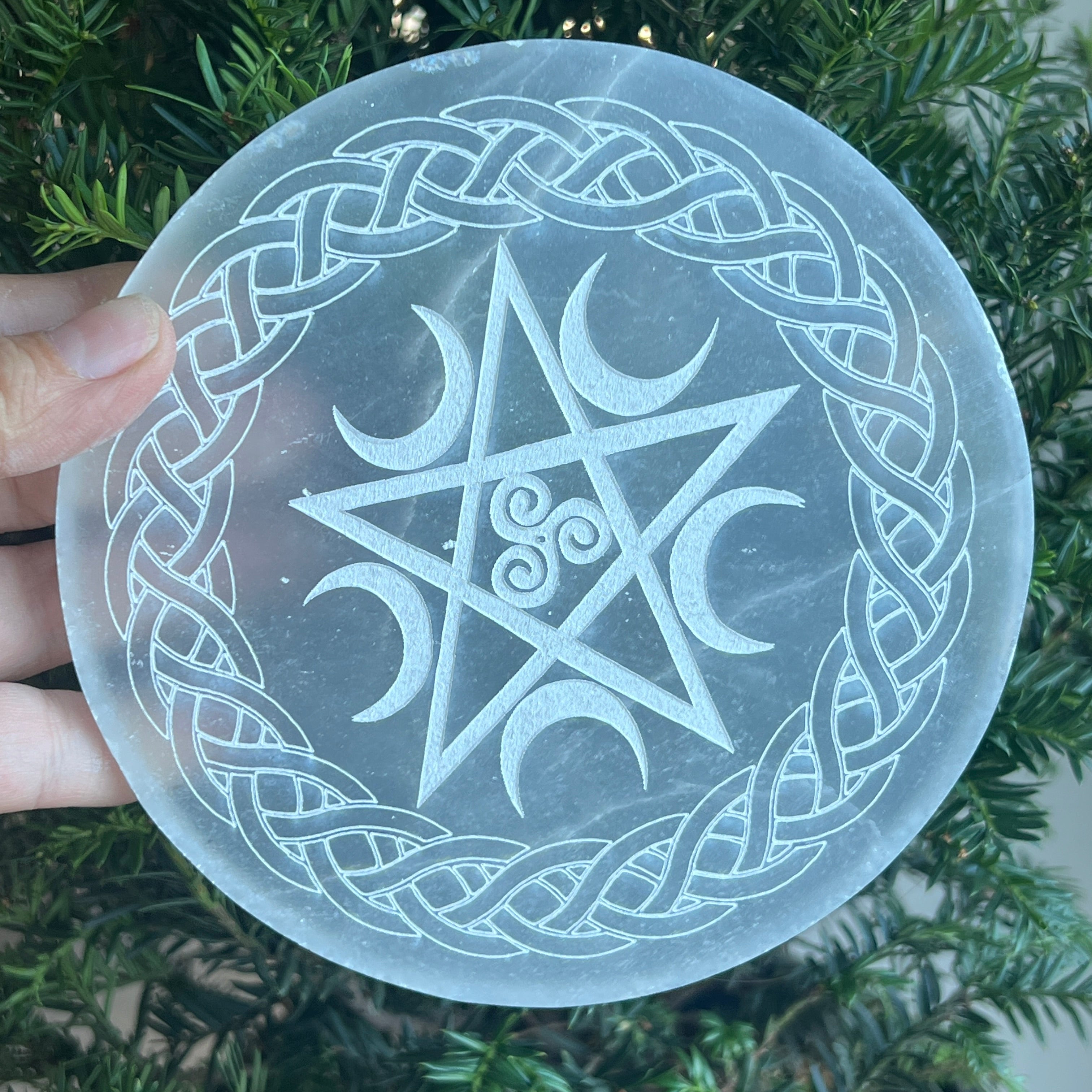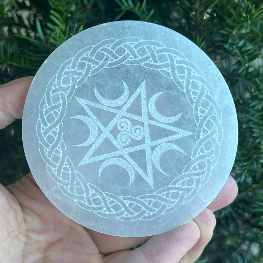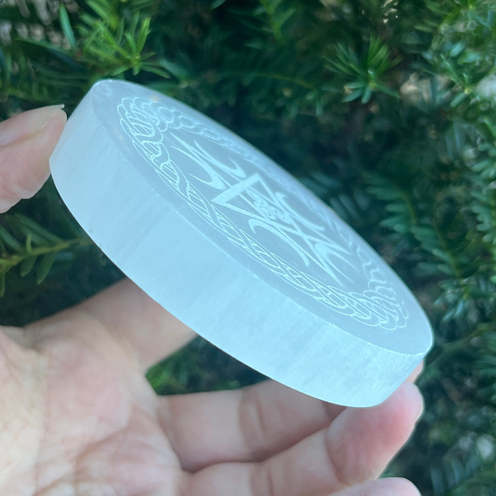 Discul din Selenit gravat cu simboluri sacre este o piesă de o frumusețe aparte, în care energia purificatoare a mineralului se împletește cu semnificația profundă a simbolurilor antice. Pentagrama, simbol al protecției și al echilibrului elementelor, și Crucea Celtică, reprezentare a uniunii dintre cer și pământ, se regăsesc gravate fin pe suprafața translucidă a pietrei.