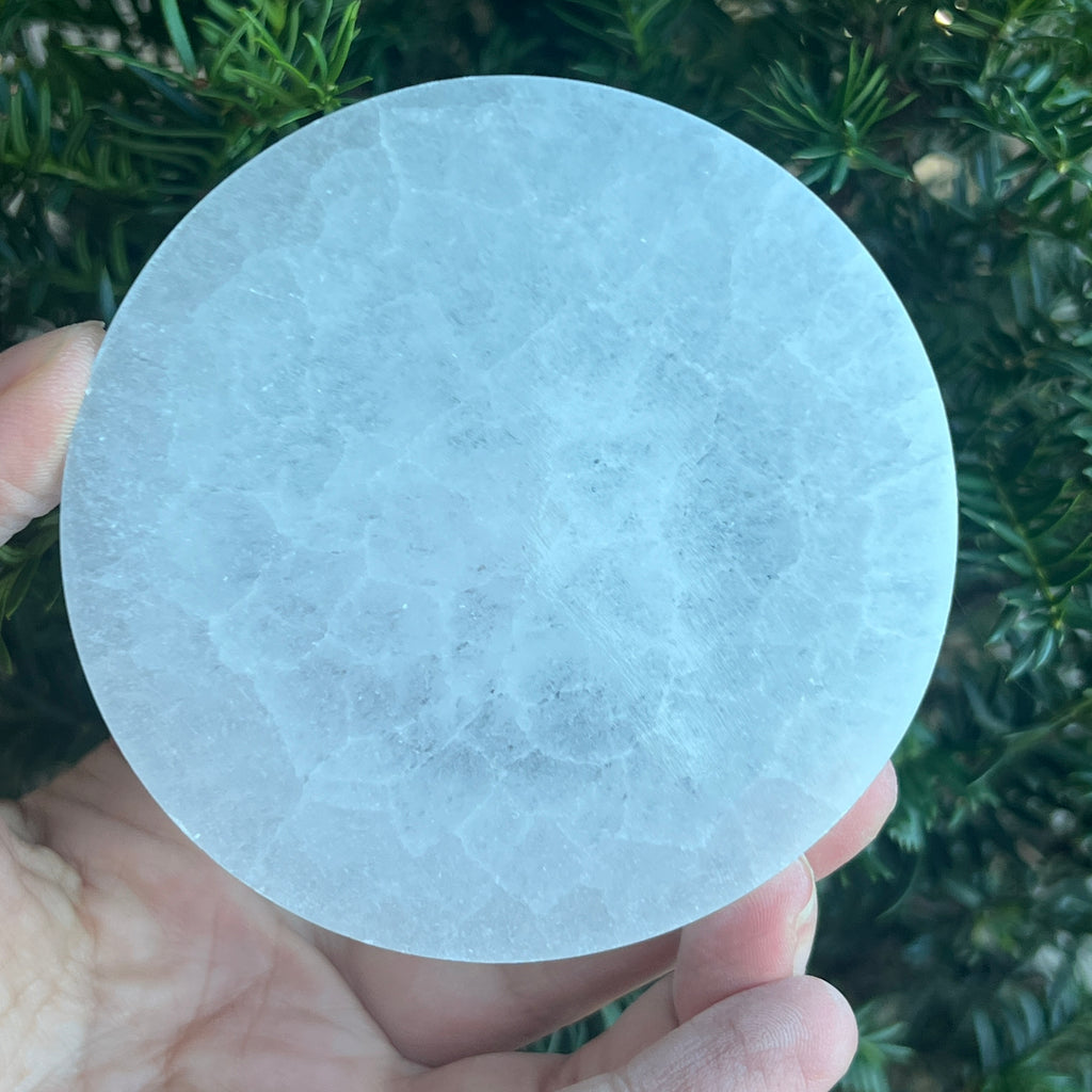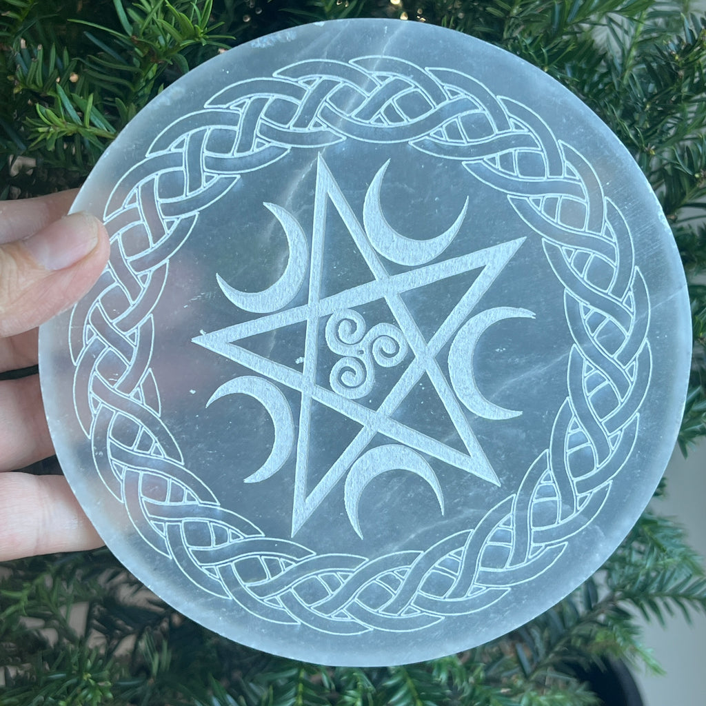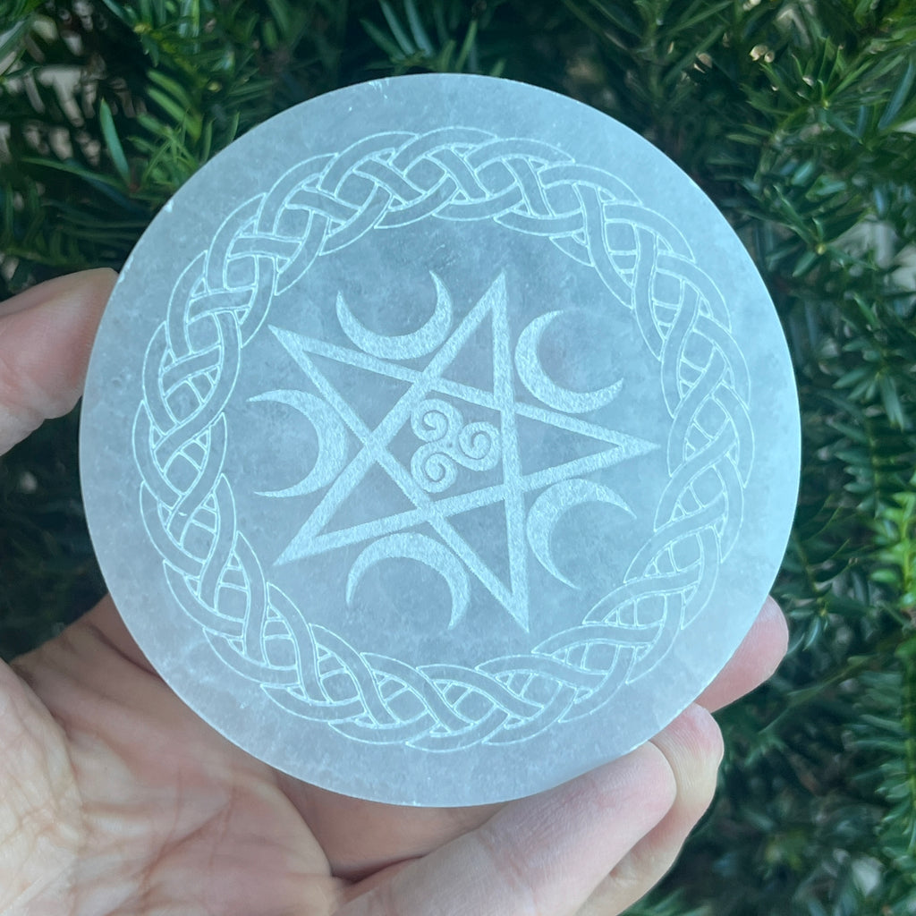 Discul din Selenit gravat cu simboluri sacre este o piesă de o frumusețe aparte, în care energia purificatoare a mineralului se împletește cu semnificația profundă a simbolurilor antice. Pentagrama, simbol al protecției și al echilibrului elementelor, și Crucea Celtică, reprezentare a uniunii dintre cer și pământ, se regăsesc gravate fin pe suprafața translucidă a pietrei.