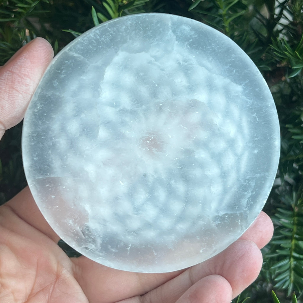 Discul Thorus din selenit natural este o reprezentare armonioasă a energiei sacre a vieții. Forma sa circulară, ce evocă simbolul toroidal, reflectă fluxul continuu al energiei universale – curgerea fără început și fără sfârșit dintre lumină și materie.