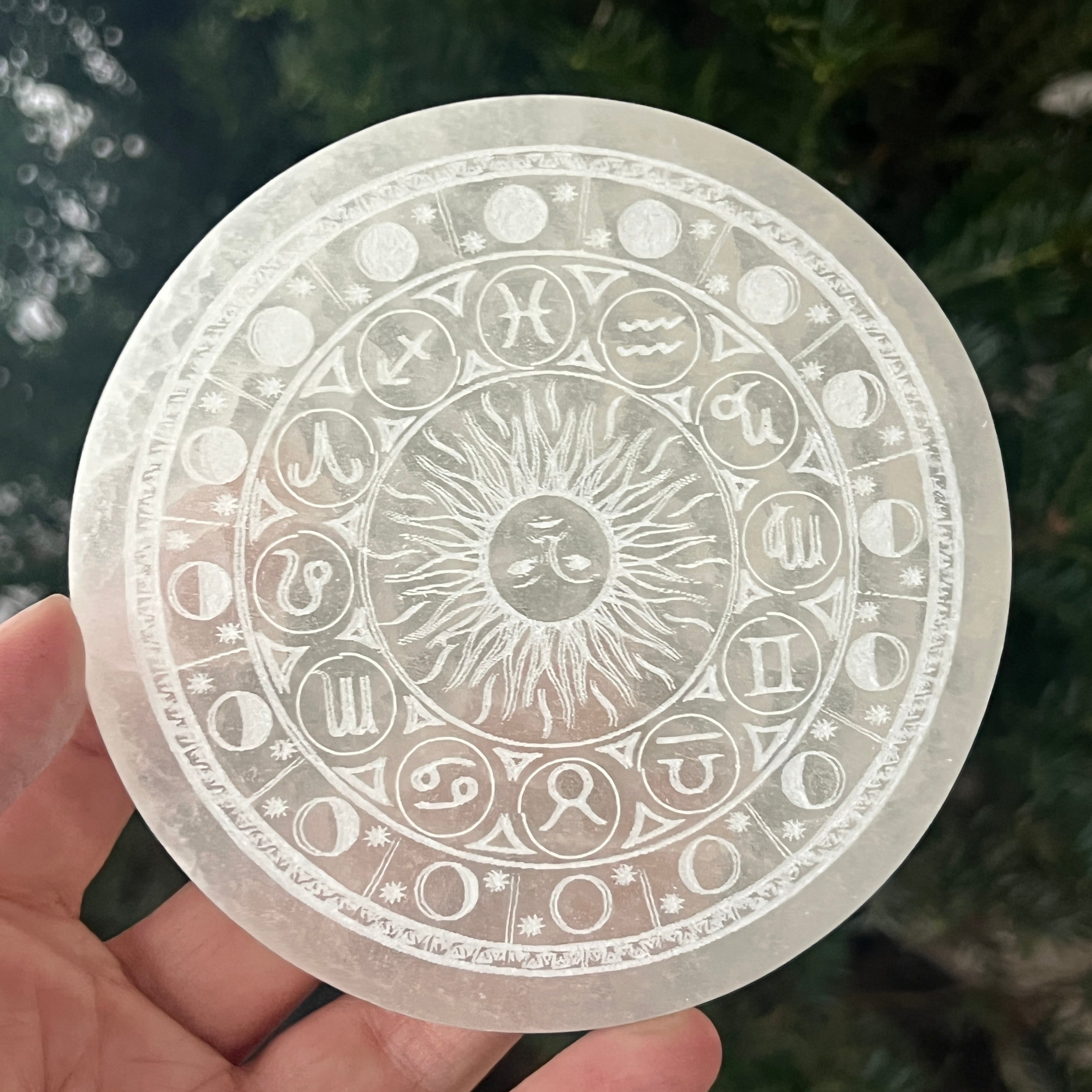 Alege acest disc din Selenit cu simboluri zodiacale ca instrument de purificare și reconectare la ritmurile universului.