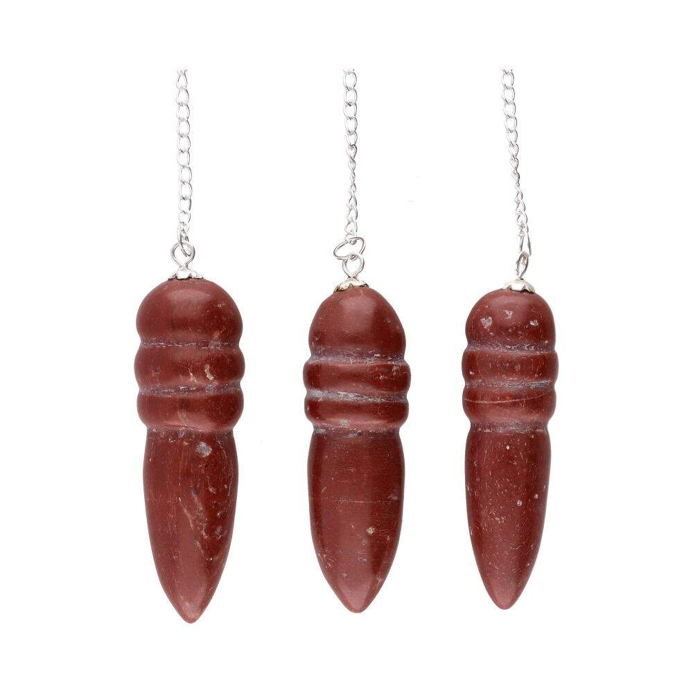 The pendulum is made of red jasper, a stone known for its intense color and compact texture. In crystal therapy traditions, red jasper is associated with stability, vital energy, and inner balance, being considered a stone that supports concentration and grounding.