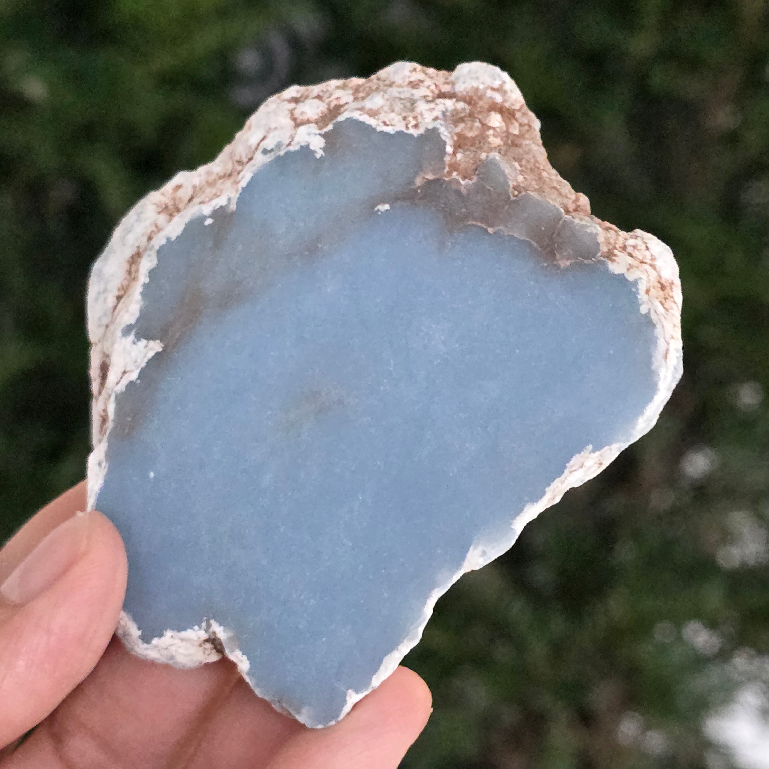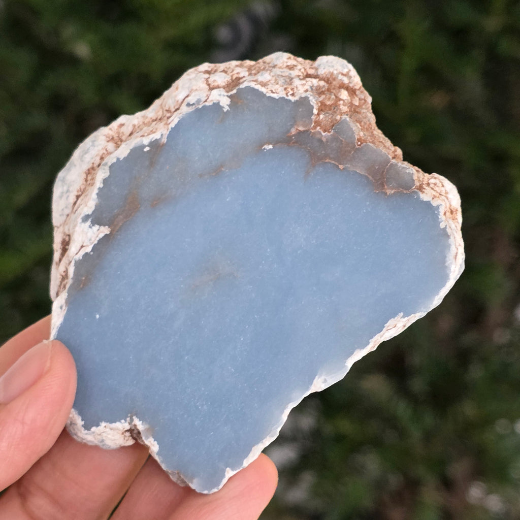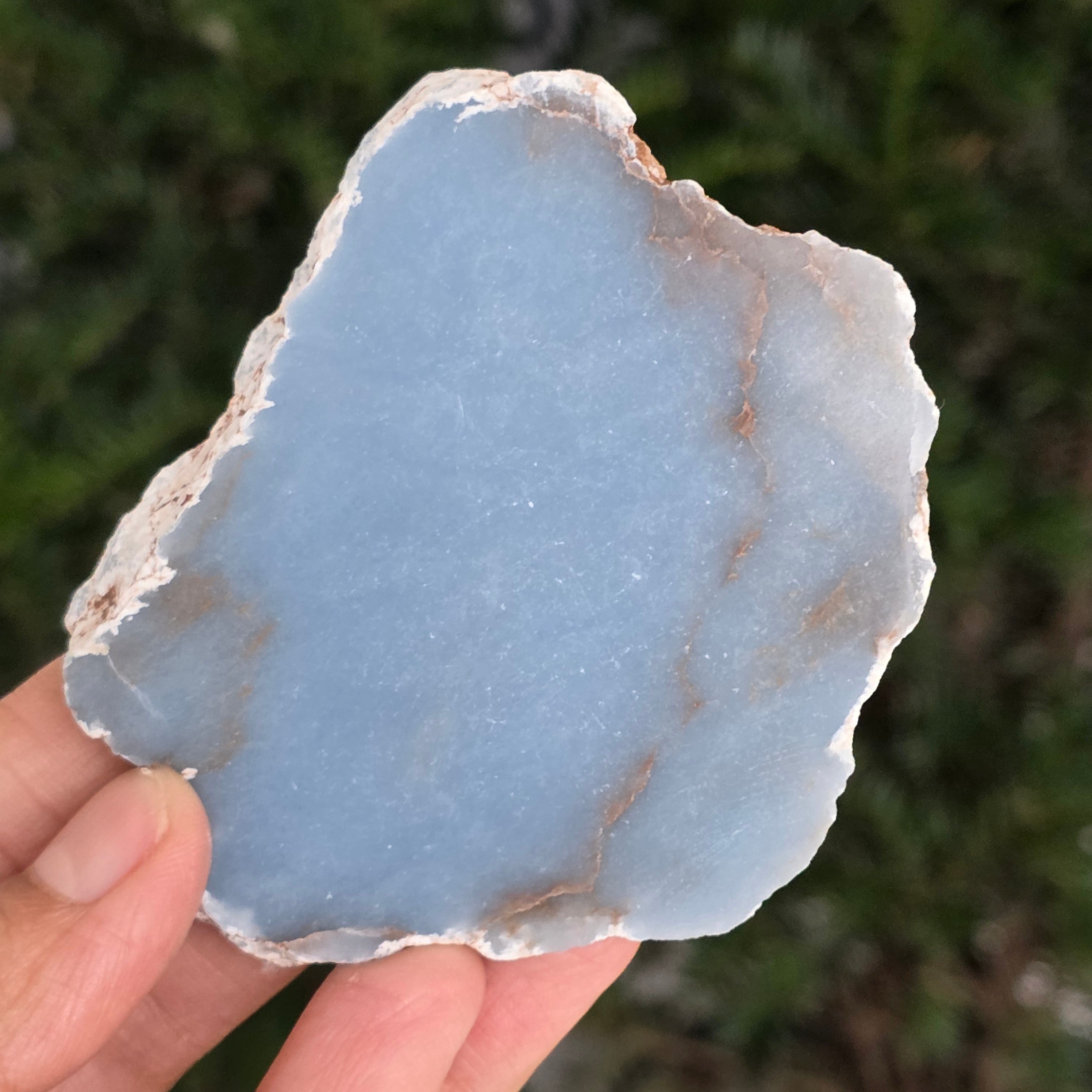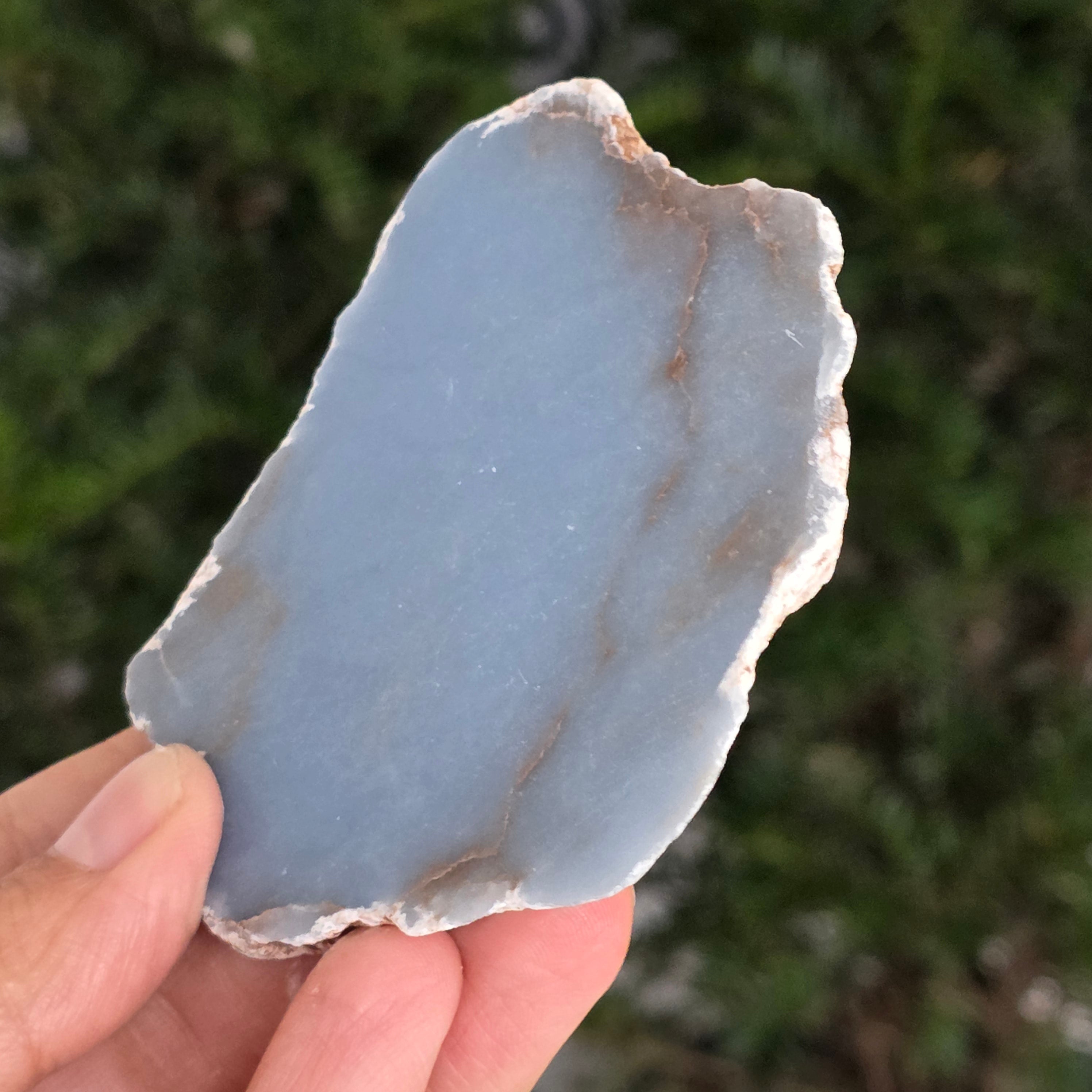 O piesă rară, ce pare desprinsă din seninul cerului. Această felie de angelit natural, dezvăluie un albastru delicat, lăptos, străbătut de nuanțe fine de gri și alb sidefat. Suprafața netedă și textura sa mată emană liniște și puritate – o bijuterie minerală a calmului și a echilibrului interior.