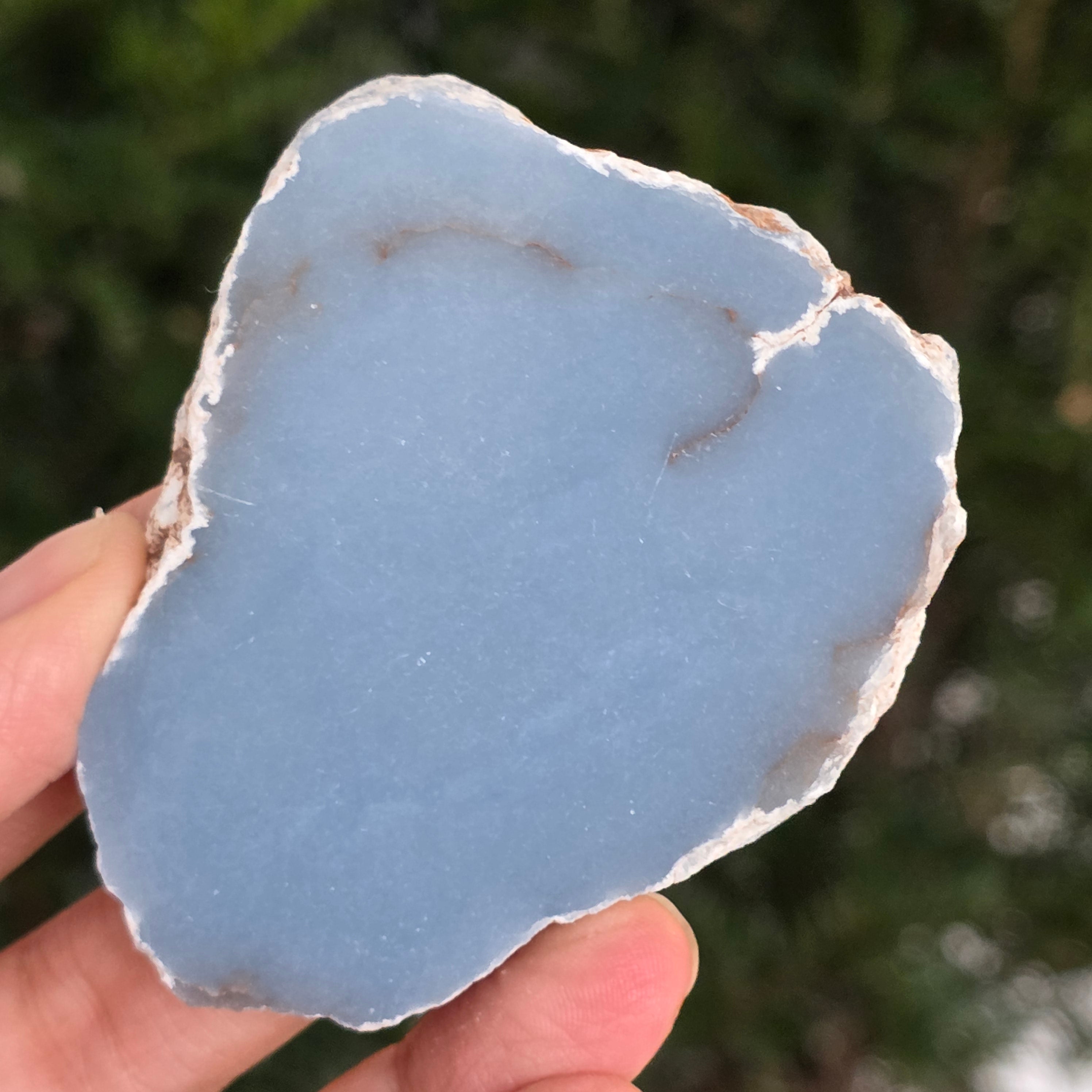 O piesă rară, ce pare desprinsă din seninul cerului. Această felie de angelit natural, dezvăluie un albastru delicat, lăptos, străbătut de nuanțe fine de gri și alb sidefat. Suprafața netedă și textura sa mată emană liniște și puritate – o bijuterie minerală a calmului și a echilibrului interior.