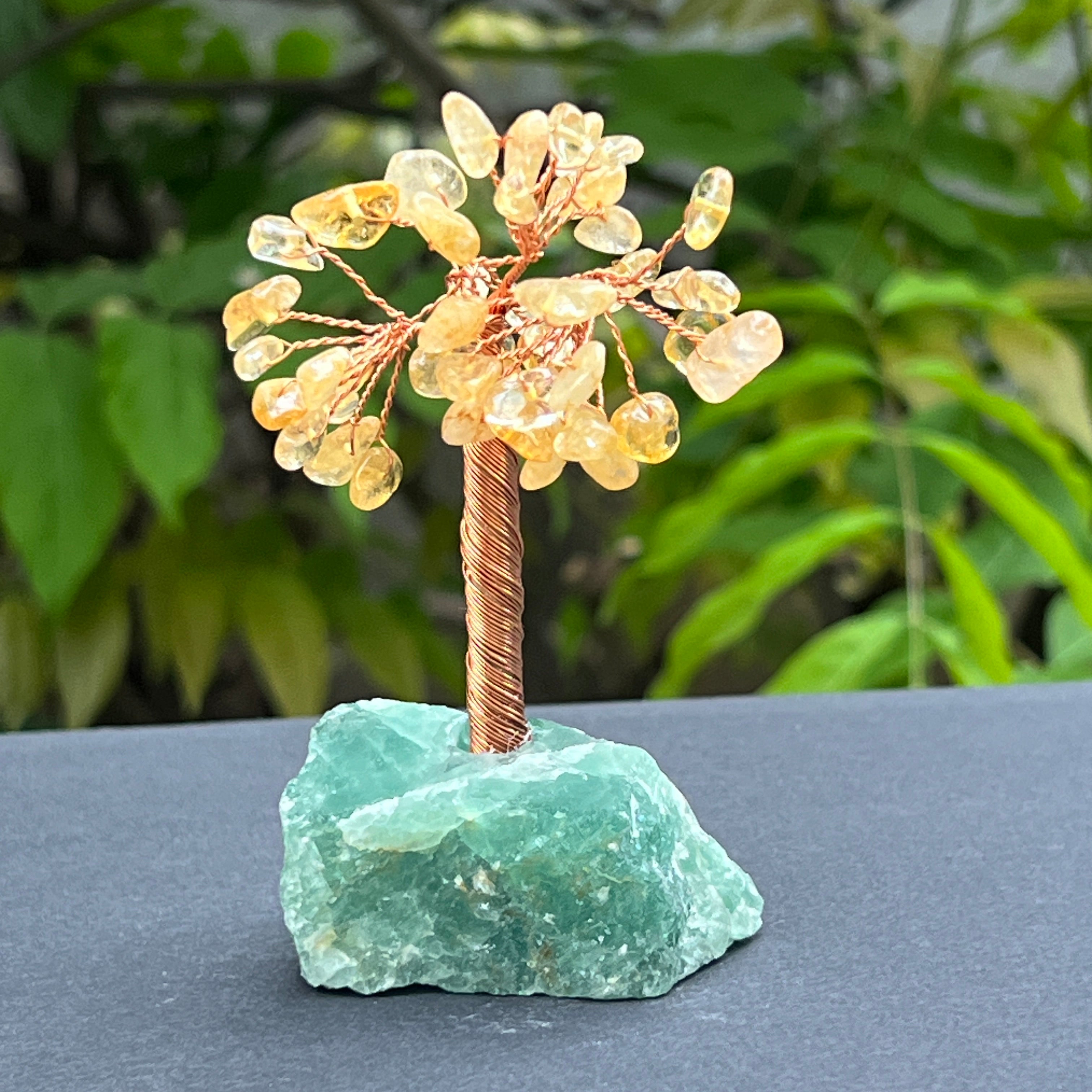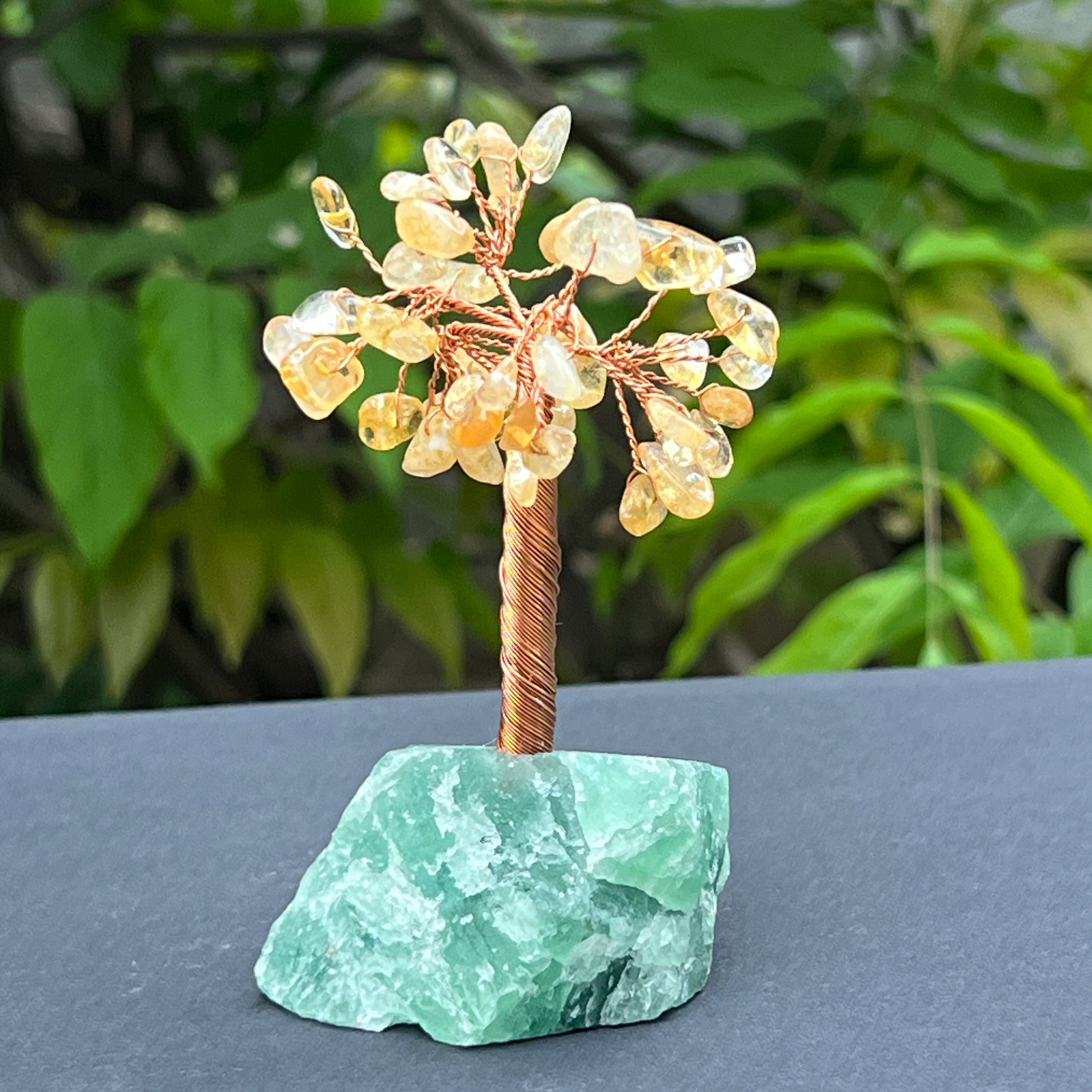 A symbol of solar energy, clarity and prosperity, this feng shui tree is manually made of natural crystals with uplifting vibrations. The leaves are from citrine, the stone of abundance, self -confidence and financial success. The base of raw fluorite It brings energy protection, mental balance and concentration capacity.