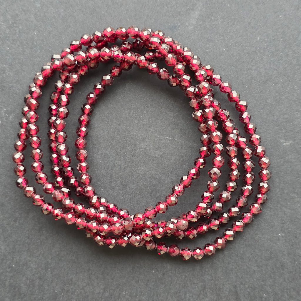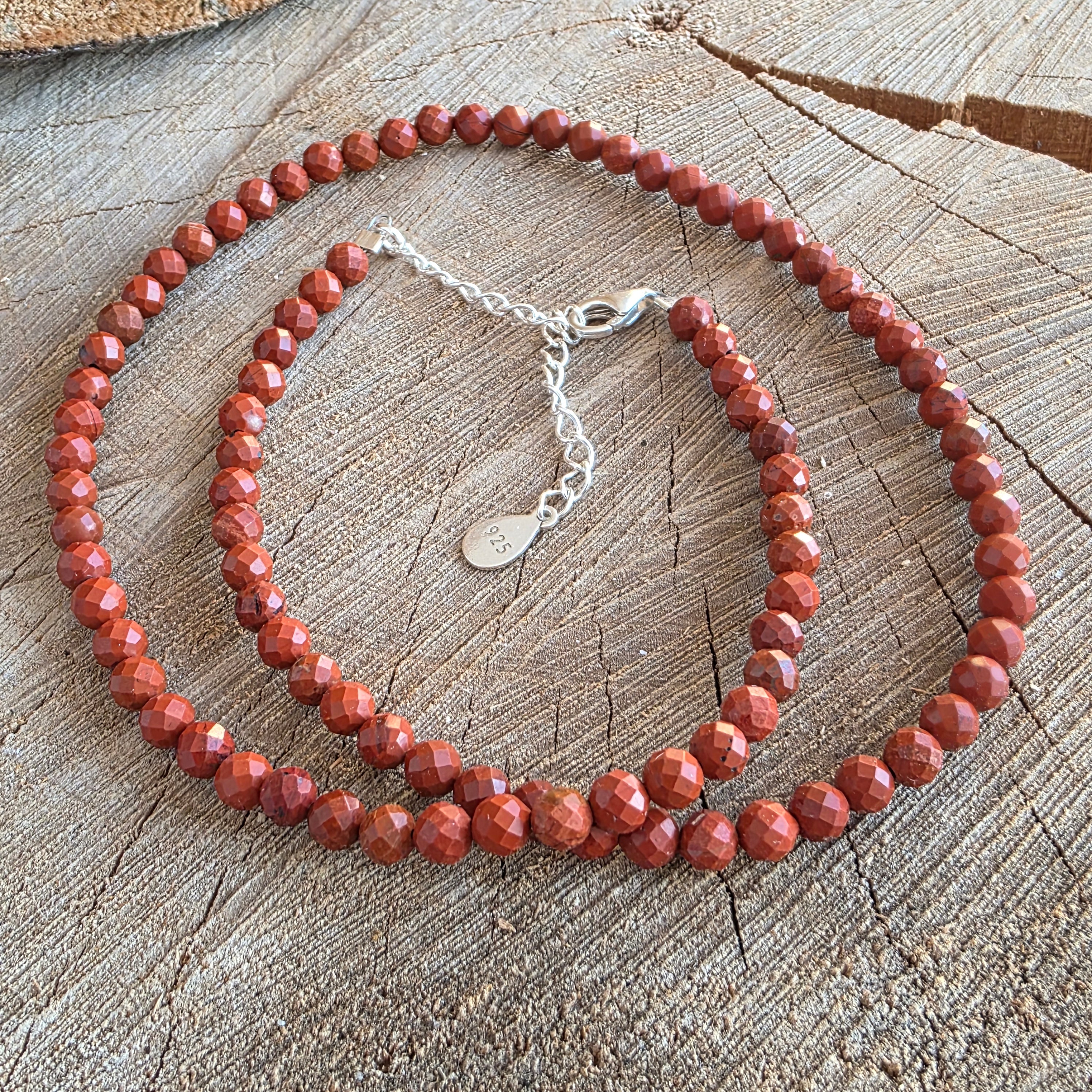 A necklace that carries in it the fire of life and the passion of the earth. Red jasper, known as the stone of vitality and courage, shines in fiery hues, and the delicate facets of the 4mm spheres let the light dance across their surface, amplifying the intensity of the color.
