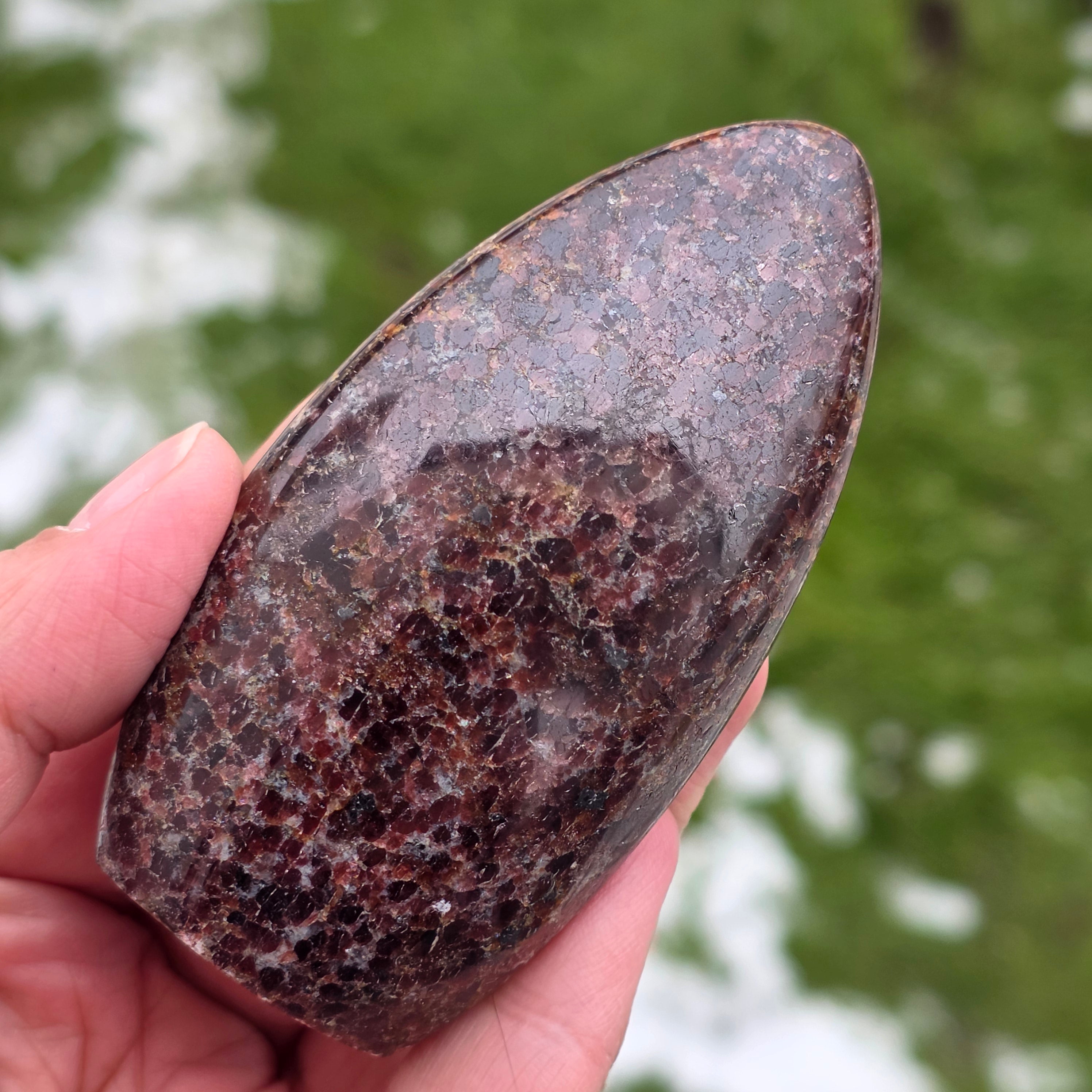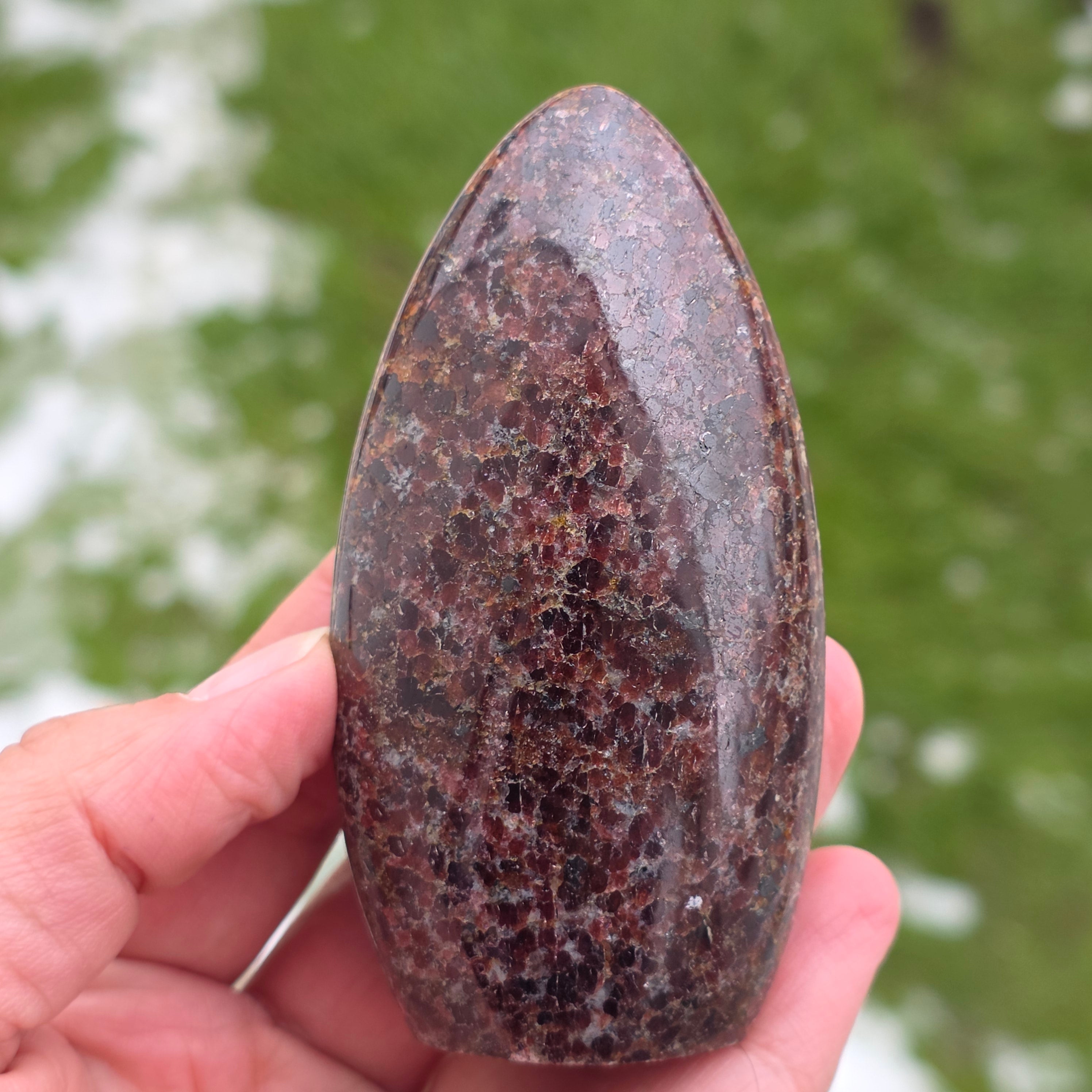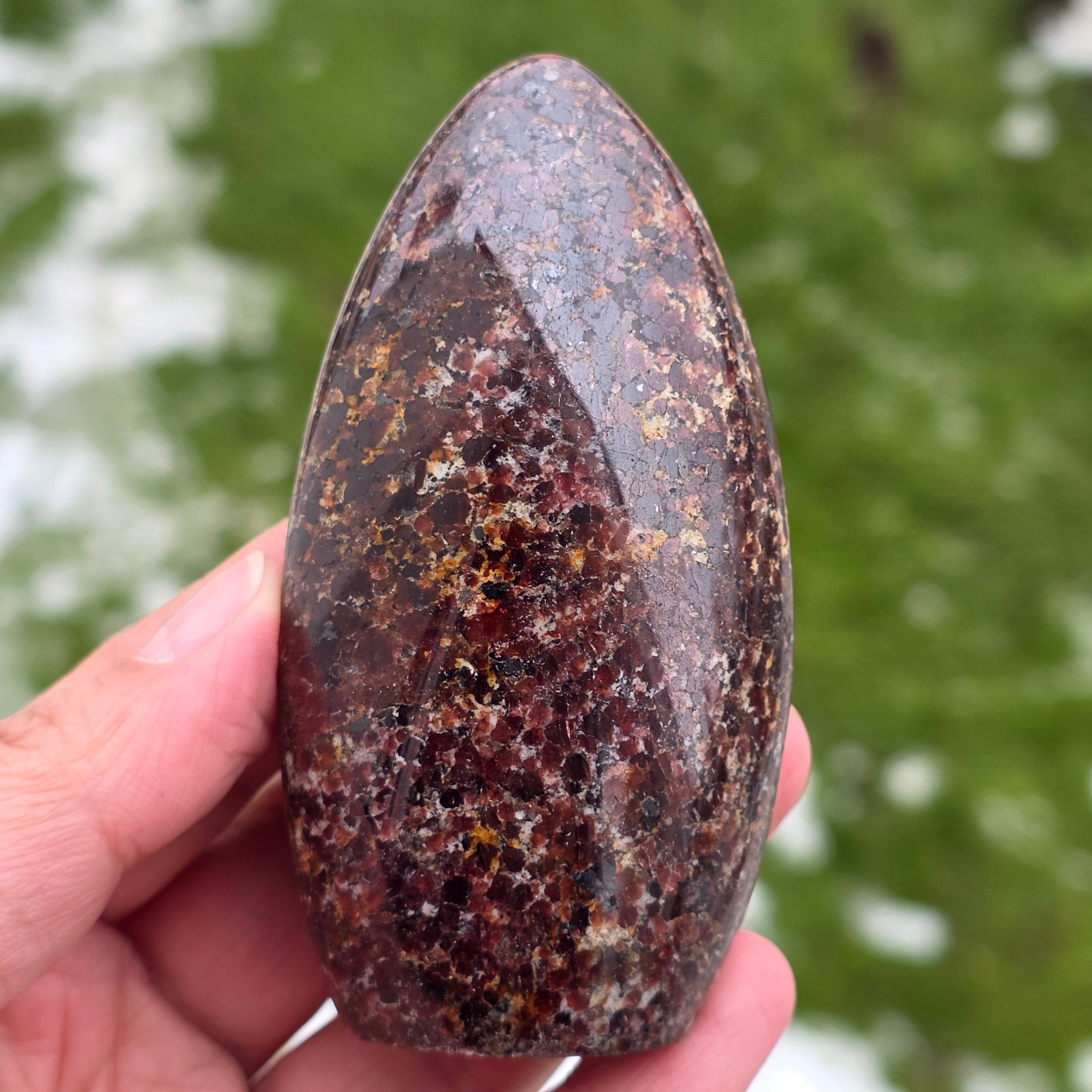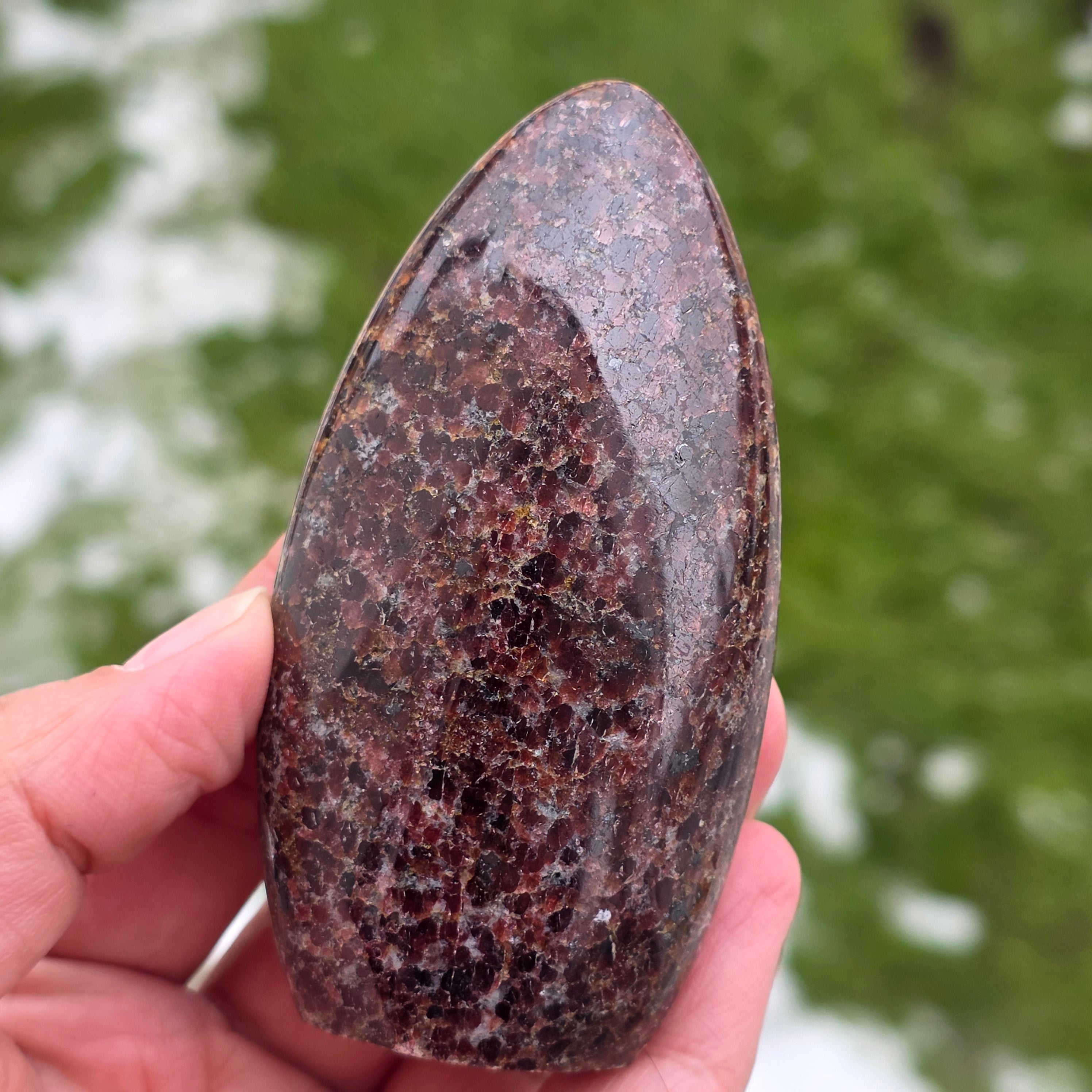 This piece of natural garnet from Madagascar, with a freeform structure, preserves the authentic character of the crystal, highlighting the balance between the polished surfaces and the natural areas. It is a piece suitable for collection, meditation spaces, or the office, having a strong and stabilizing presence. Garnet is associated with vitality, grounding, and inner strength, often chosen to support energy during periods of effort, transformation, and reconnection with one’s own power. The freeform shape allows a natural expression of energy, giving this piece a unique and authentic character. Garnet is also considered a stone of passion and sexual energy and is often worn to boost energy and vitality levels.