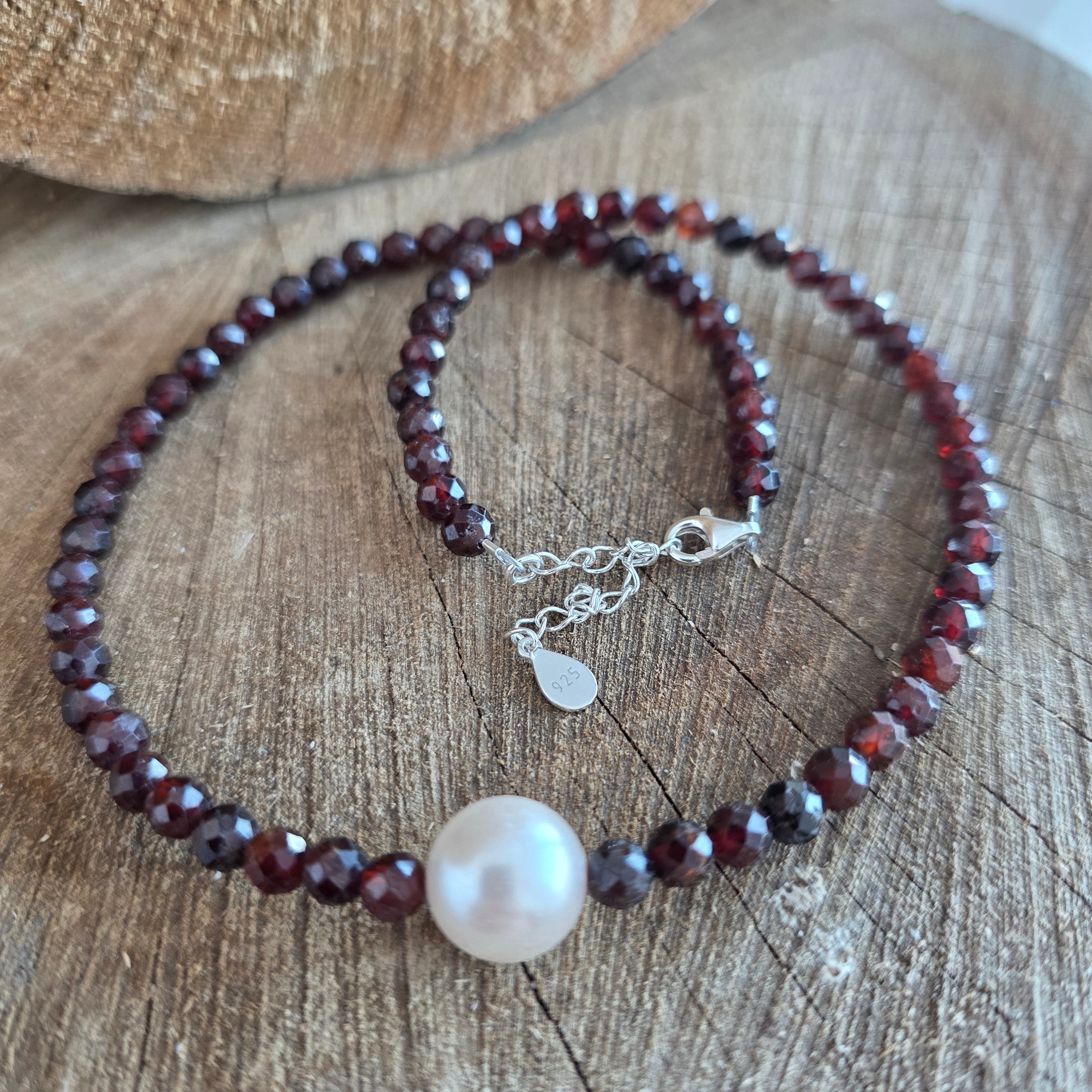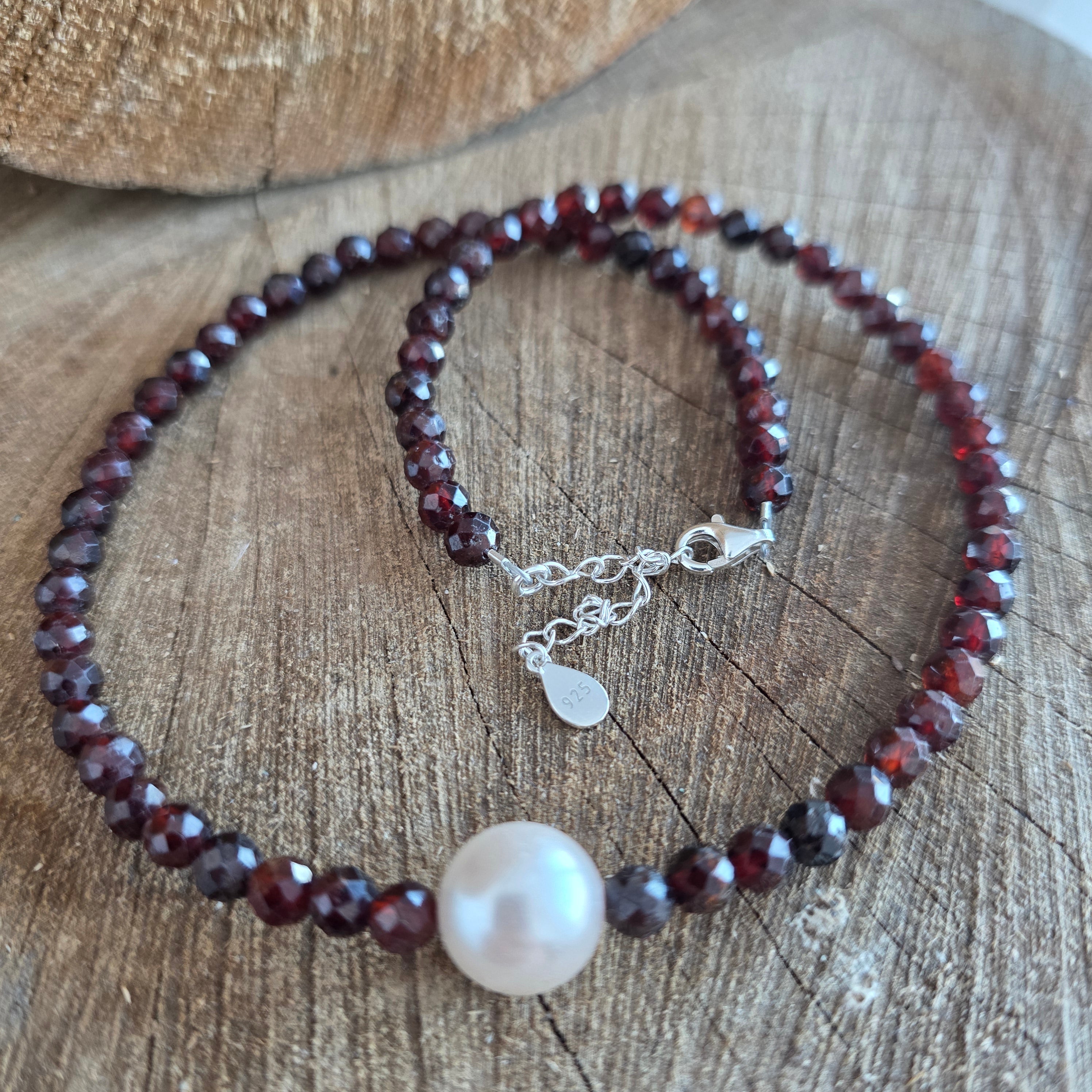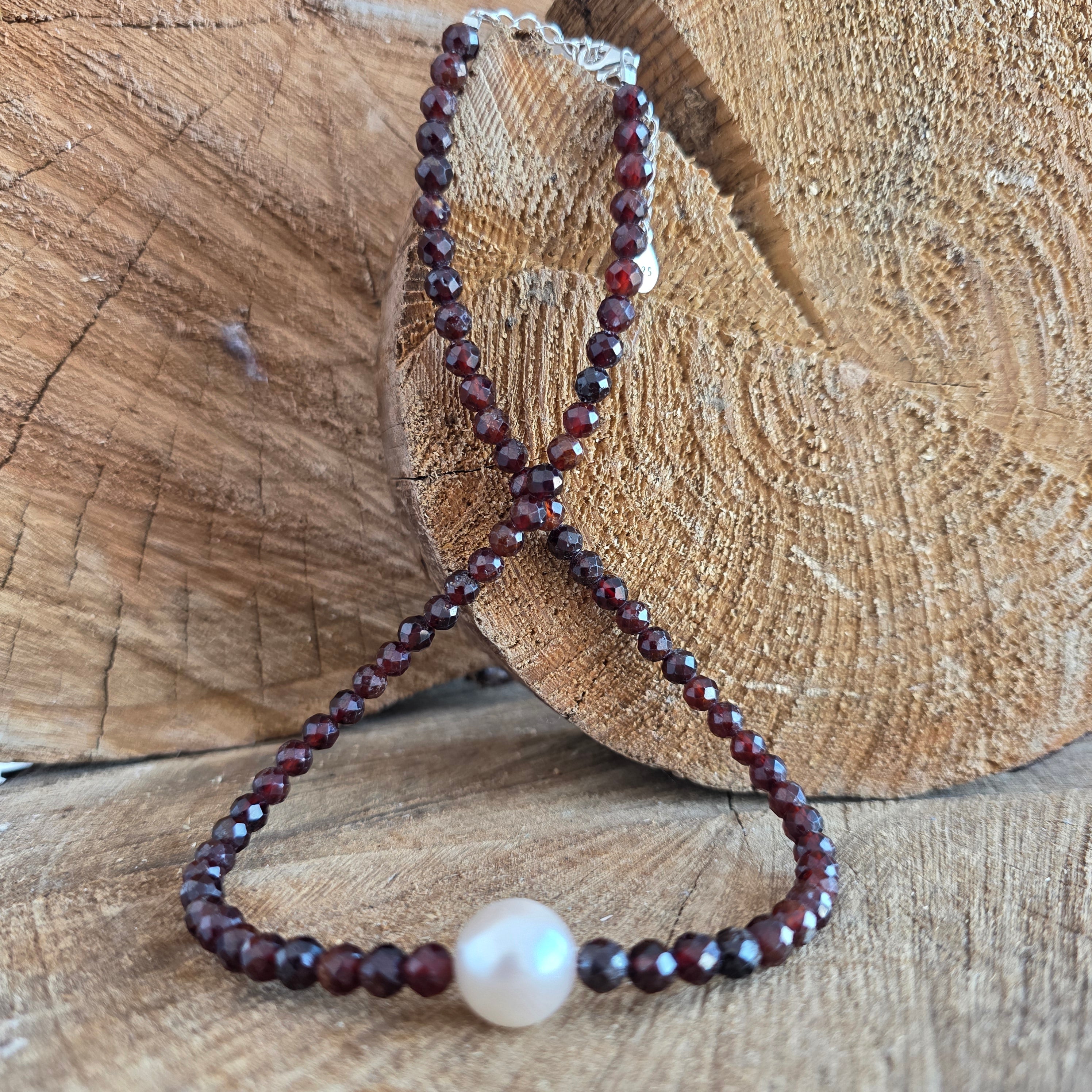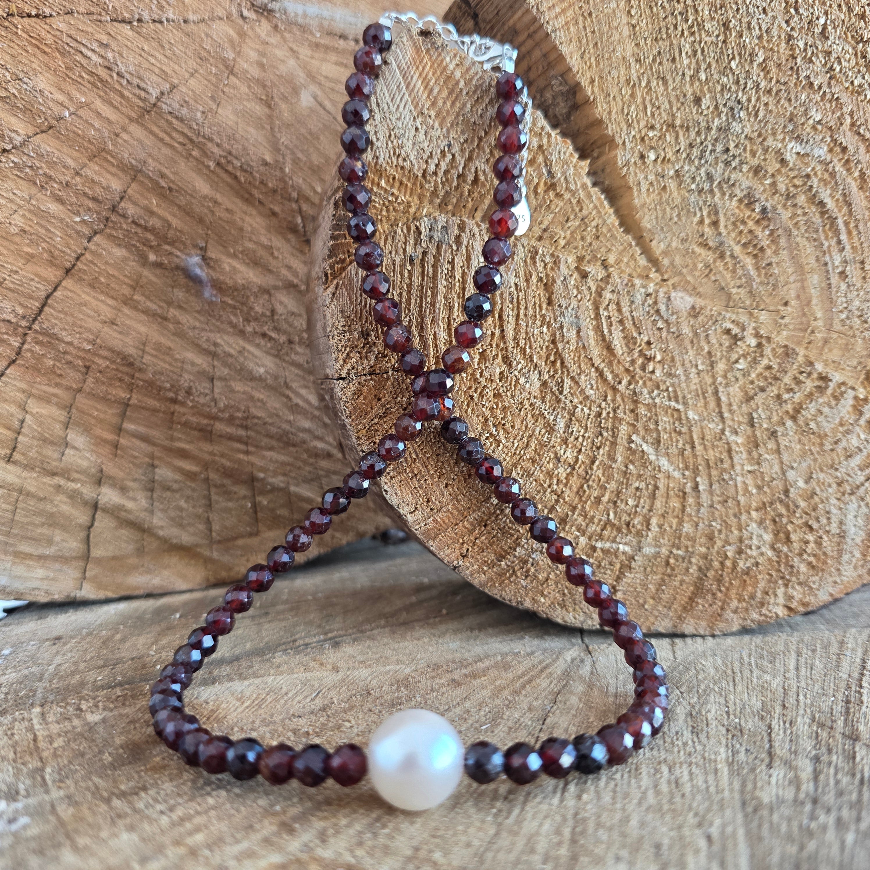 Materials: Natural dark burgundy garnet, 4 mm beads, 925 silver, 1 cm pearl