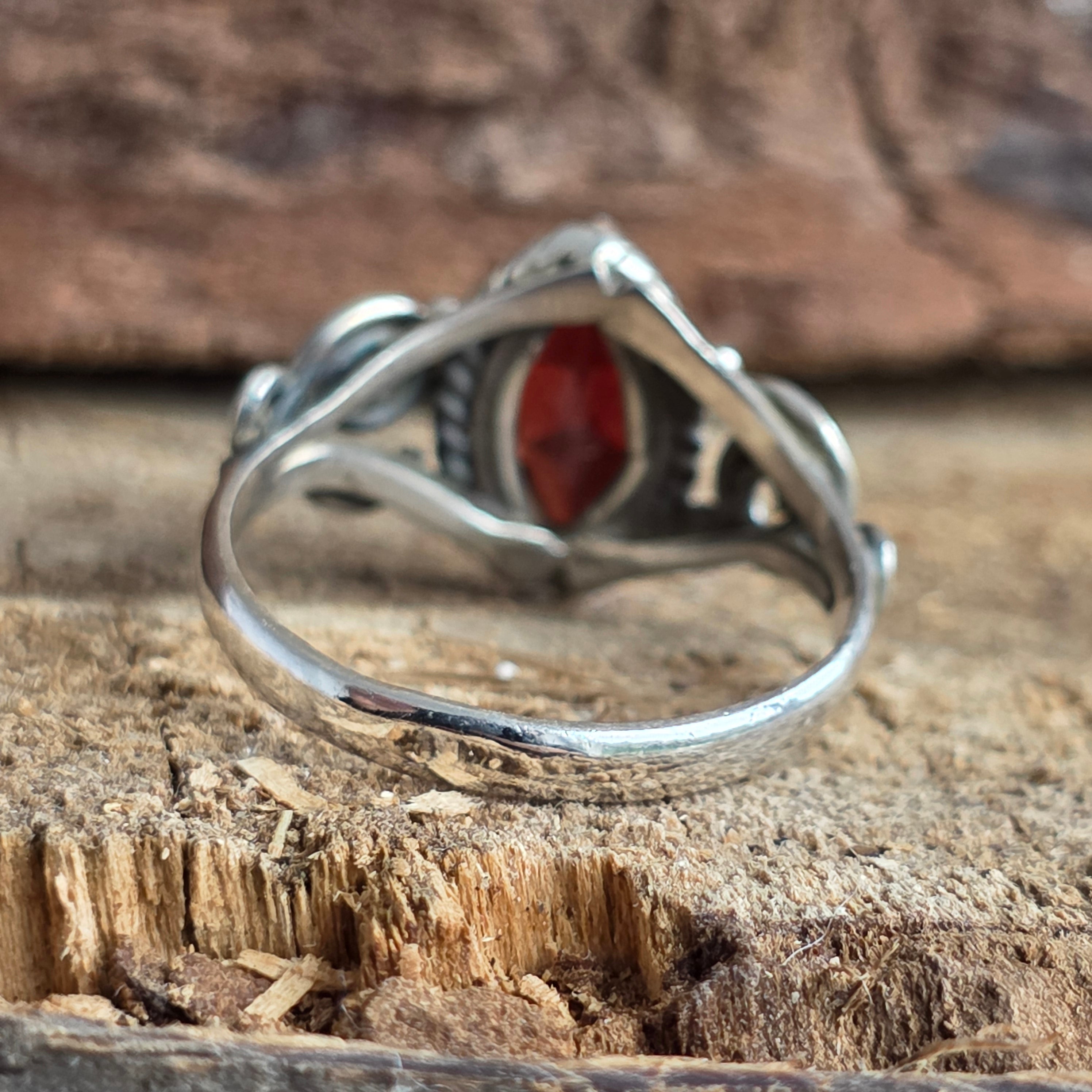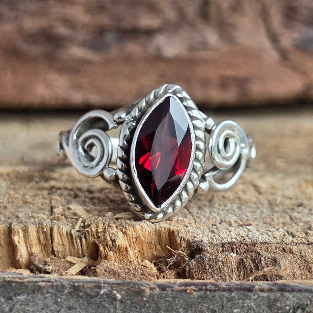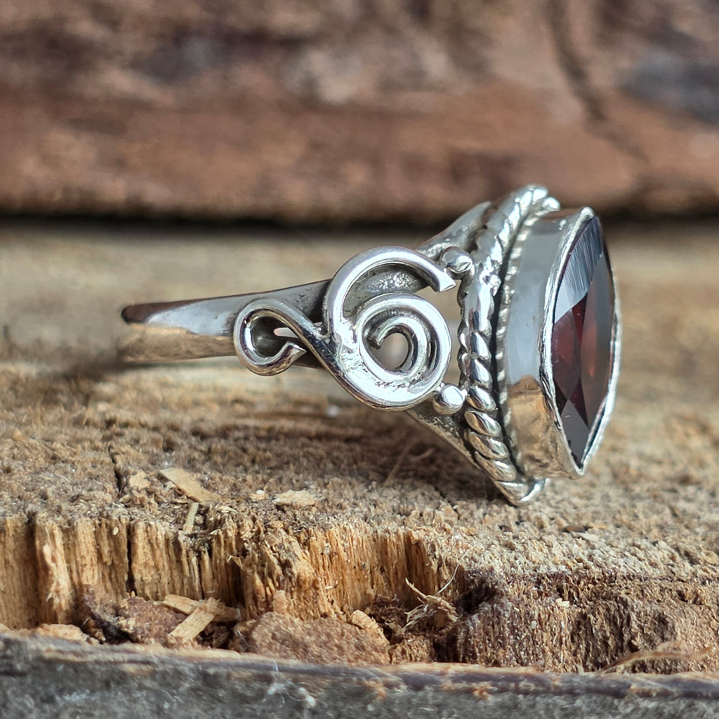A ring that bears the imprint of time - handmade from 925 silver, with details in twisted thread and fine spirals framing the intensity natural garnet.