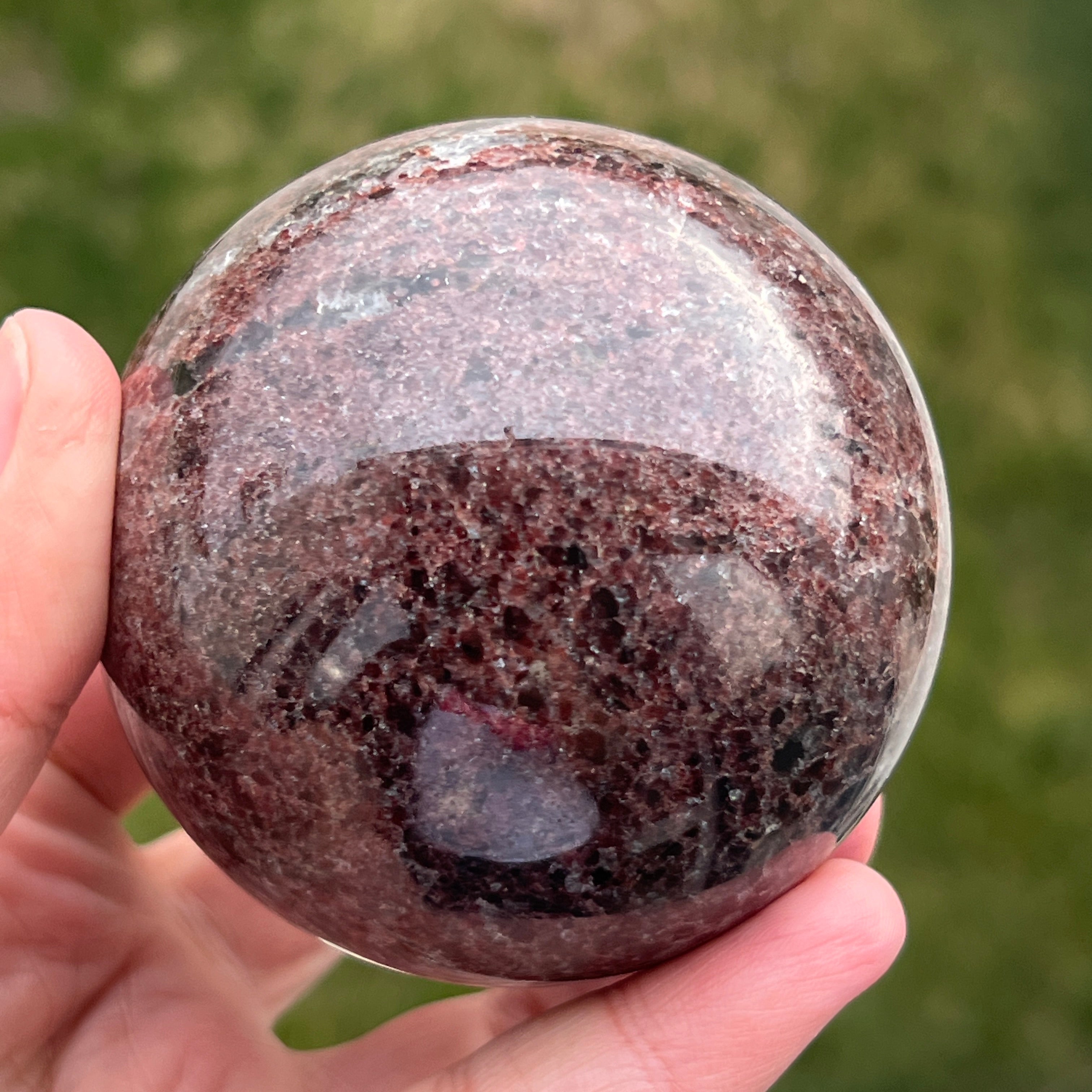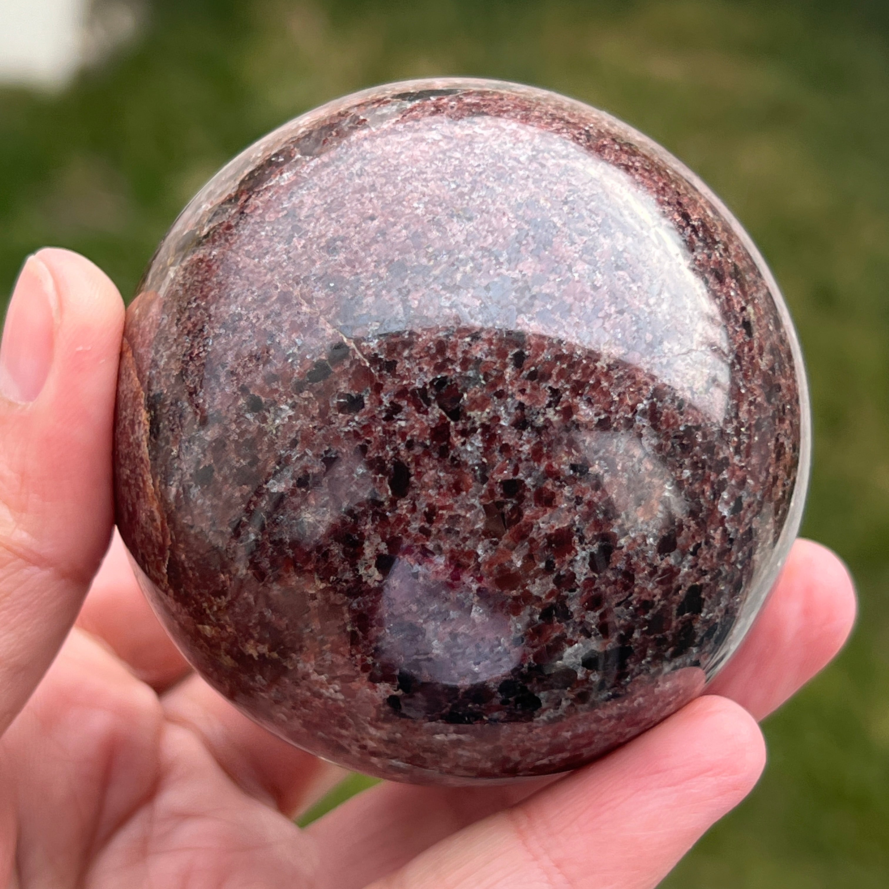 The garnet sphere is made from a mineral from the silicate group, known for its compact crystalline structure and for its intense shades, ranging from dark red to deep burgundy tones. Due to its composition, garnet is a hard and stable material, which makes it suitable for crafting into shapes like a sphere, where the texture and color can be observed evenly from all angles.