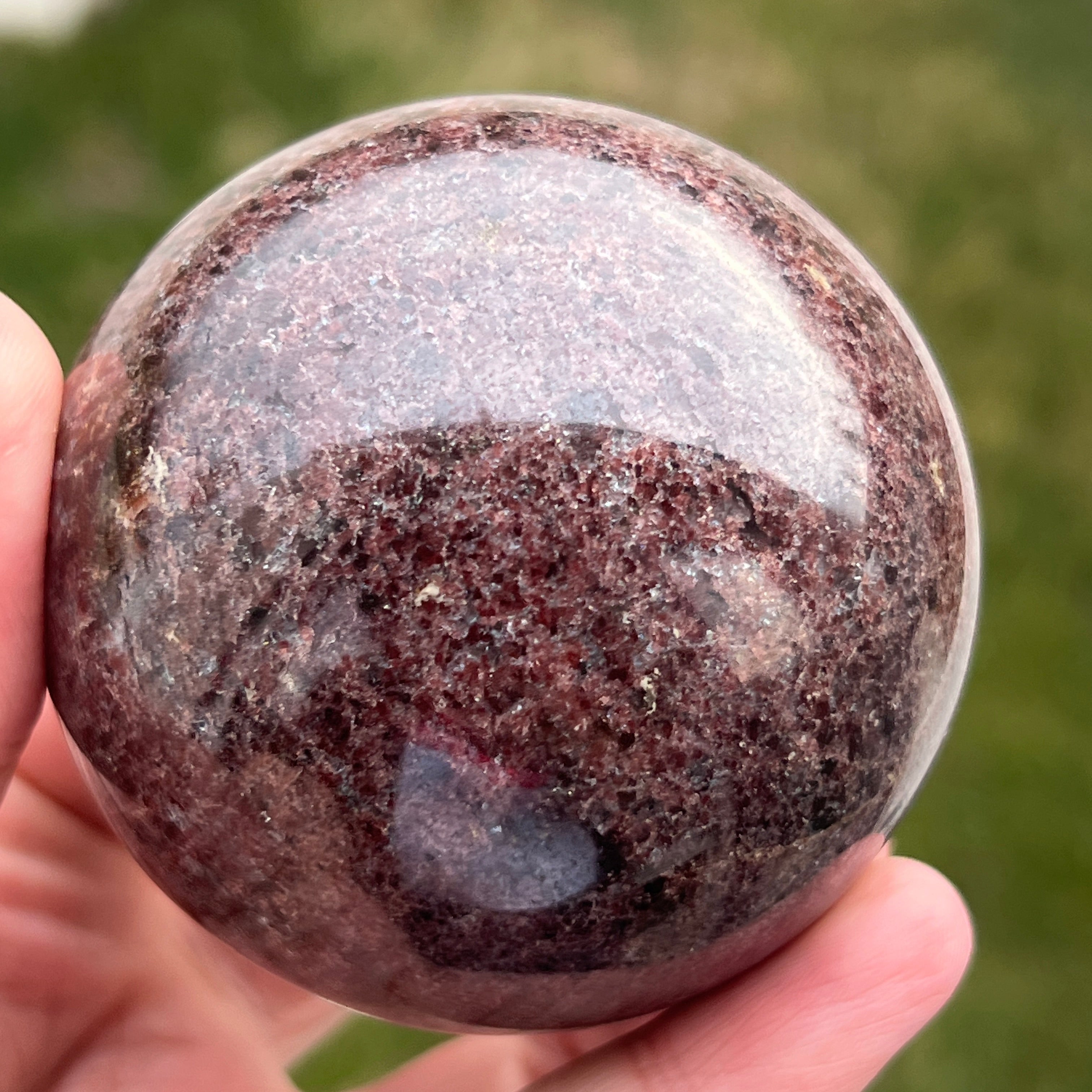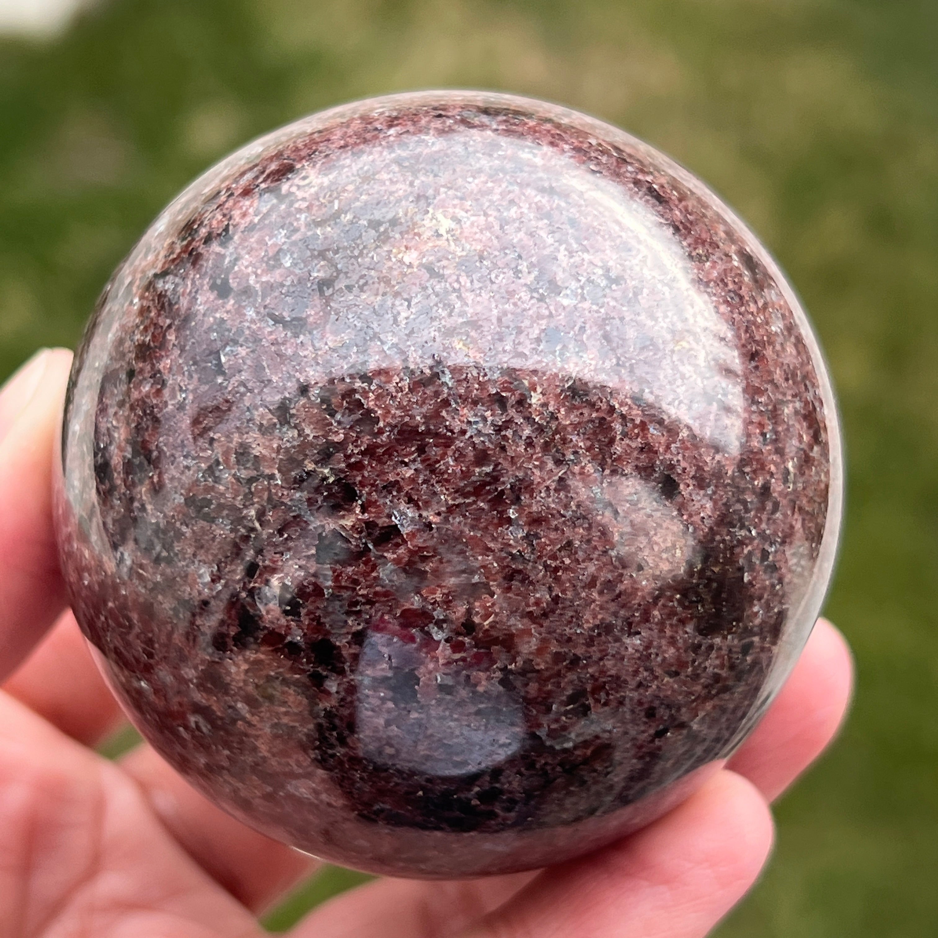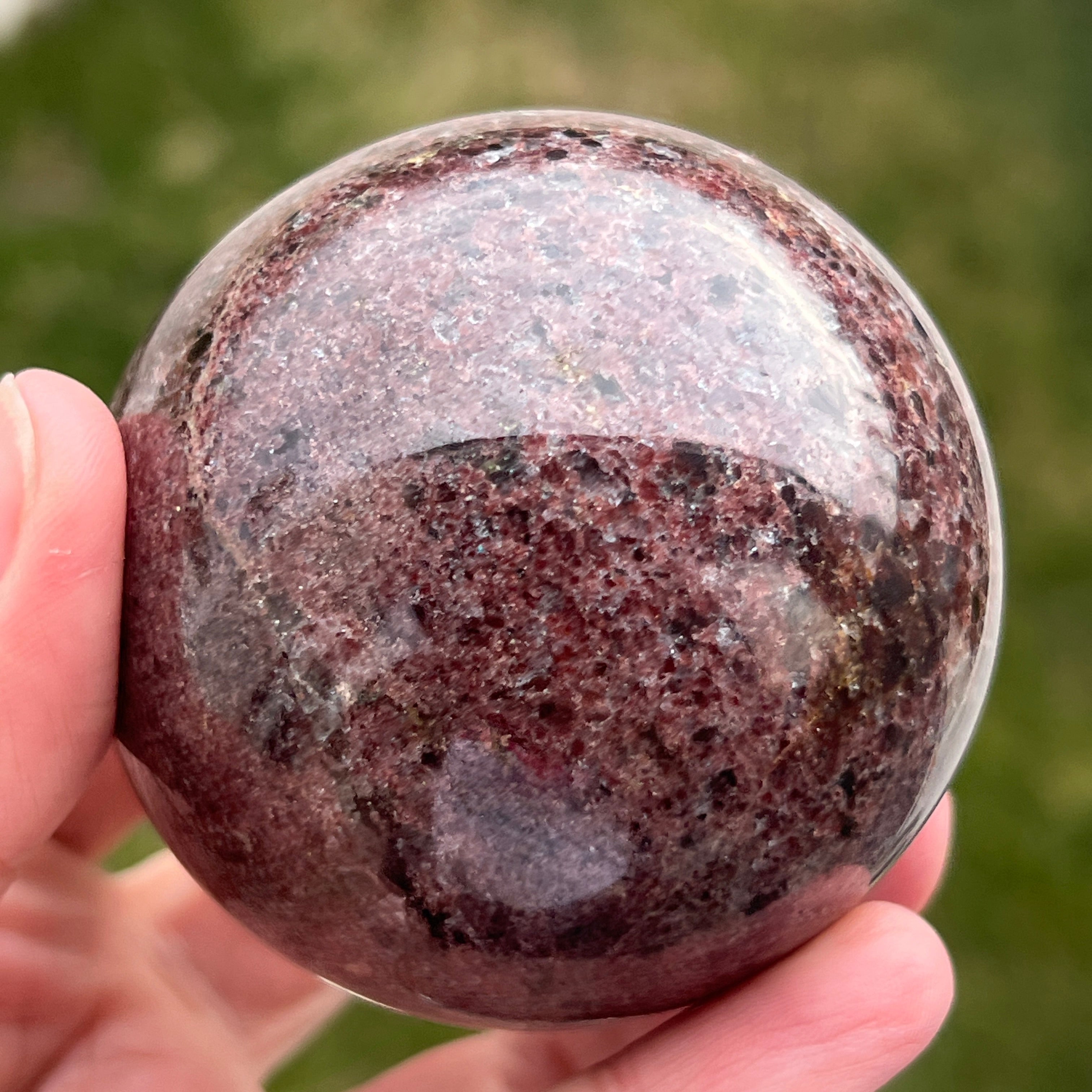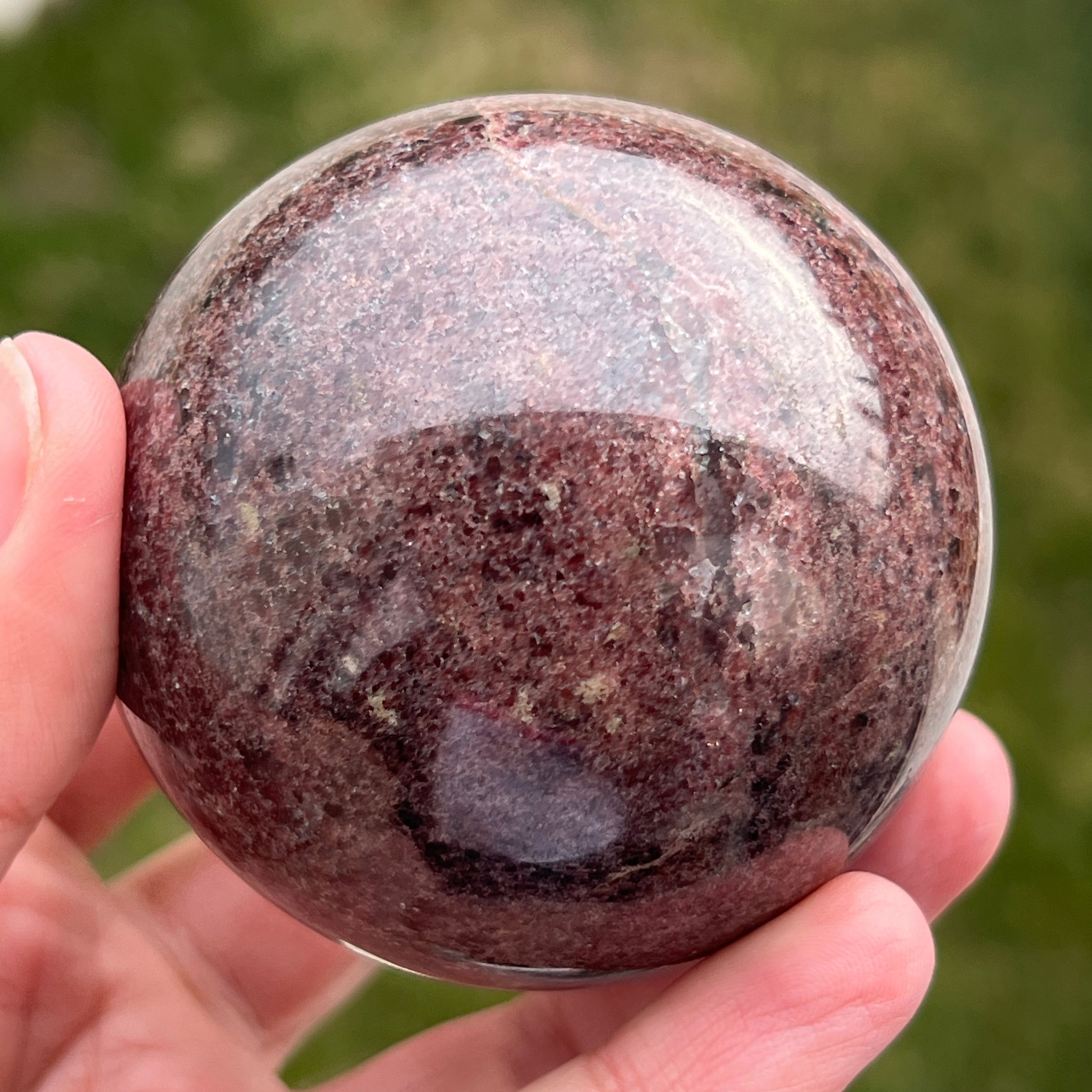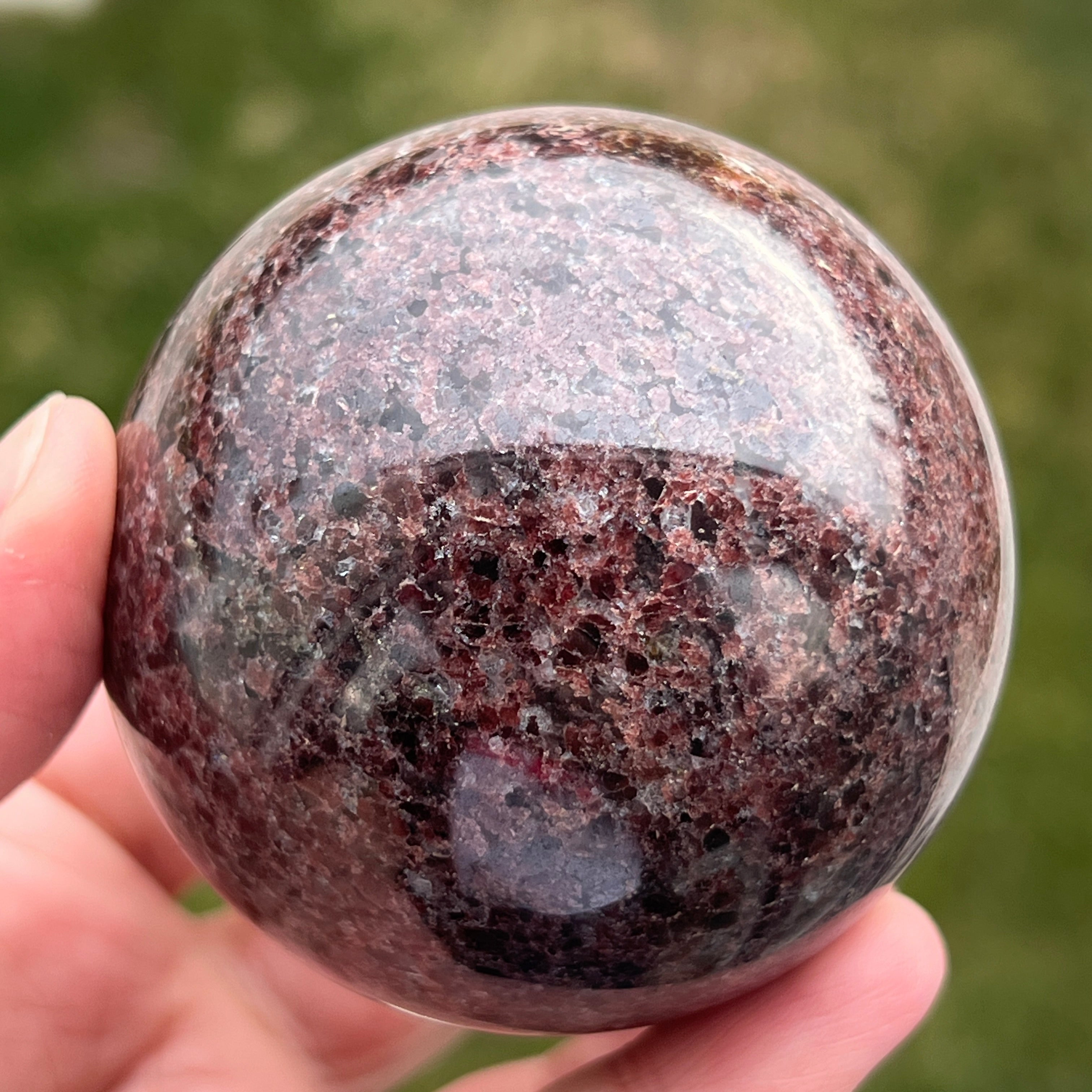 The garnet sphere is made from a mineral in the silicate group, known for its compact crystalline structure and for its intense shades, ranging from dark red to deep burgundy tones. Due to its composition, garnet is a hard and stable material, which makes it suitable for shaping into forms such as a sphere, where the texture and color can be observed evenly from all angles.
