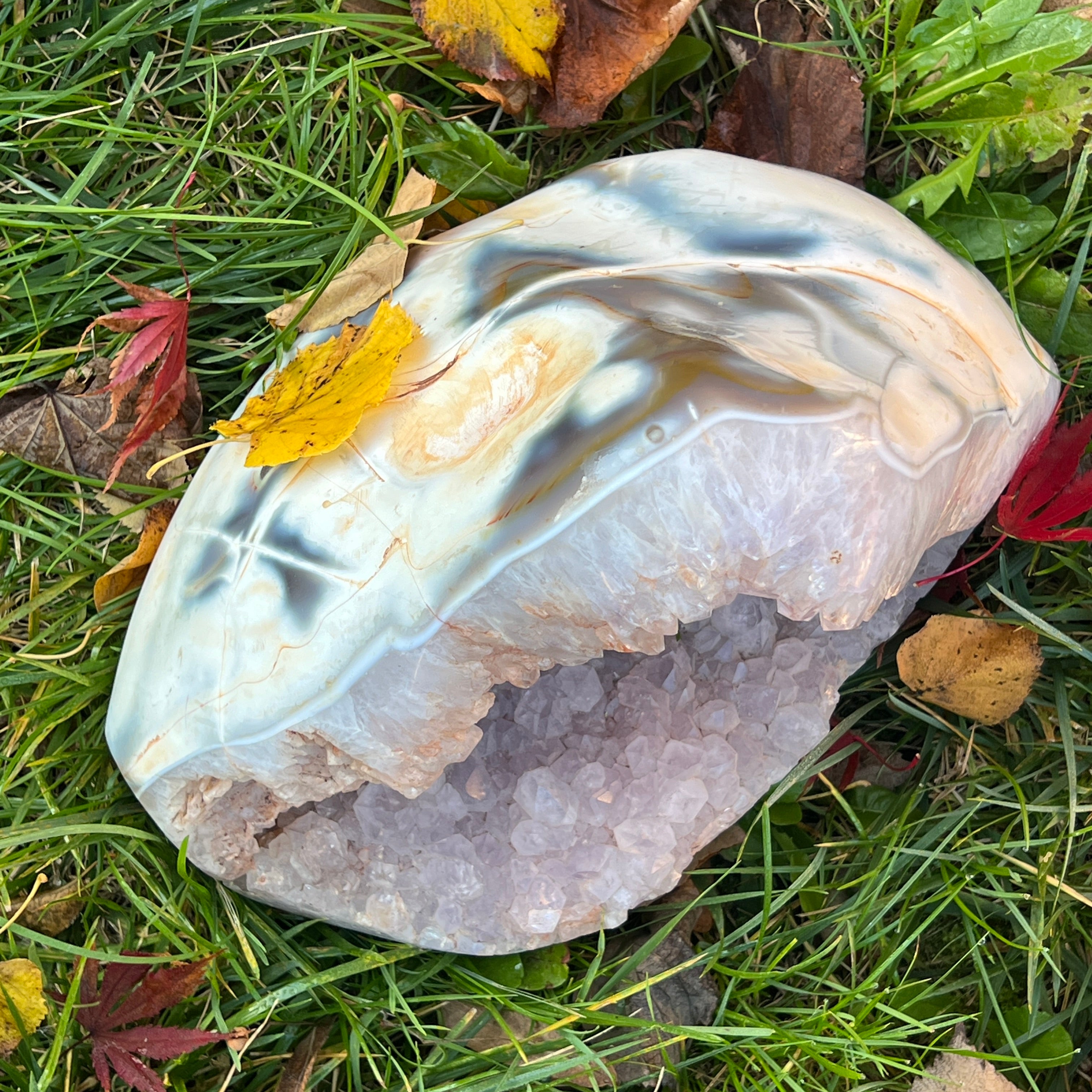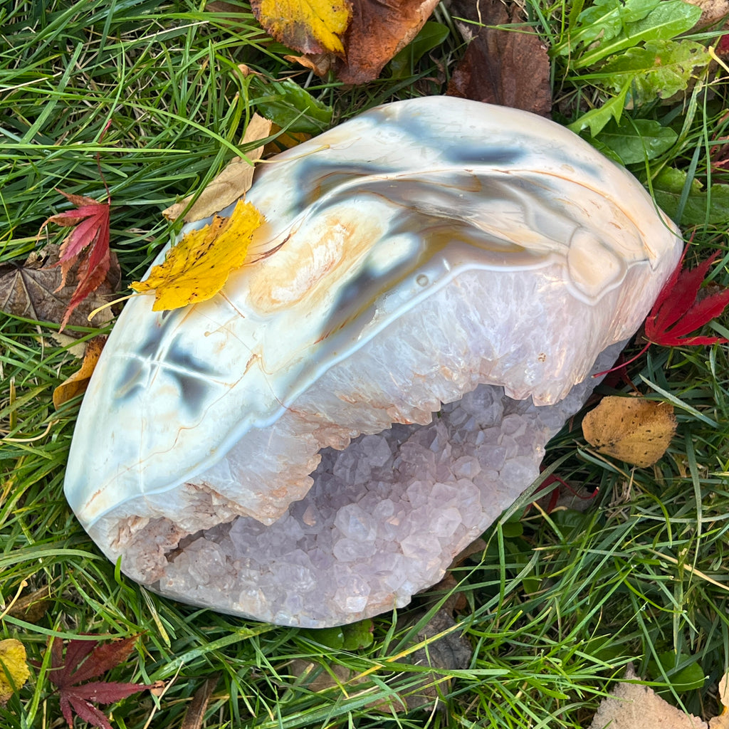 Această geodă naturală de agat cu cristale de ametist este o operă a naturii născută din răbdarea timpului. În straturile sale concentrice de agat se deschide un sanctuar violet, în care ametistul a cristalizat în forme delicate, ca niște petale înflorite în adâncul pământului.